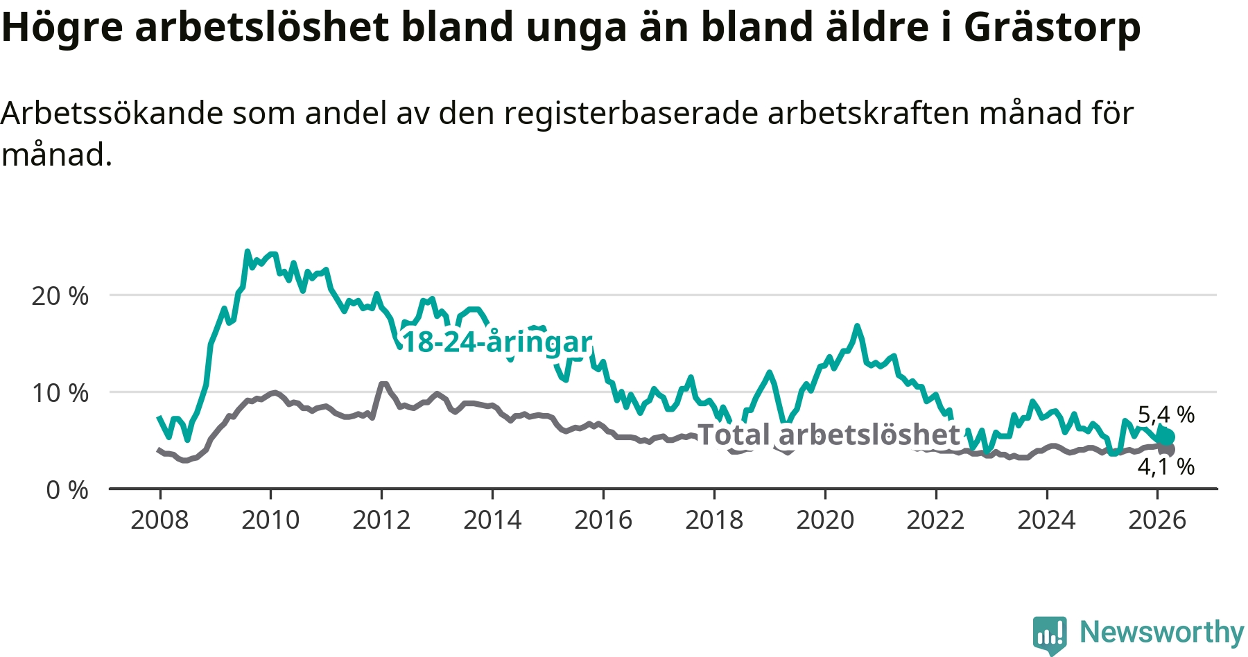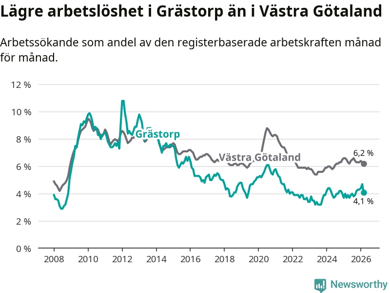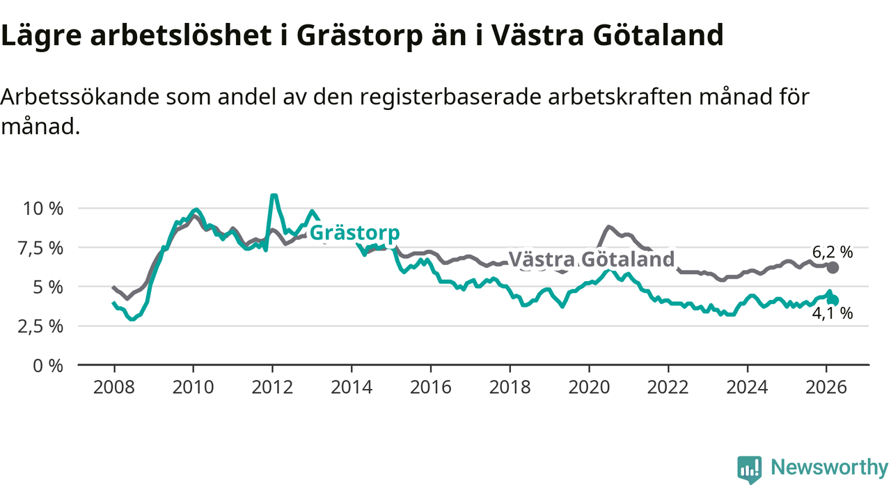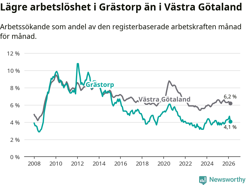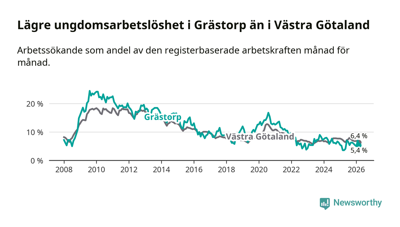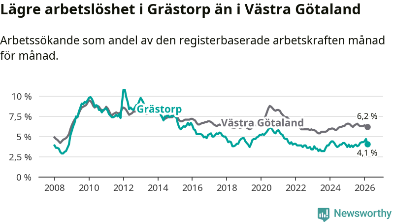 Medan arbetslösheten bland utlandsfödda alltså ökar i Grästorp så minskar den i Västra Götaland. Jämfört med mars förra året har andelen arbetslösa utlandsfödda i länet minskat med 1,2 procentenheter (till 13,2 procent). Trots den senaste uppgången har Grästorp med andra ord fortfarande lägre arbetslöshet bland utlandsfödda än Västra Götaland.