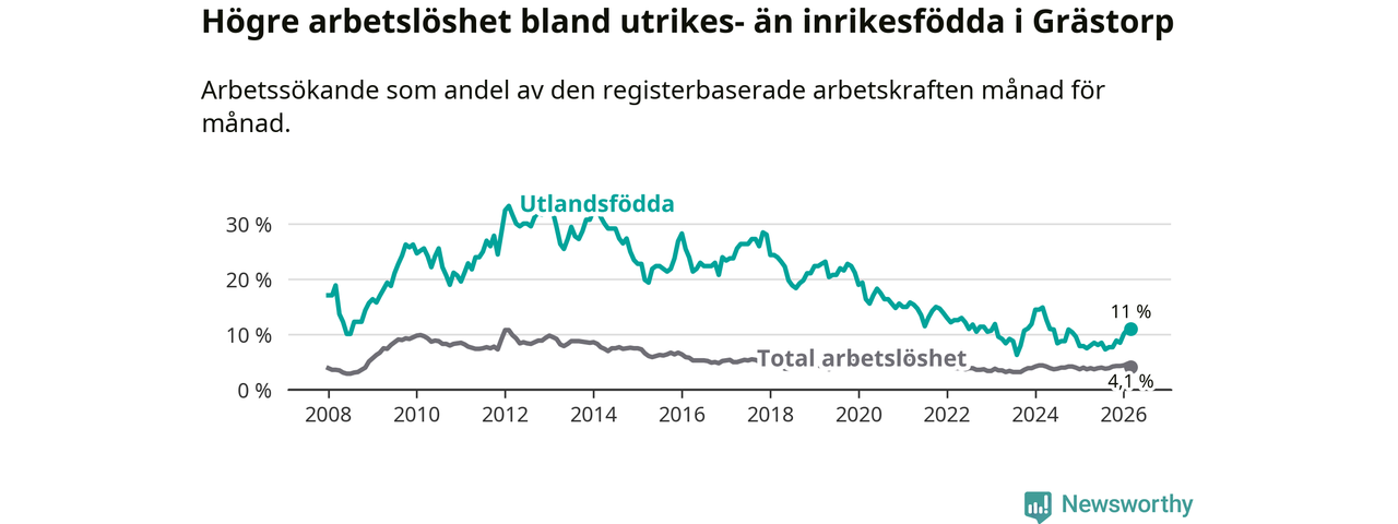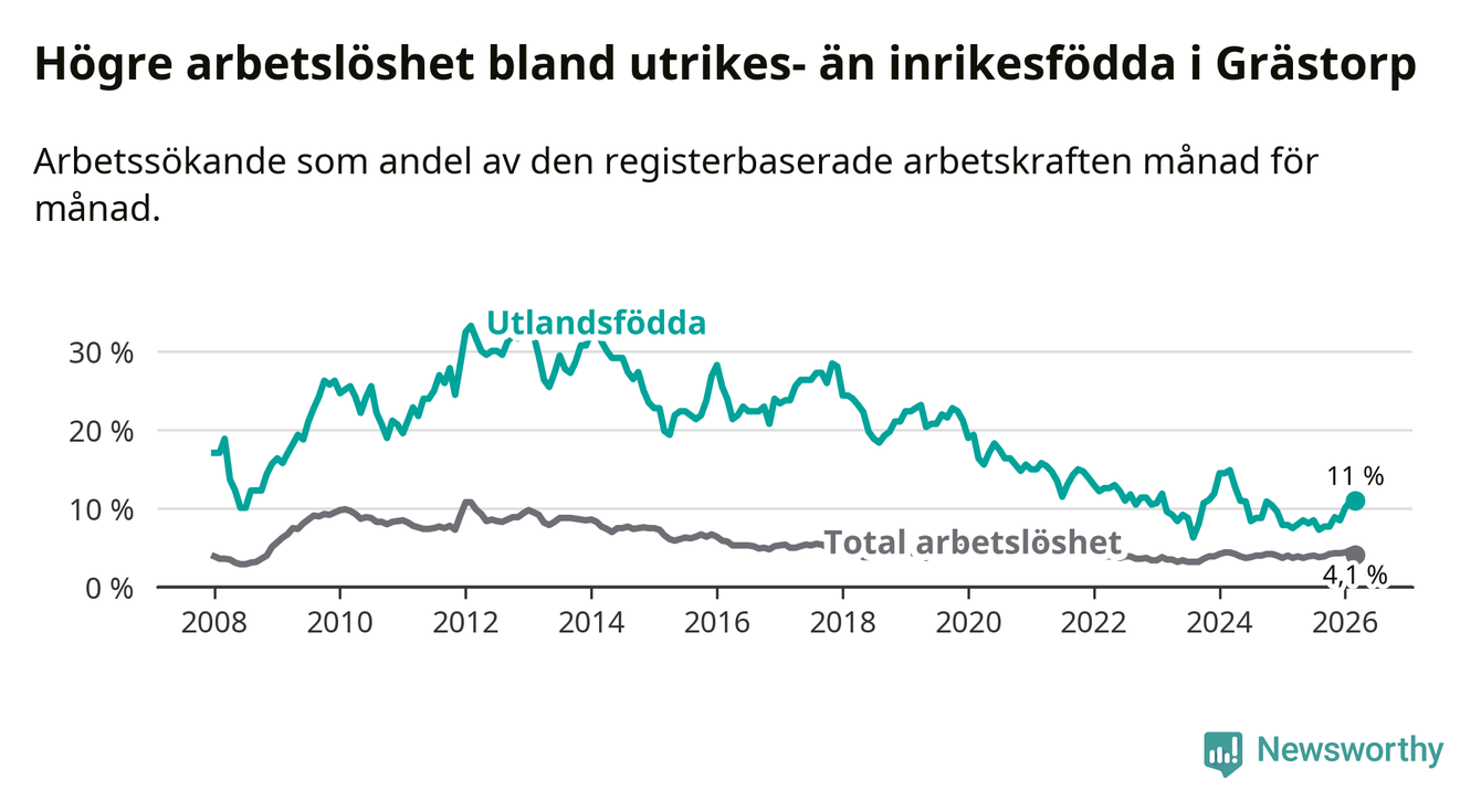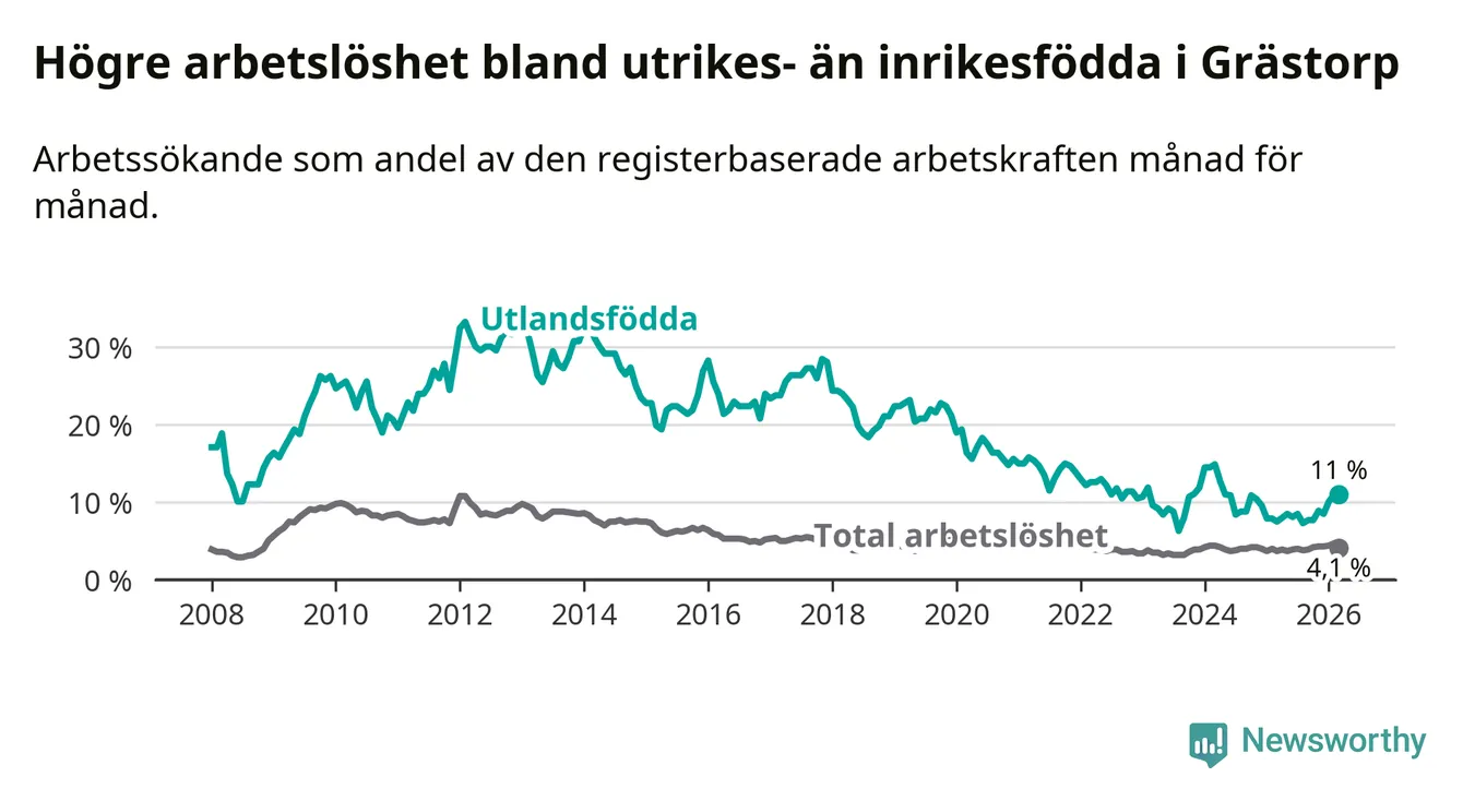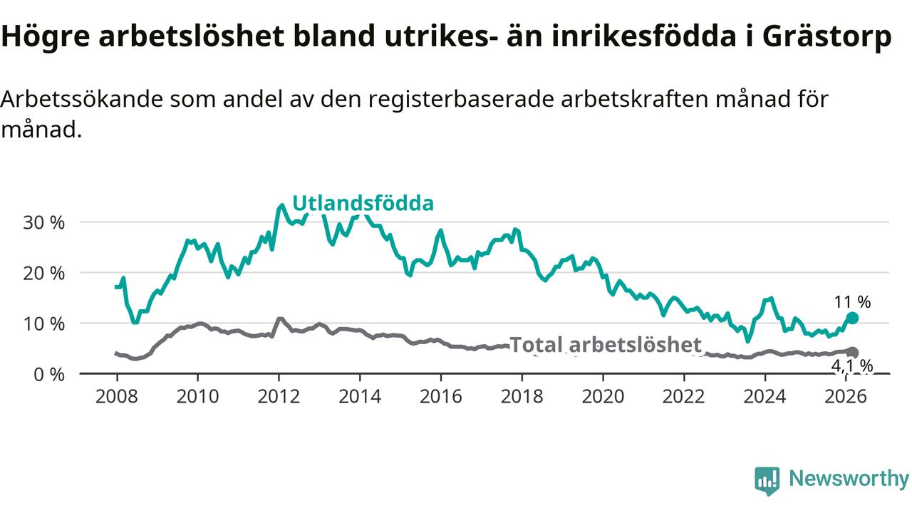 Arbetslösheten bland utlandsfödda var 11,0 procent i Grästorp under mars månad, motsvarande 26 av 236 personer. Det är 3,5 procentenheter fler än vid samma tidpunkt i fjol (+8 om man räknar personer).