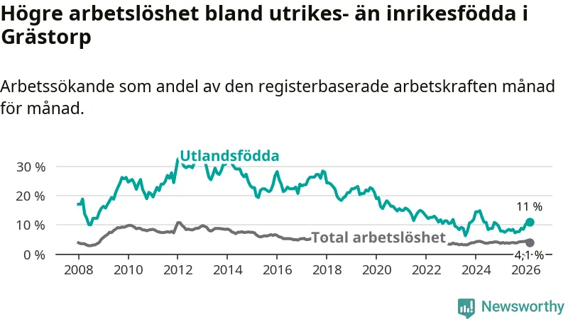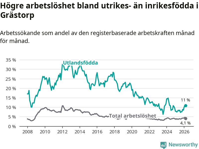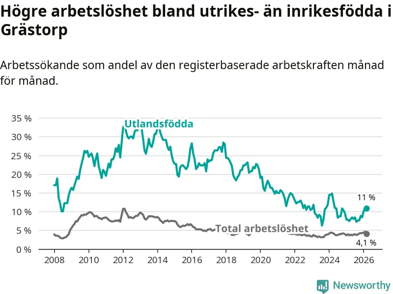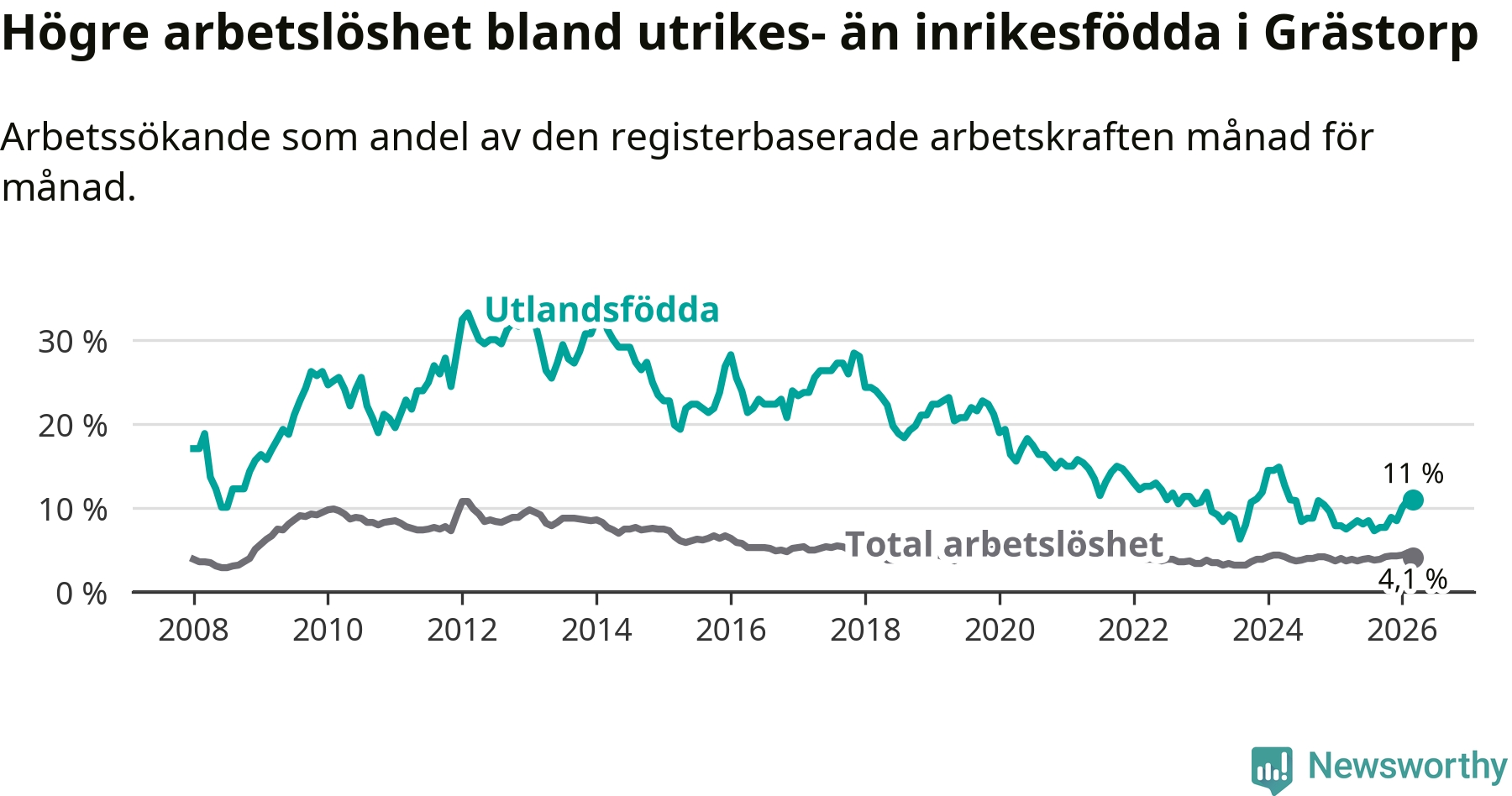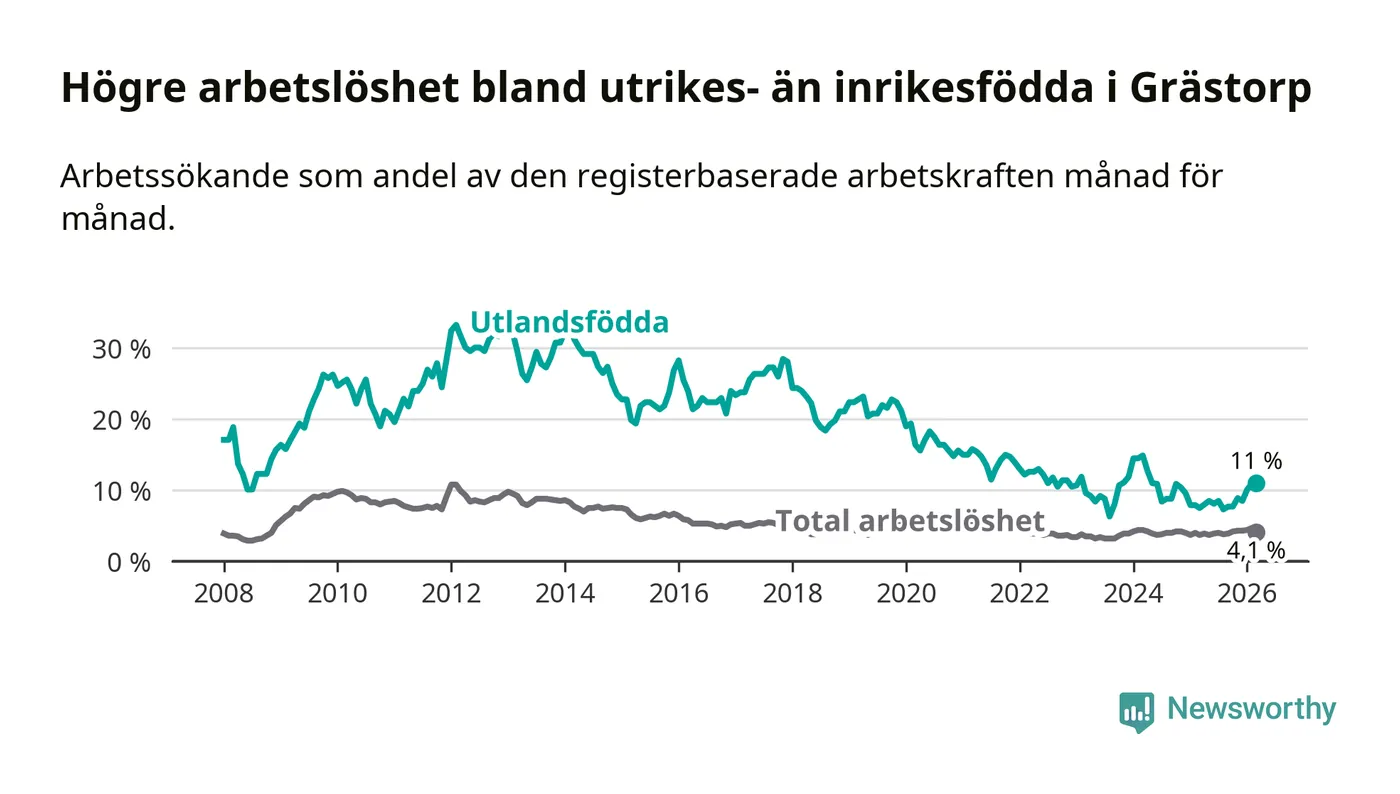 Arbetslösheten bland utlandsfödda var 11,0 procent i Grästorp under mars månad, motsvarande 26 av 236 personer. Det är 3,5 procentenheter fler än vid samma tidpunkt i fjol (+8 om man räknar personer).