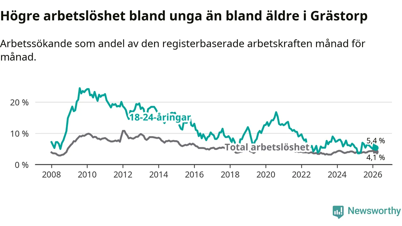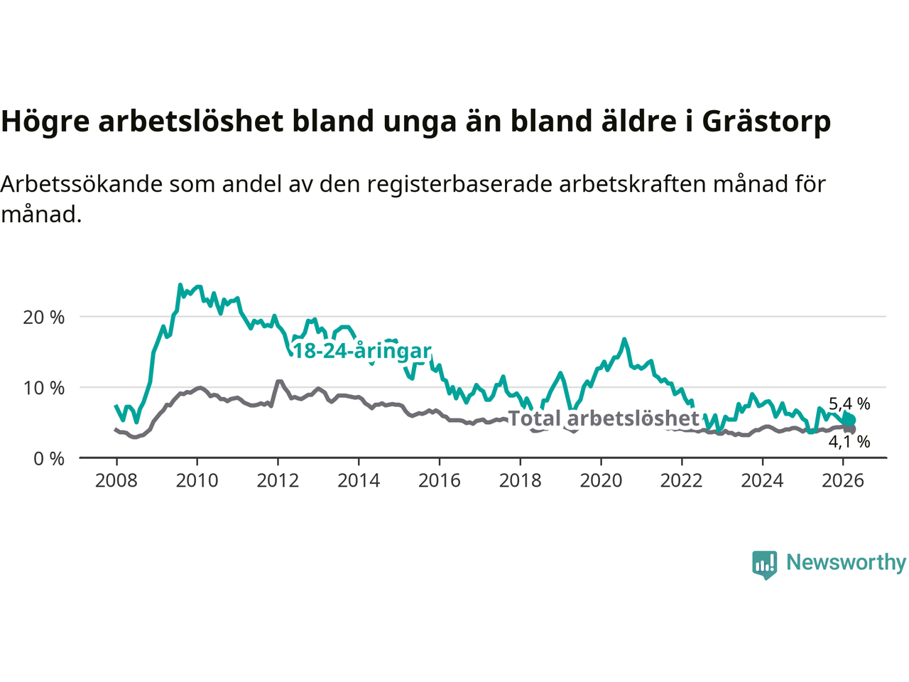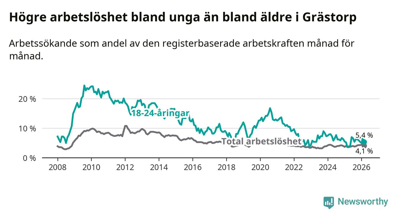 Under mars månad rapporterade Grästorps kommun en total arbetslöshet på 4,1 procent. Det är en ökning jämfört med samma tidpunkt i fjol (+0,4 procentenheter). I Västra Götalands län däremot sjunker arbetslösheten .