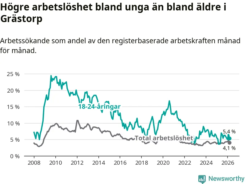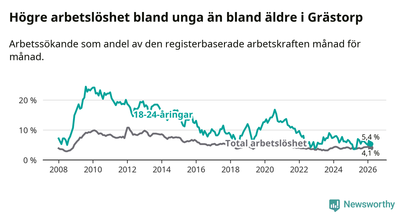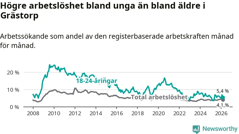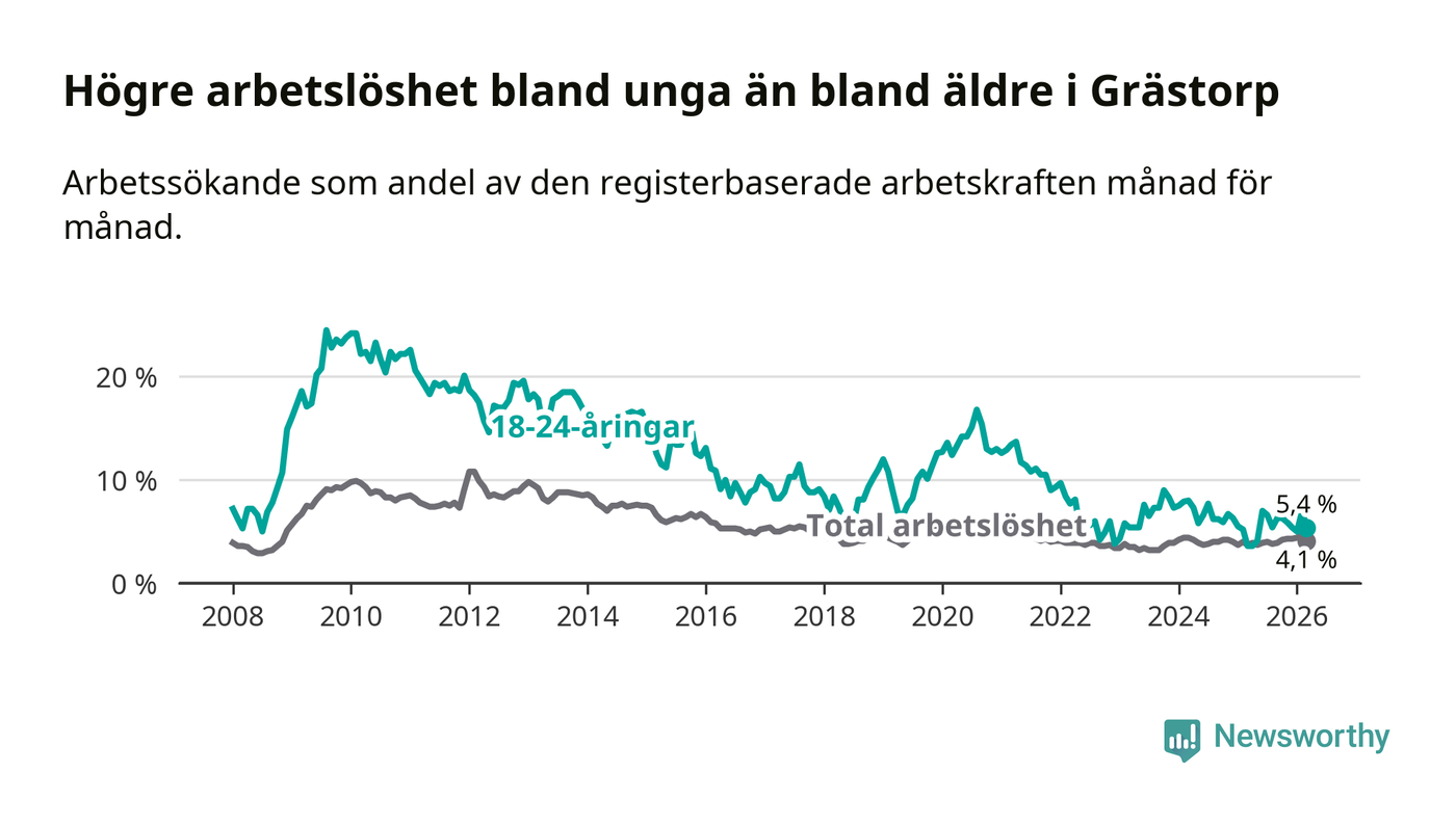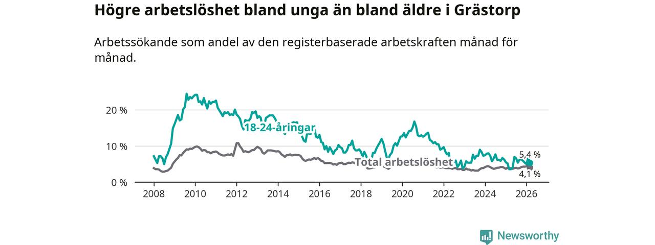 Under mars månad rapporterade Grästorps kommun en total arbetslöshet på 4,1 procent. Det är en ökning jämfört med samma tidpunkt i fjol (+0,4 procentenheter). I Västra Götalands län däremot sjunker arbetslösheten .