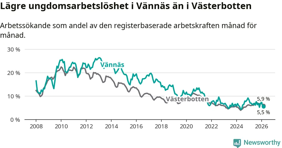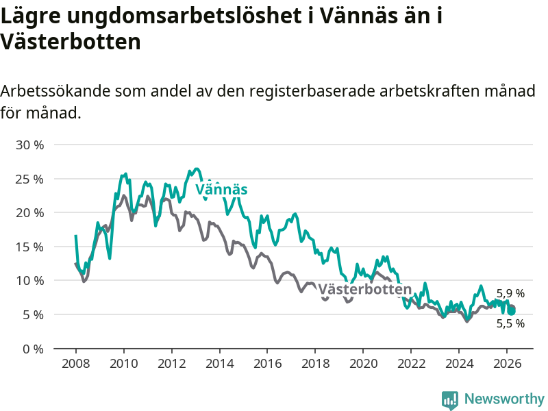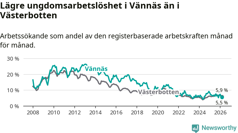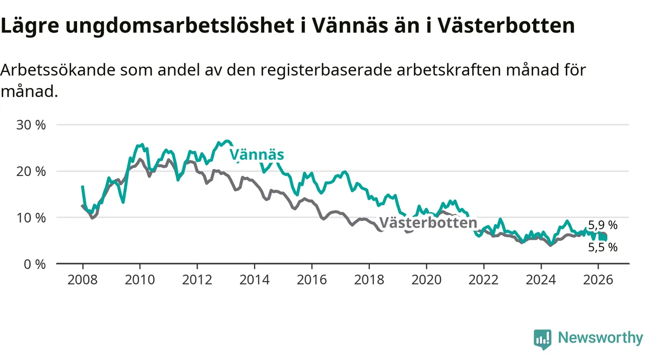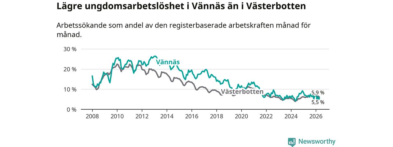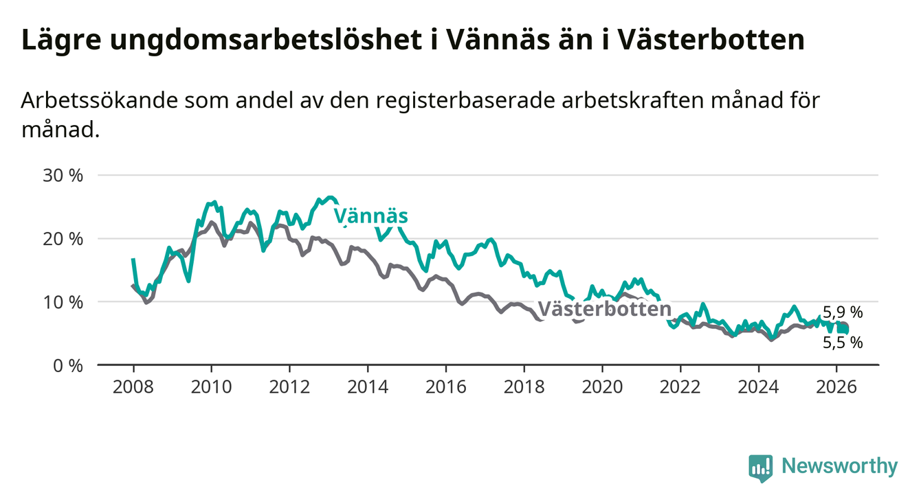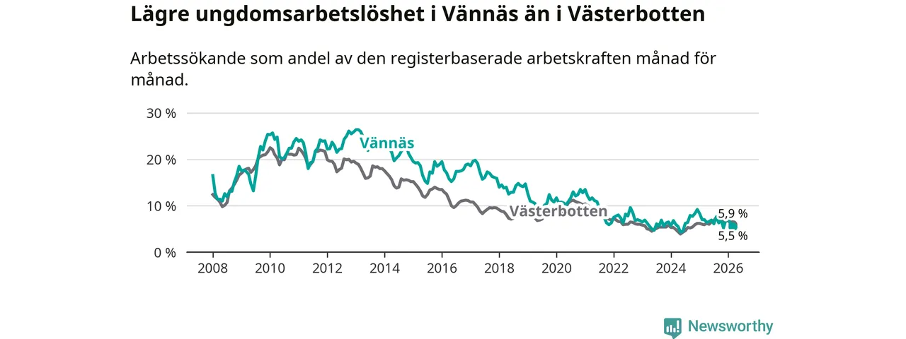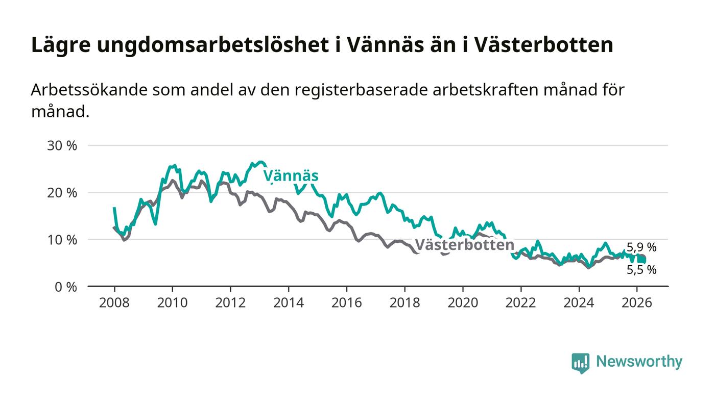 I och med den senaste månadens nedgång har de ungas arbetslöshet i Vännäs sjunkit sju månader i följd (ner från 7,6 procent i augusti 2025 till 5,5 procent nu).