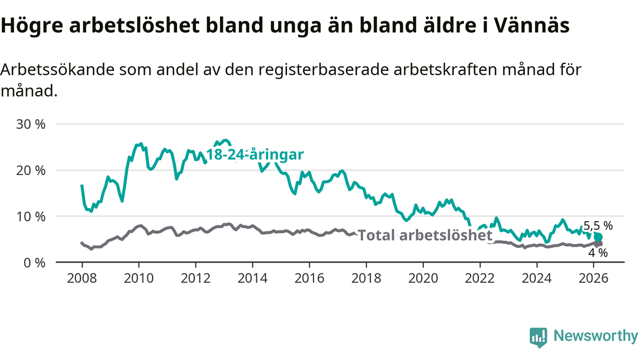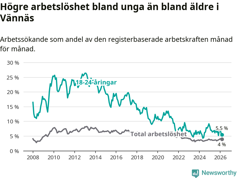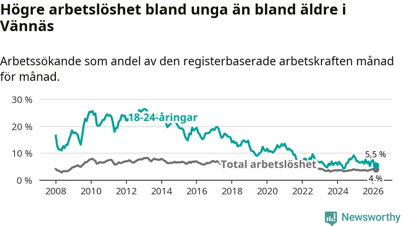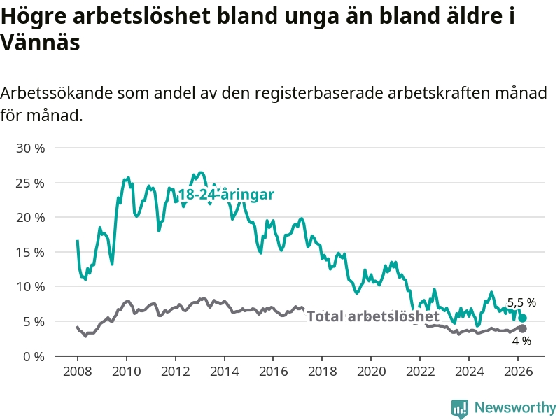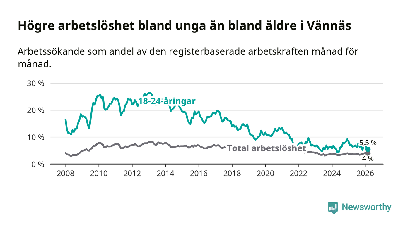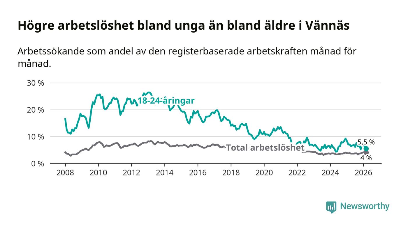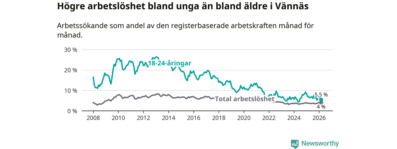 I och med den senaste månadens nedgång har de ungas arbetslöshet i Vännäs sjunkit sju månader i följd (ner från 7,6 procent i augusti 2025 till 5,5 procent nu).