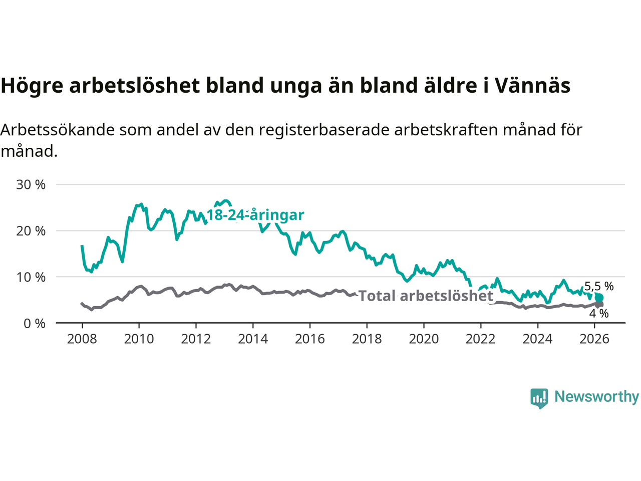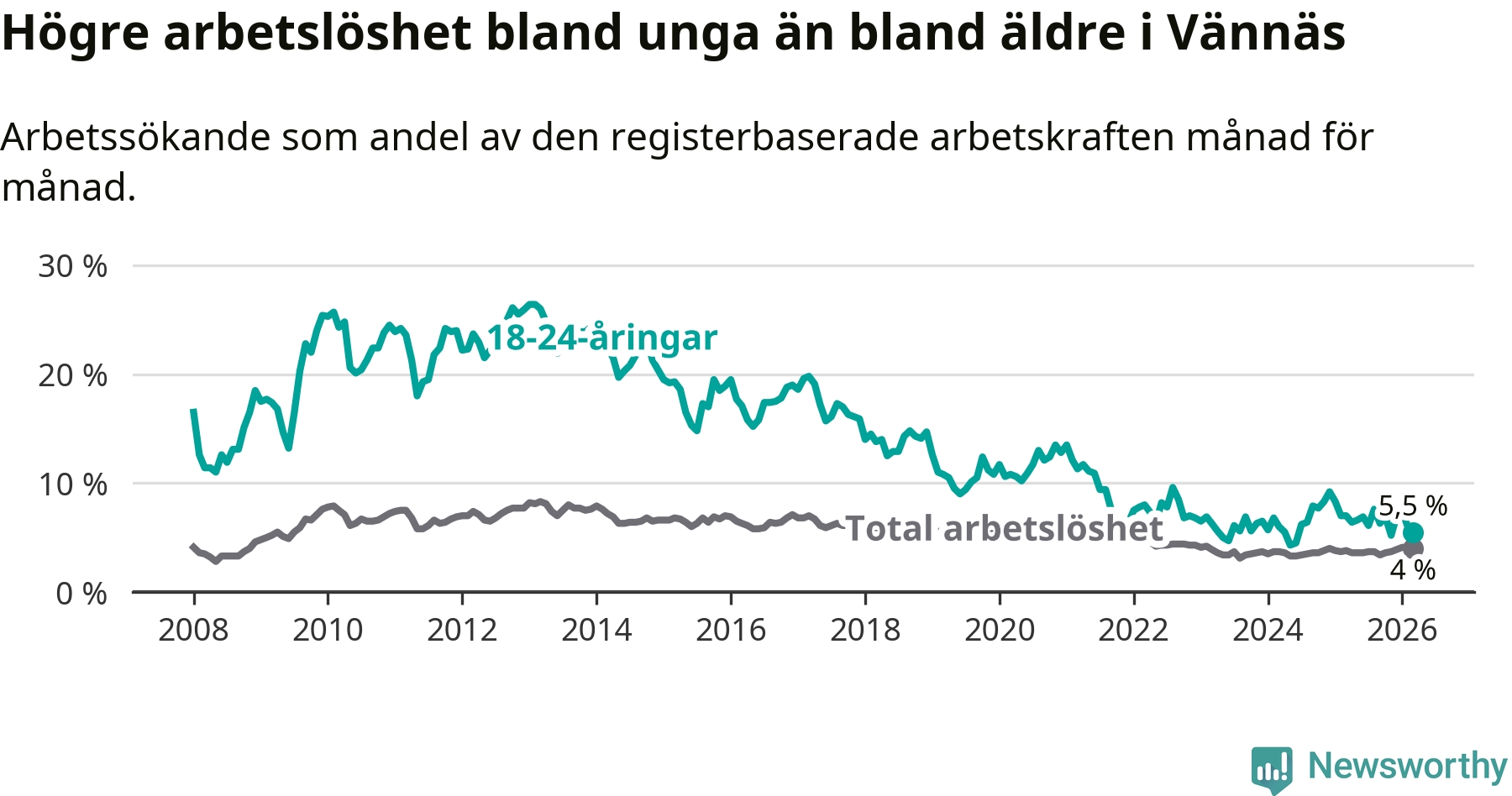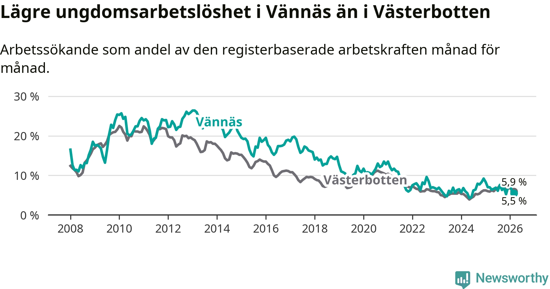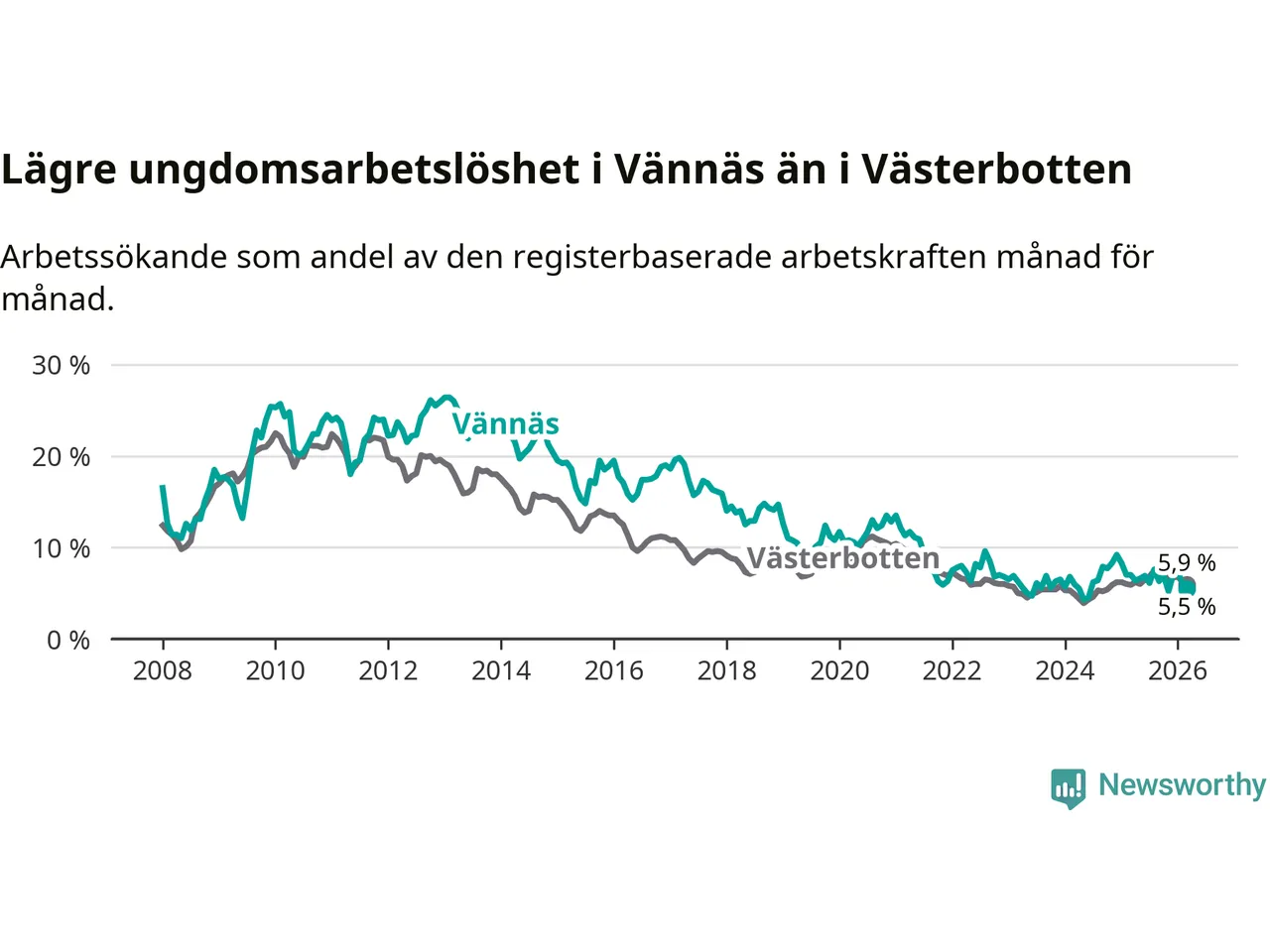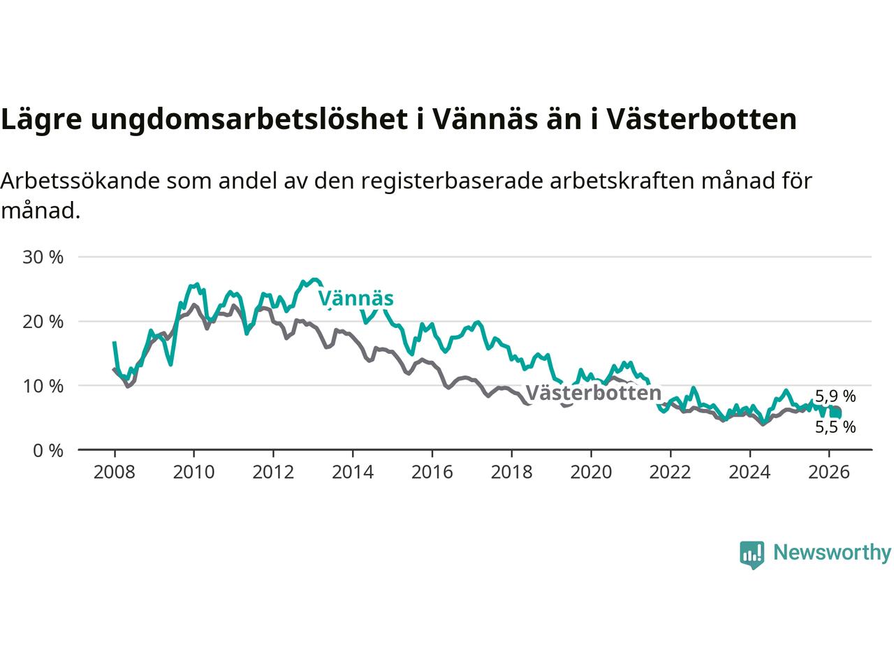 I och med den senaste månadens nedgång har de ungas arbetslöshet i Vännäs sjunkit sju månader i följd (ner från 7,6 procent i augusti 2025 till 5,5 procent nu).