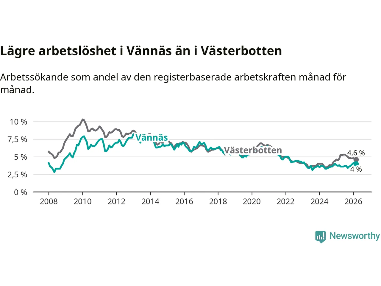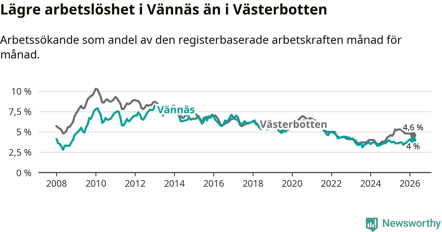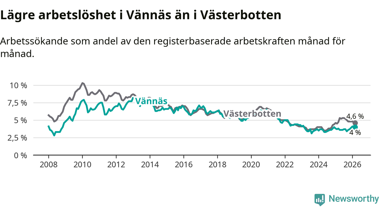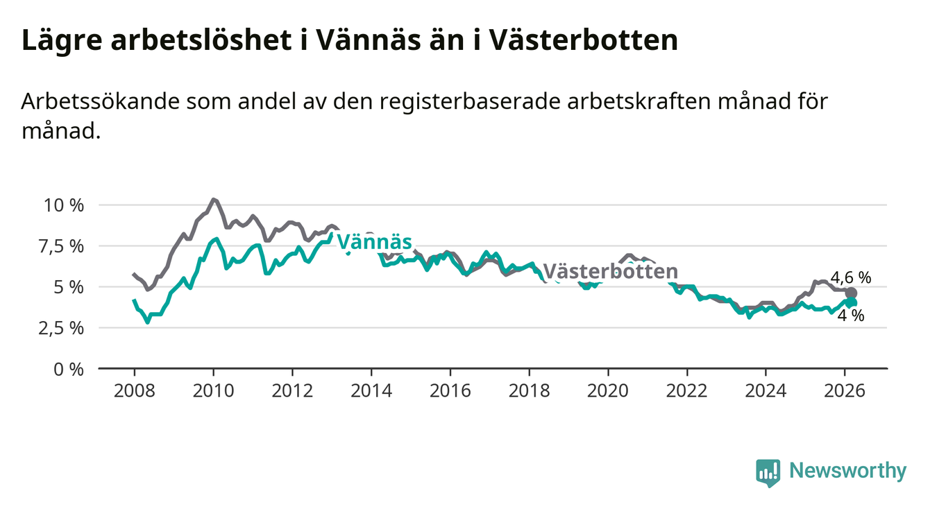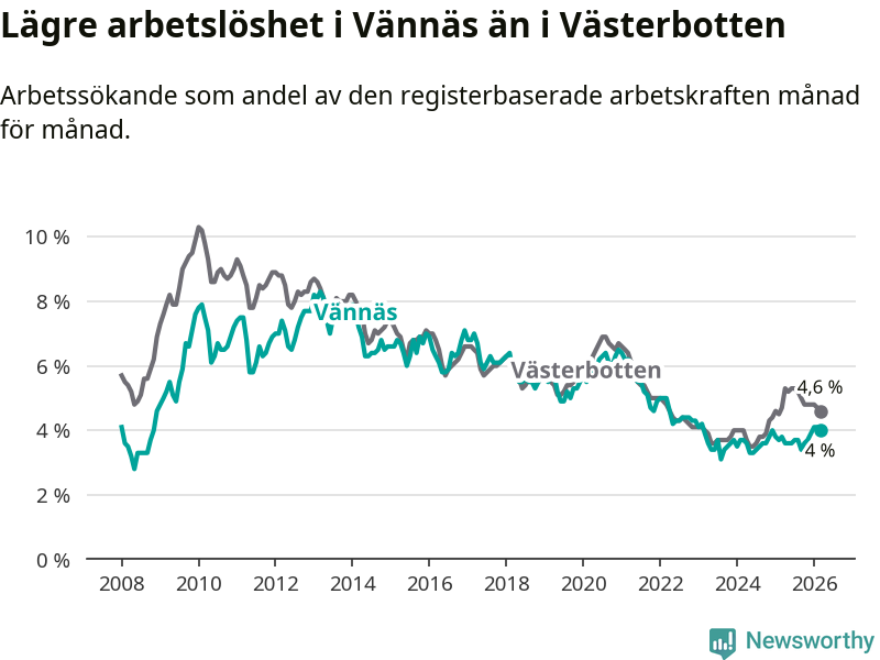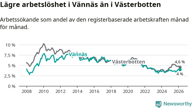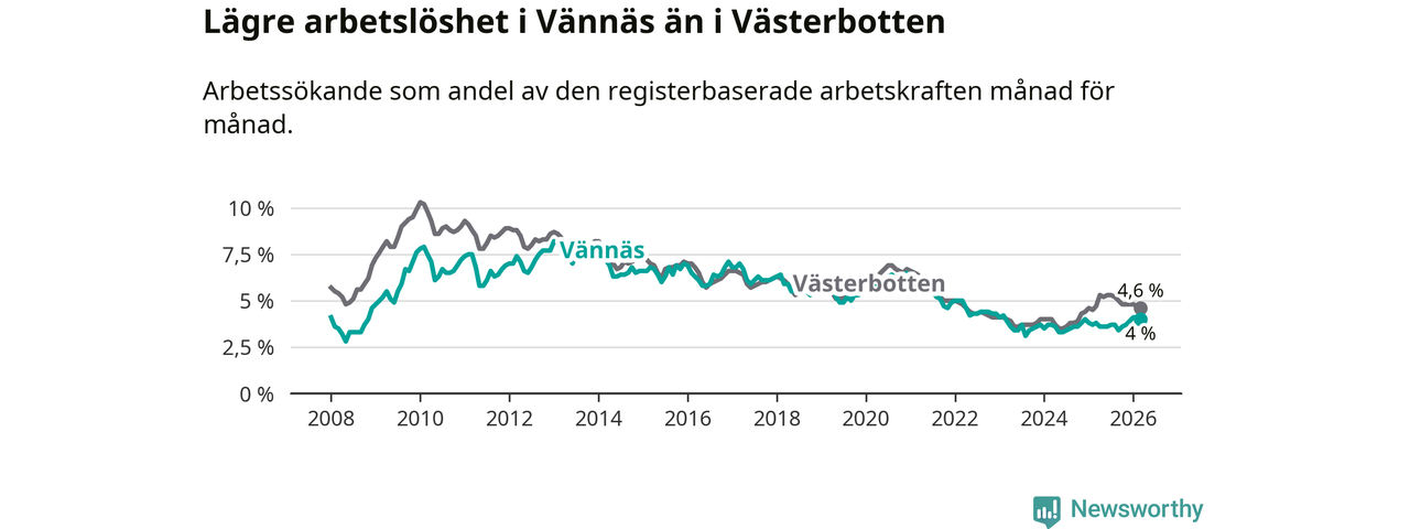 Vännäs går därmed mot strömmen i förhållande till andra kommuner i Västerbottens län. I de flesta andra kommuner i länet går arbetslösheten nedåt. Störst är minskningen i Åsele, där arbetslösheten sjunker med 1,3 procentenheter. I tabellen längre ner ser du utvecklingen i samtliga kommuner i länet.