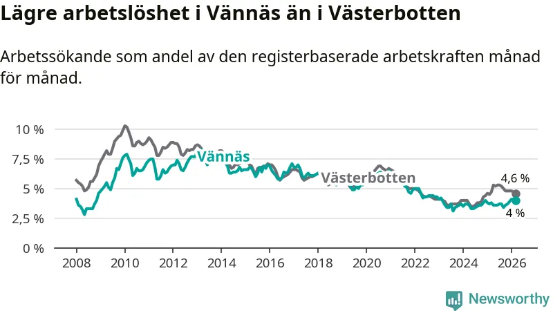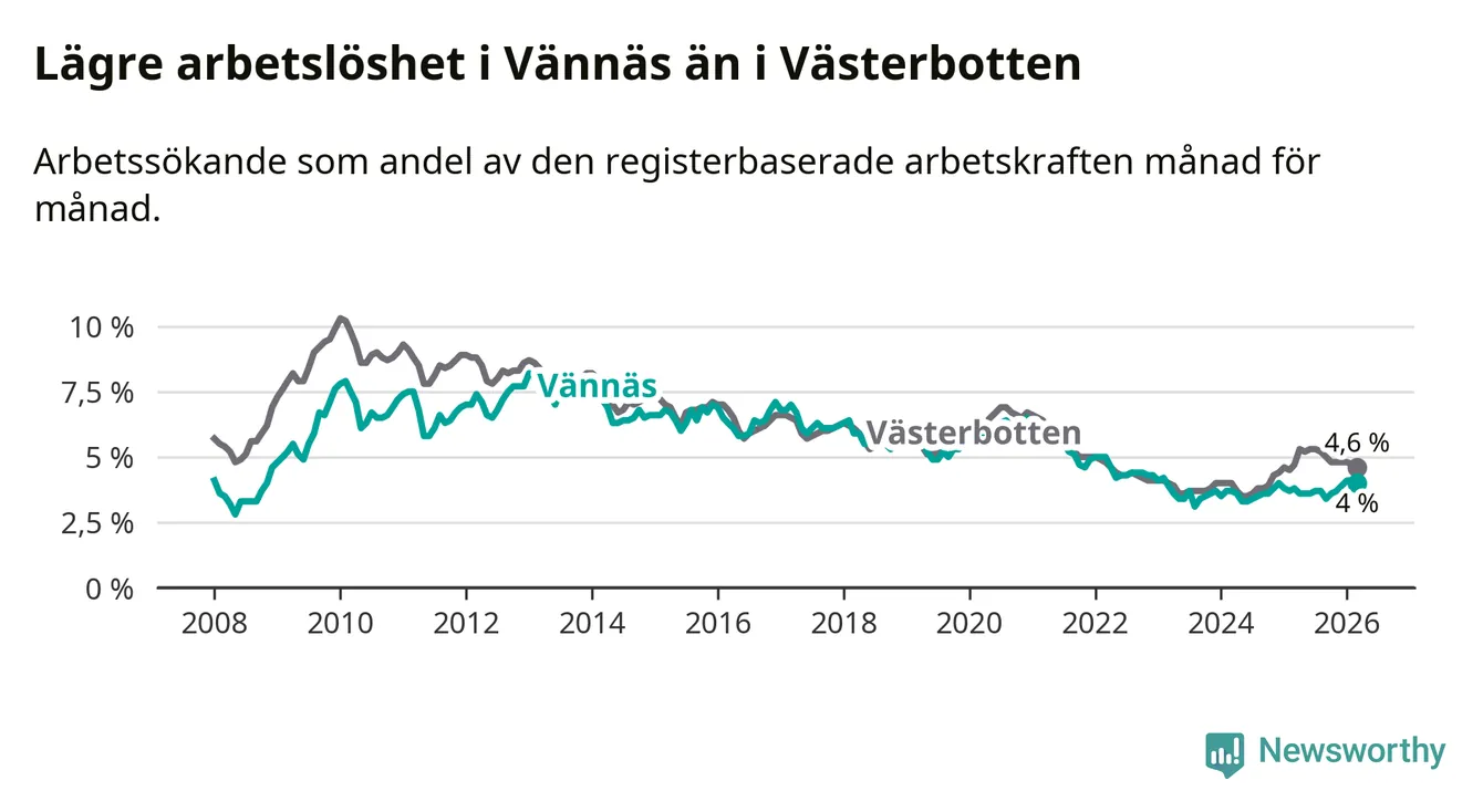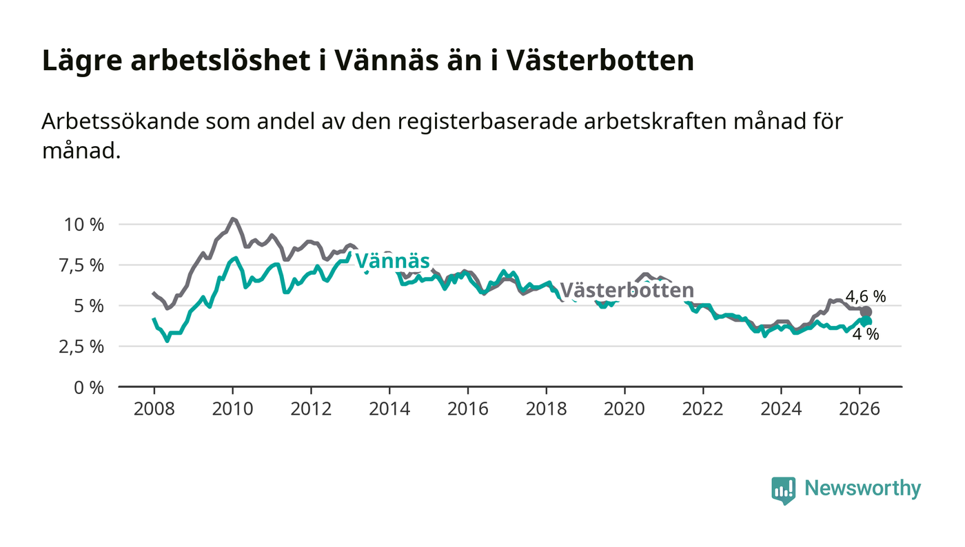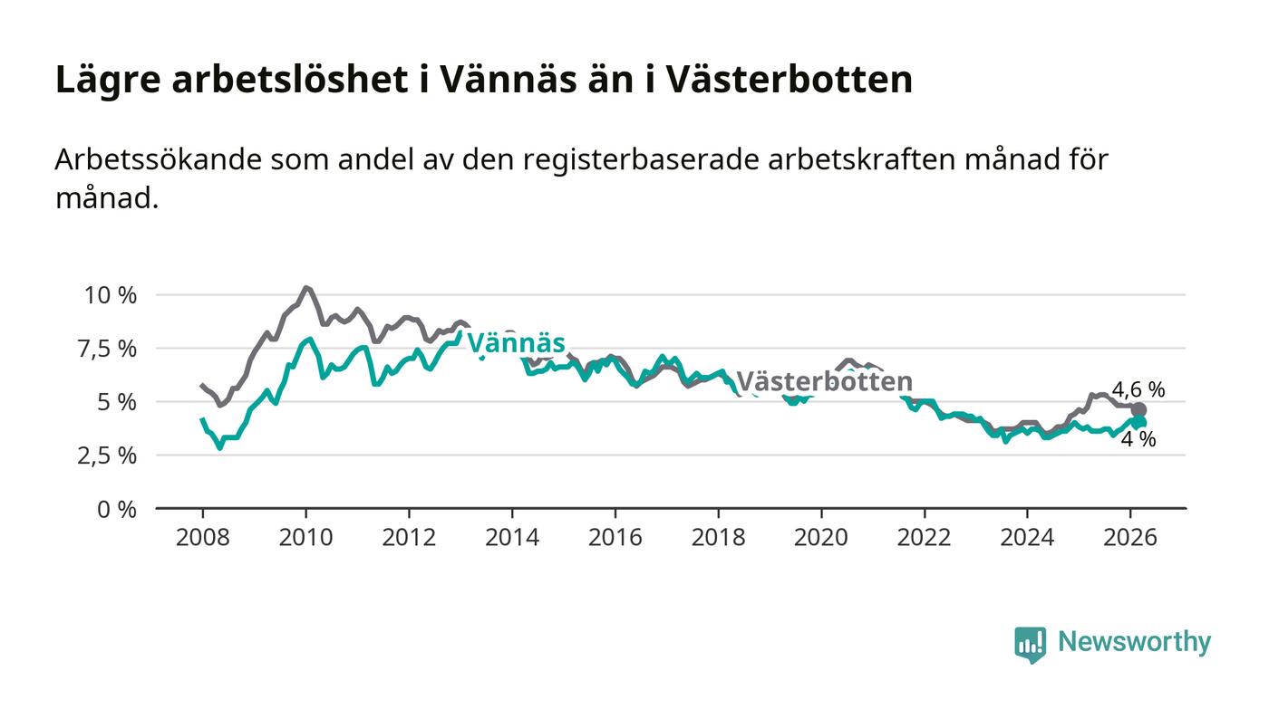 Även om arbetslösheten i Vännäs alltså ökar, så ligger den fortfarande under snittet i hela Västerbottens län (4,0 procent i kommunen, jämfört med 4,6 procent i hela länet). Sorsele har den lägsta arbetslösheten i länet (2,7 procent), medan Skellefteå har den högsta (5,9 procent). För att Vännäs skulle komma ner i samma arbetslöshetsnivå som Sorsele skulle 59 personer behöva sysselsättas.