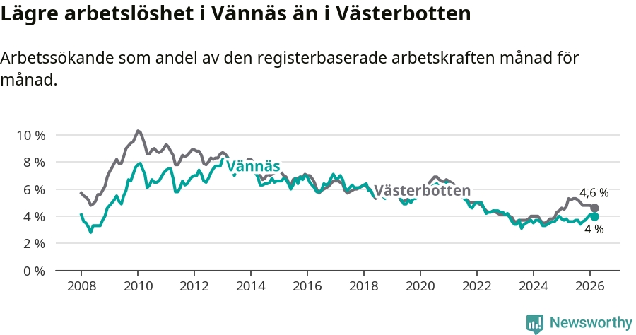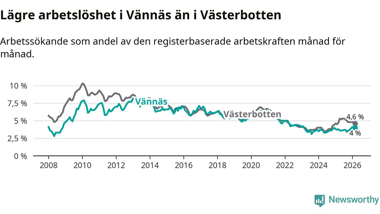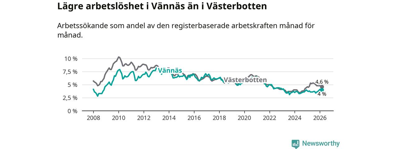 Under mars månad rapporterade Vännäs kommun en total arbetslöshet på 4,0 procent. Det är en ökning jämfört med samma tidpunkt i fjol (+0,2 procentenheter). I Västerbottens län däremot sjunker arbetslösheten något.