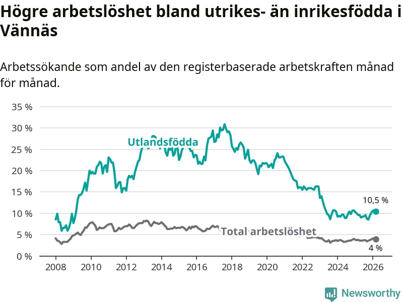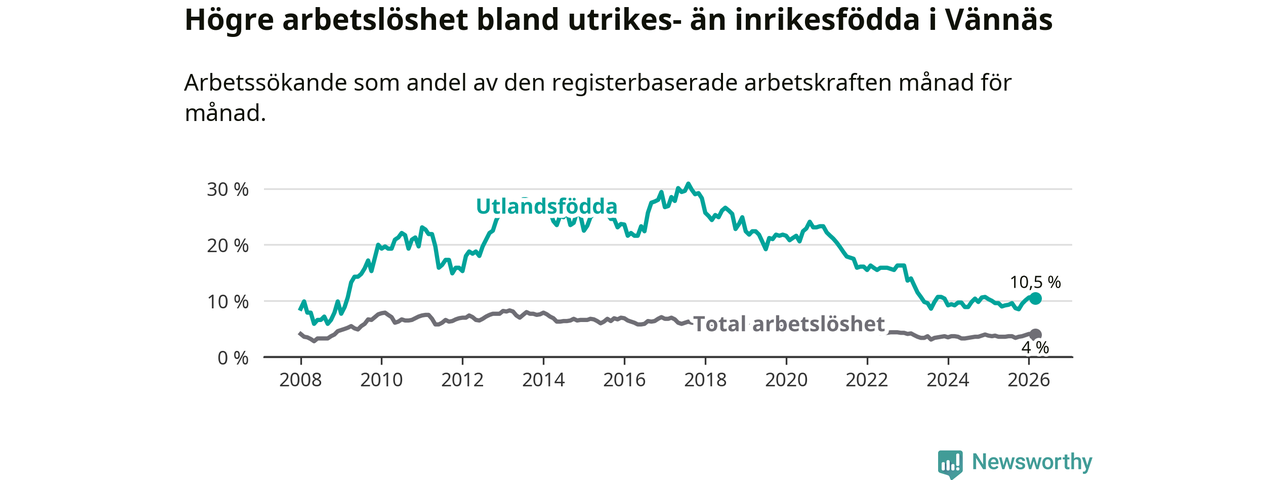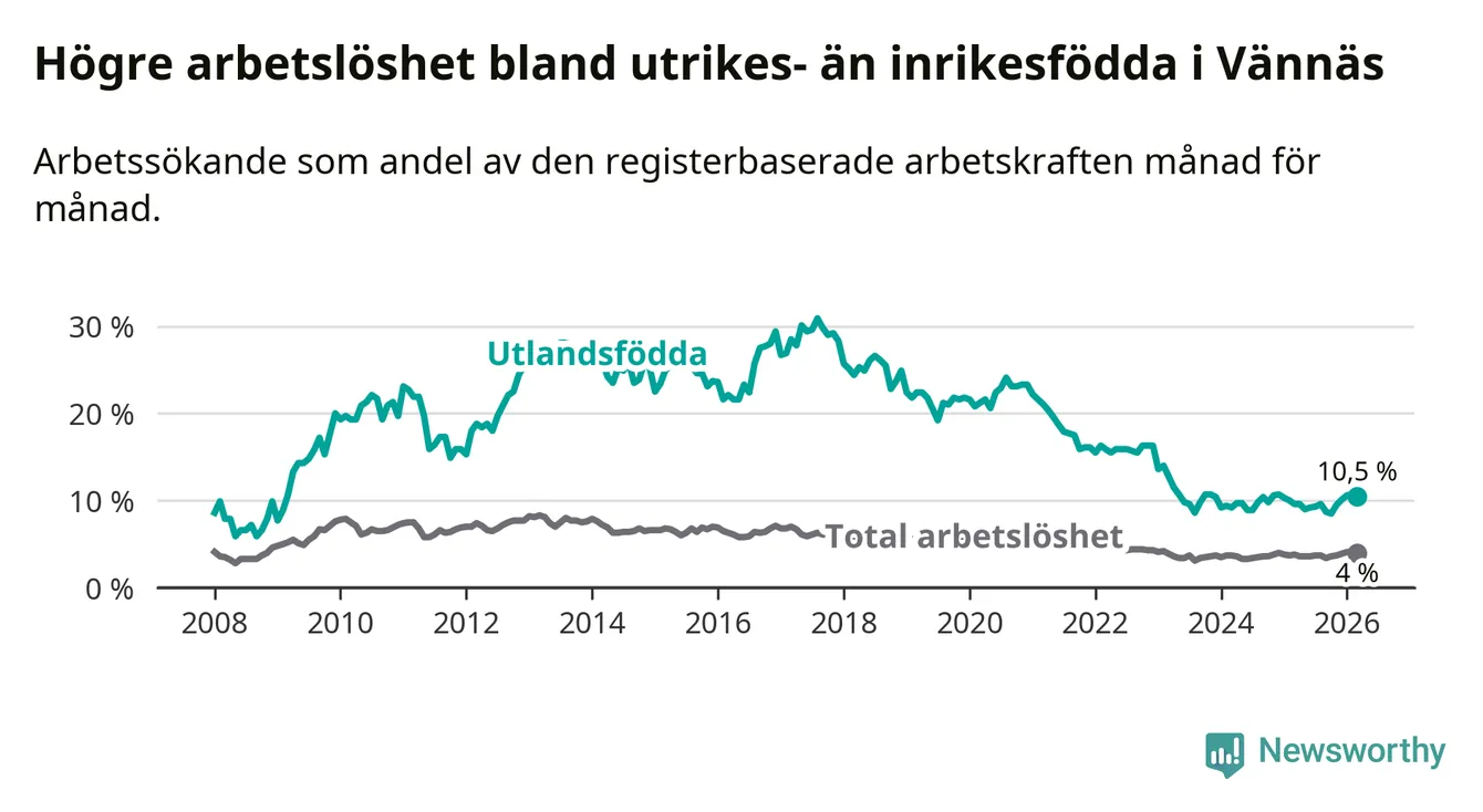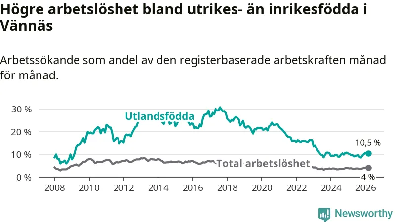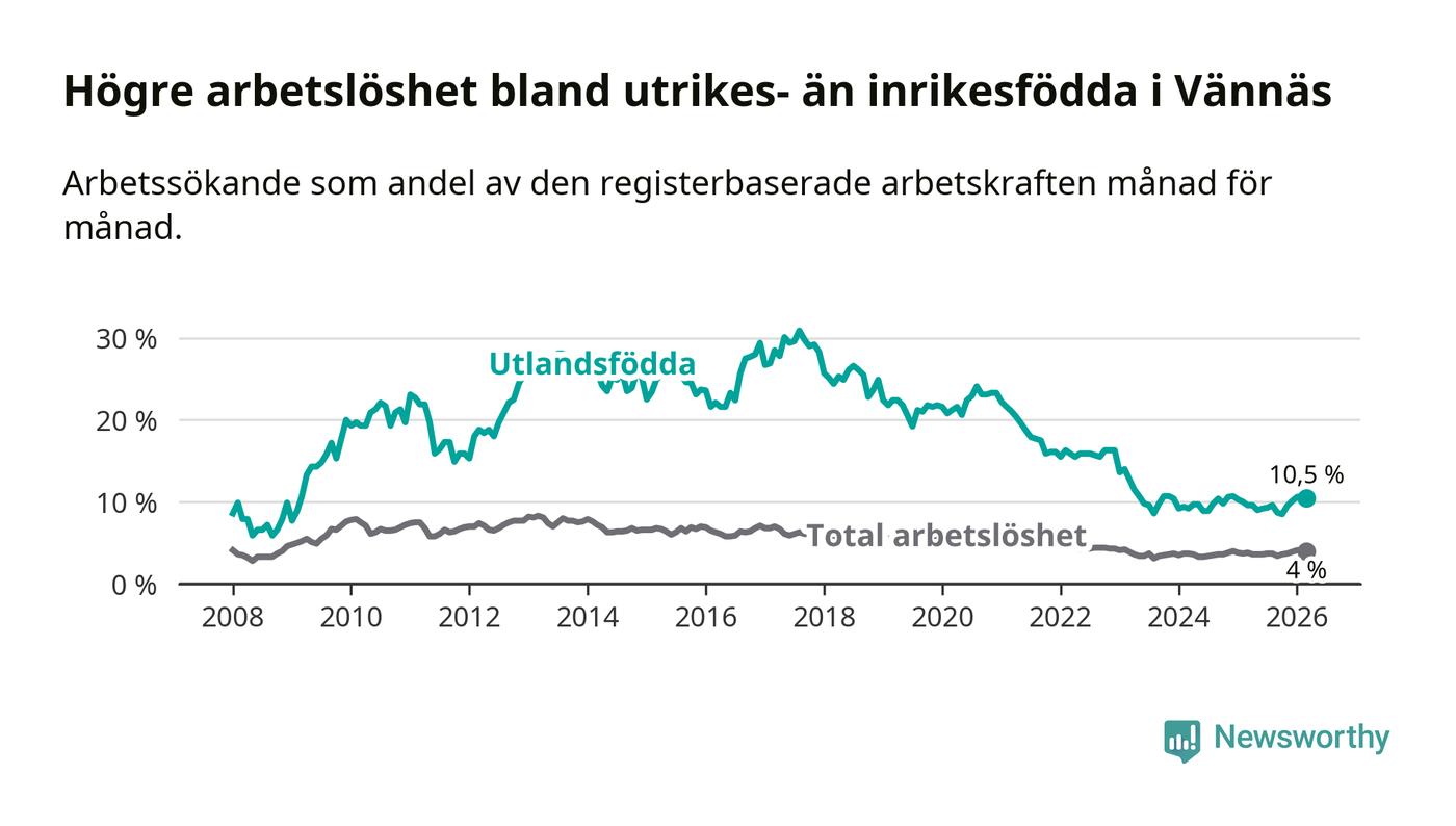 Arbetslösheten bland utlandsfödda var 10,5 procent i Vännäs under mars månad, motsvarande 54 av 514 personer. Det är 0,9 procentenheter fler än vid samma tidpunkt i fjol (+4 om man räknar personer).