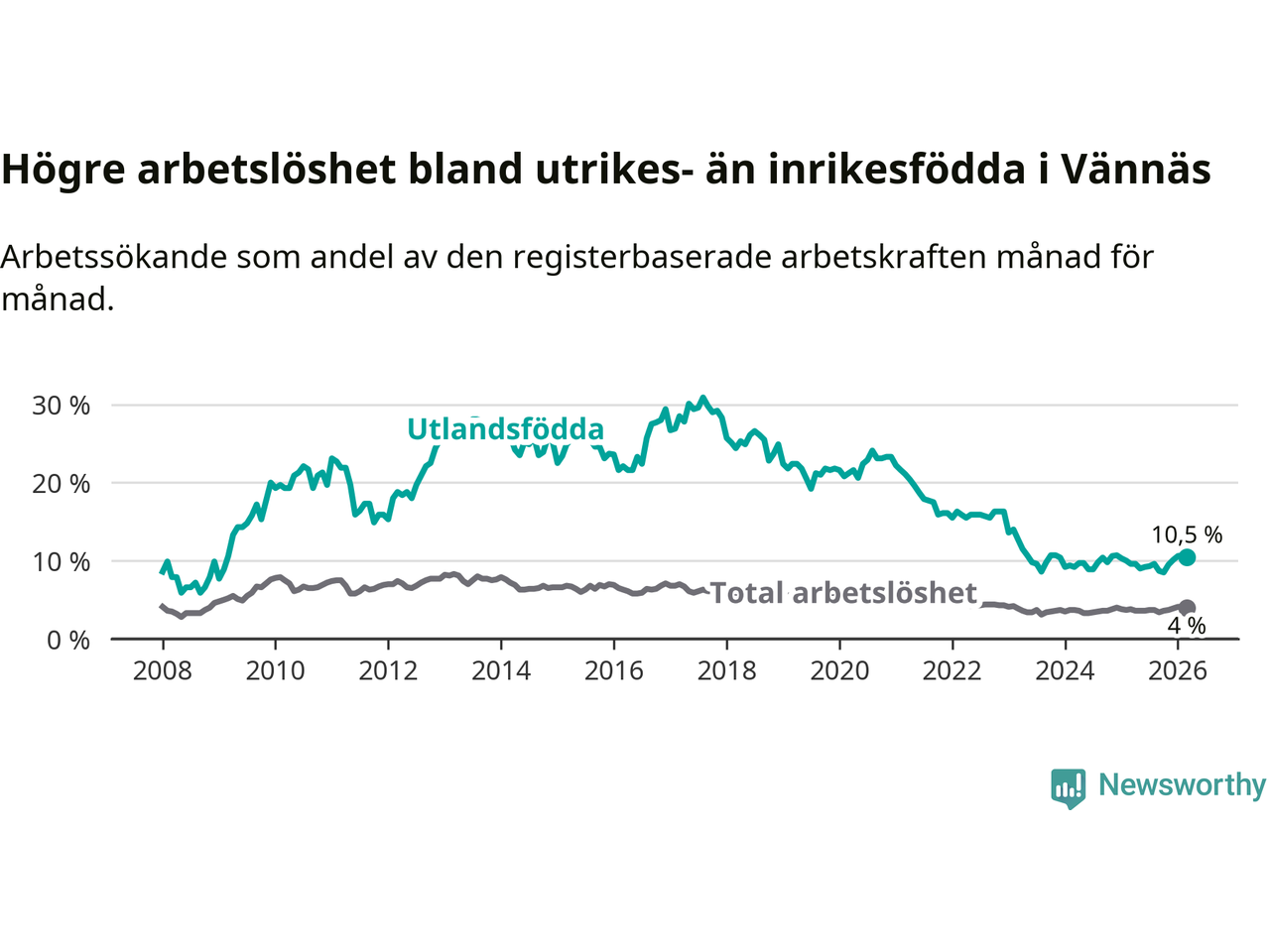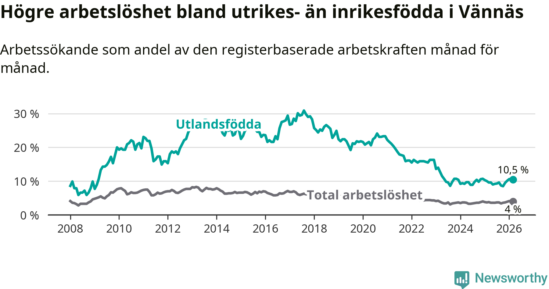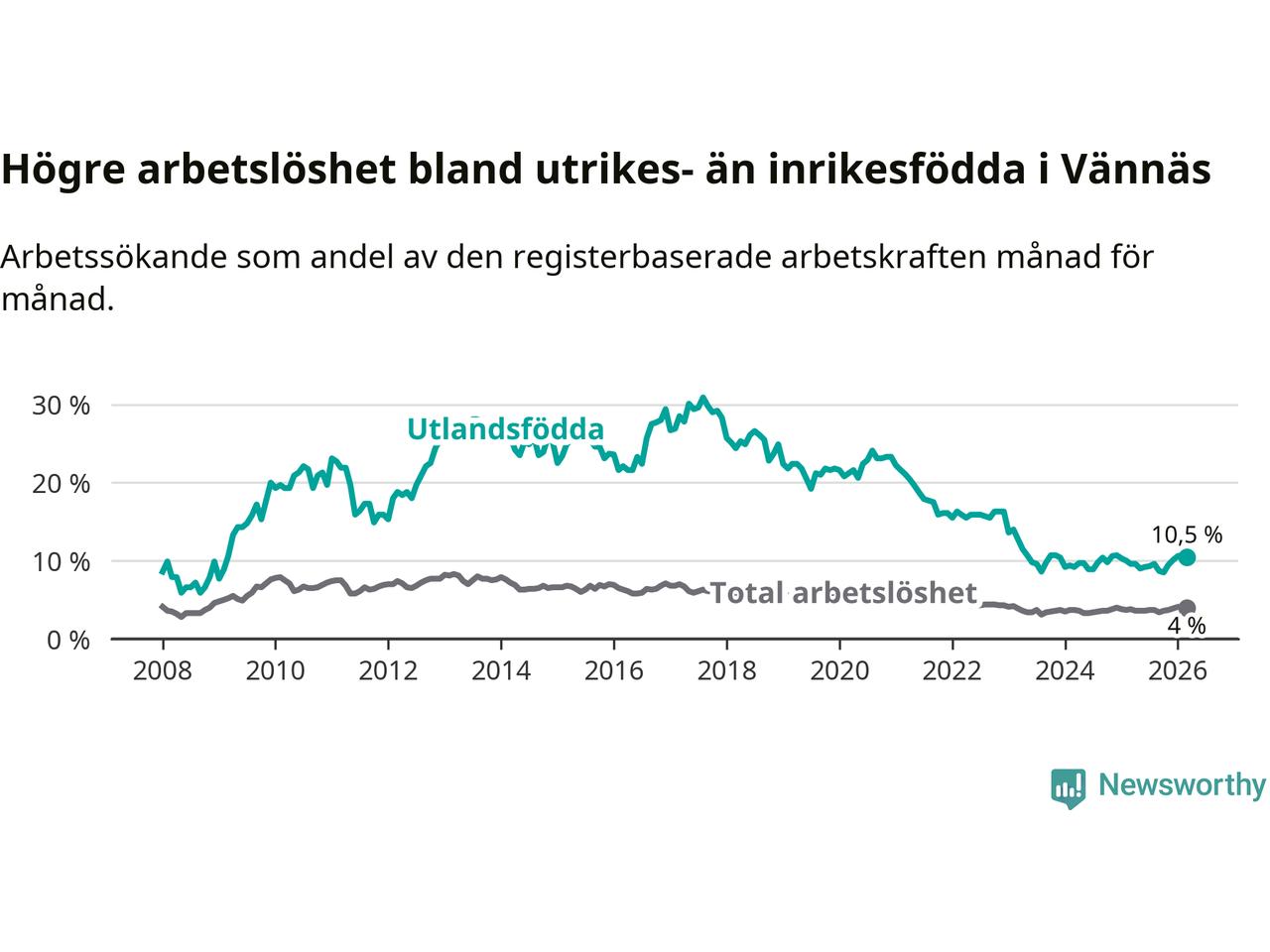Arbetslösheten bland utlandsfödda var 10,5 procent i Vännäs under mars månad, motsvarande 54 av 514 personer. Det är 0,9 procentenheter fler än vid samma tidpunkt i fjol (+4 om man räknar personer).