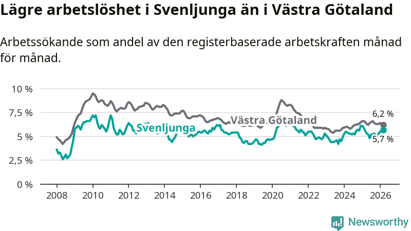 Även om arbetslösheten i Svenljunga alltså ökar, så ligger den fortfarande under snittet i hela Västra Götalands län (5,7 procent i kommunen, jämfört med 6,2 procent i hela länet). Öckerö har den lägsta arbetslösheten i länet (2,6 procent), medan Gullspång har den högsta (8,1 procent). För att Svenljunga skulle komma ner i samma arbetslöshetsnivå som Öckerö skulle 153 personer behöva sysselsättas.