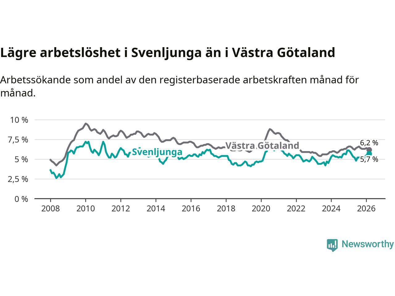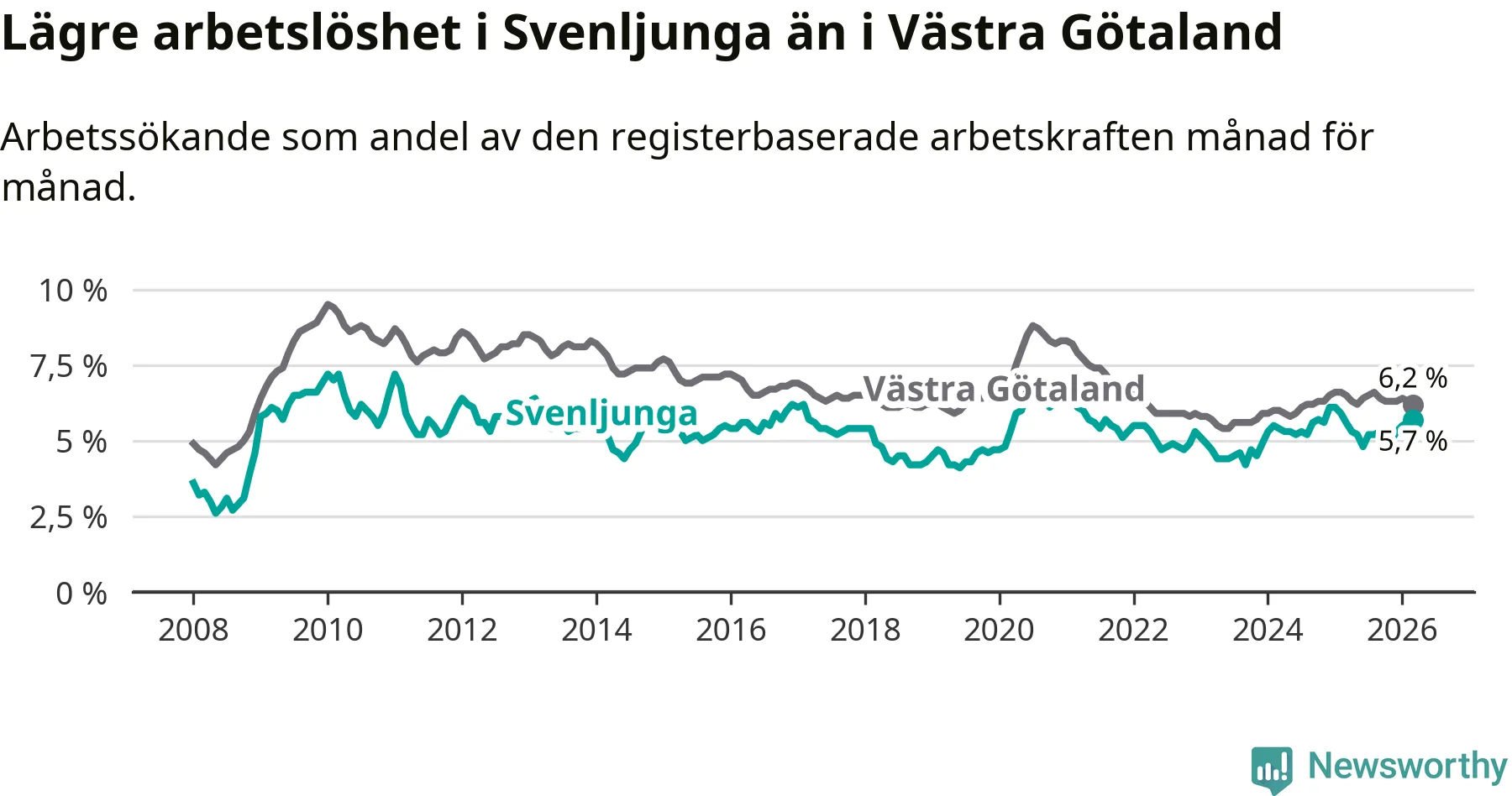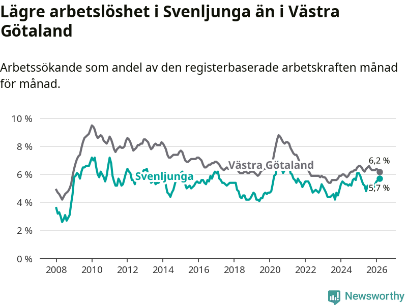 Graf: Arbetslöshet i Svenljunga kommun och Västra Götalands län