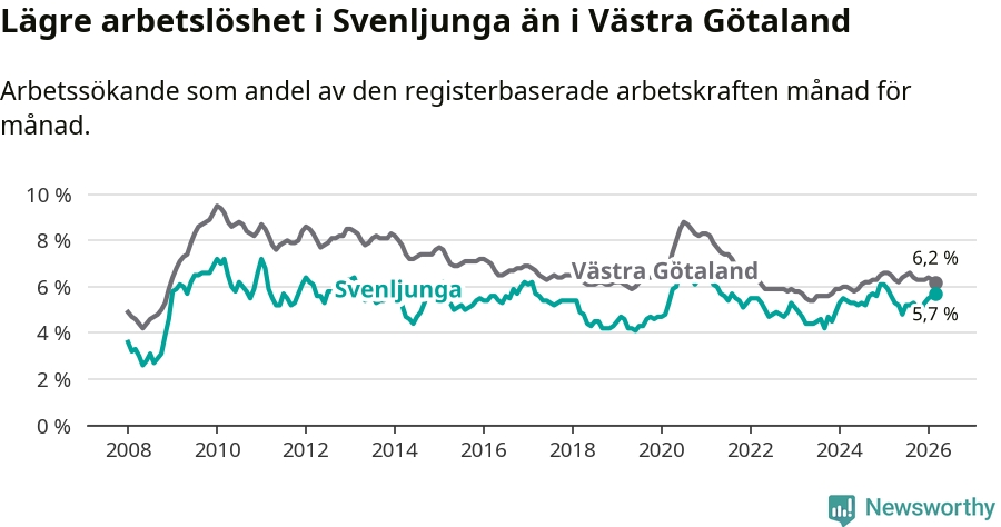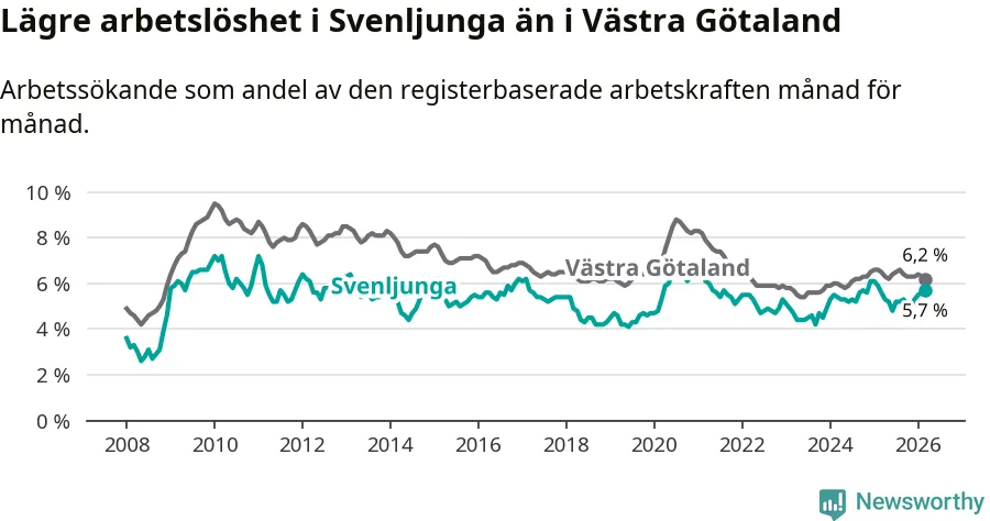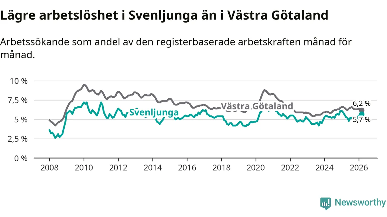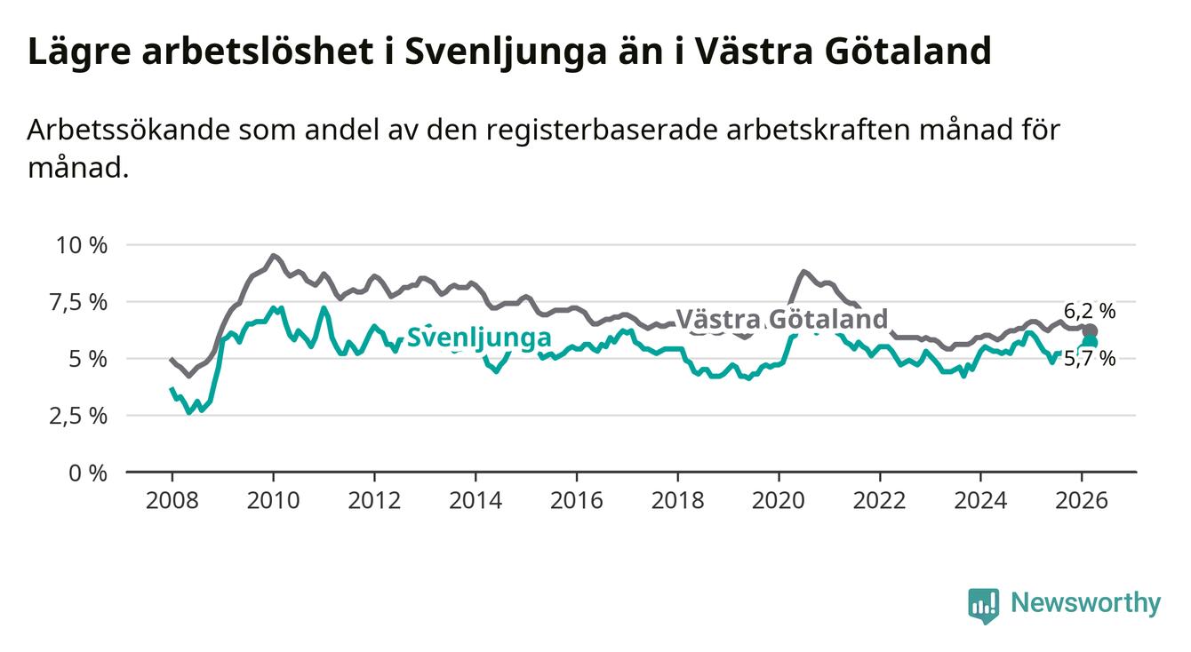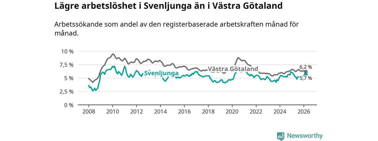 Under mars månad rapporterade Svenljunga kommun en total arbetslöshet på 5,7 procent. Det är en ökning jämfört med samma tidpunkt i fjol (+0,1 procentenheter). I Västra Götalands län däremot sjunker arbetslösheten .