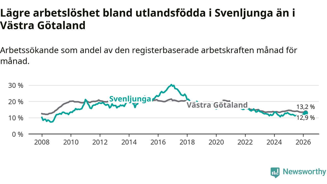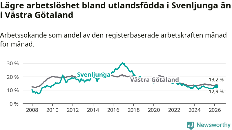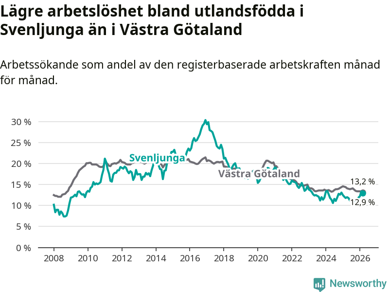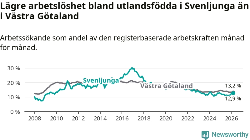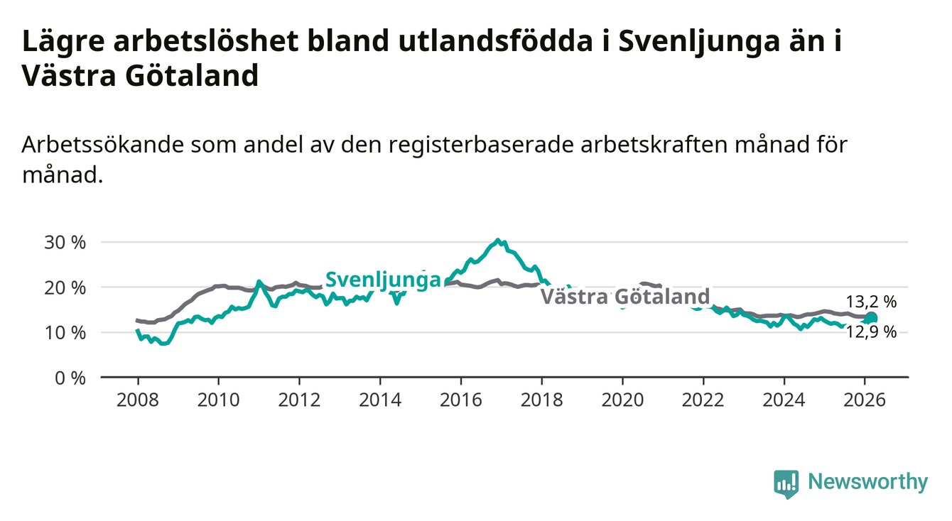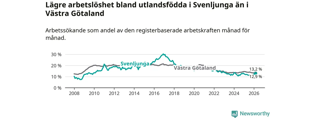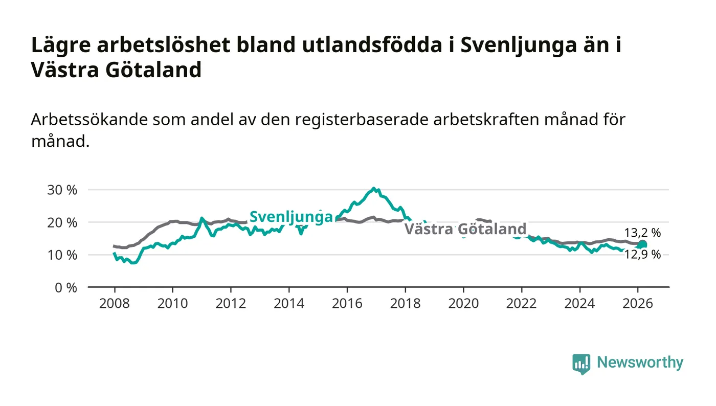 Medan arbetslösheten bland utlandsfödda alltså ökar i Svenljunga så minskar den i Västra Götaland. Jämfört med mars förra året har andelen arbetslösa utlandsfödda i länet minskat med 1,2 procentenheter (till 13,2 procent). Trots den senaste uppgången har Svenljunga med andra ord fortfarande lägre arbetslöshet bland utlandsfödda än Västra Götaland.