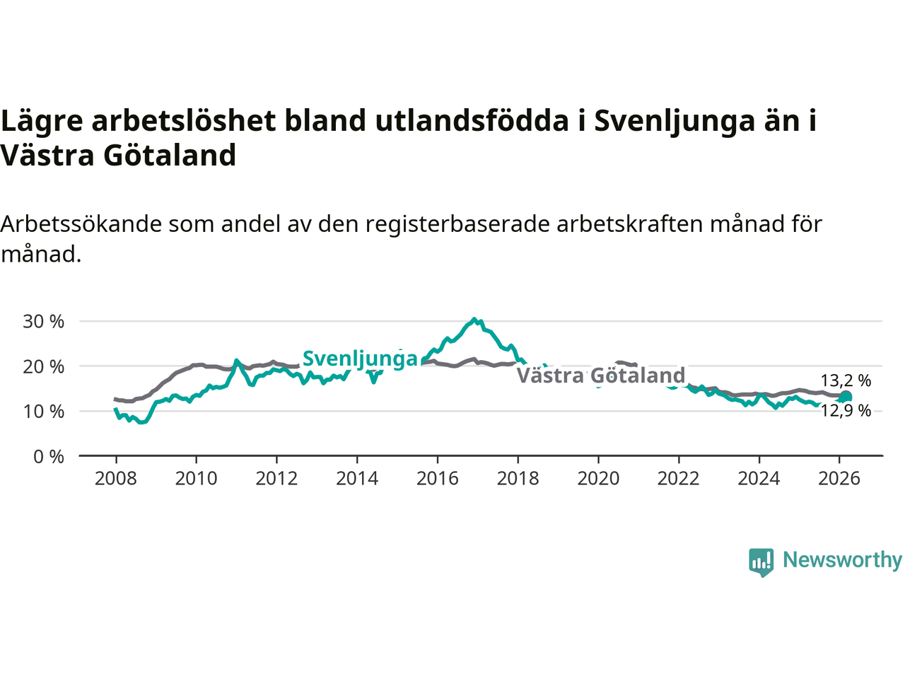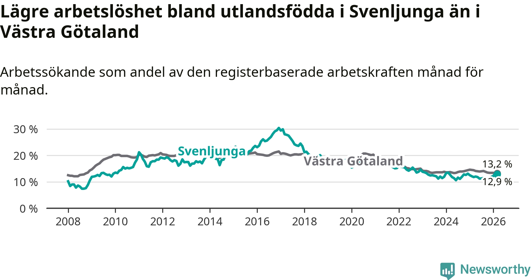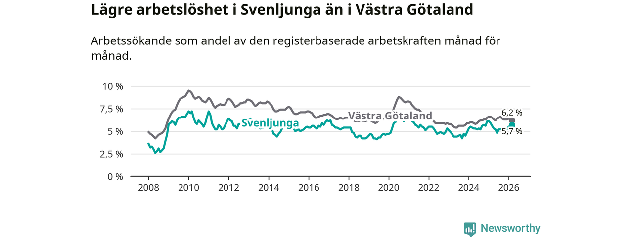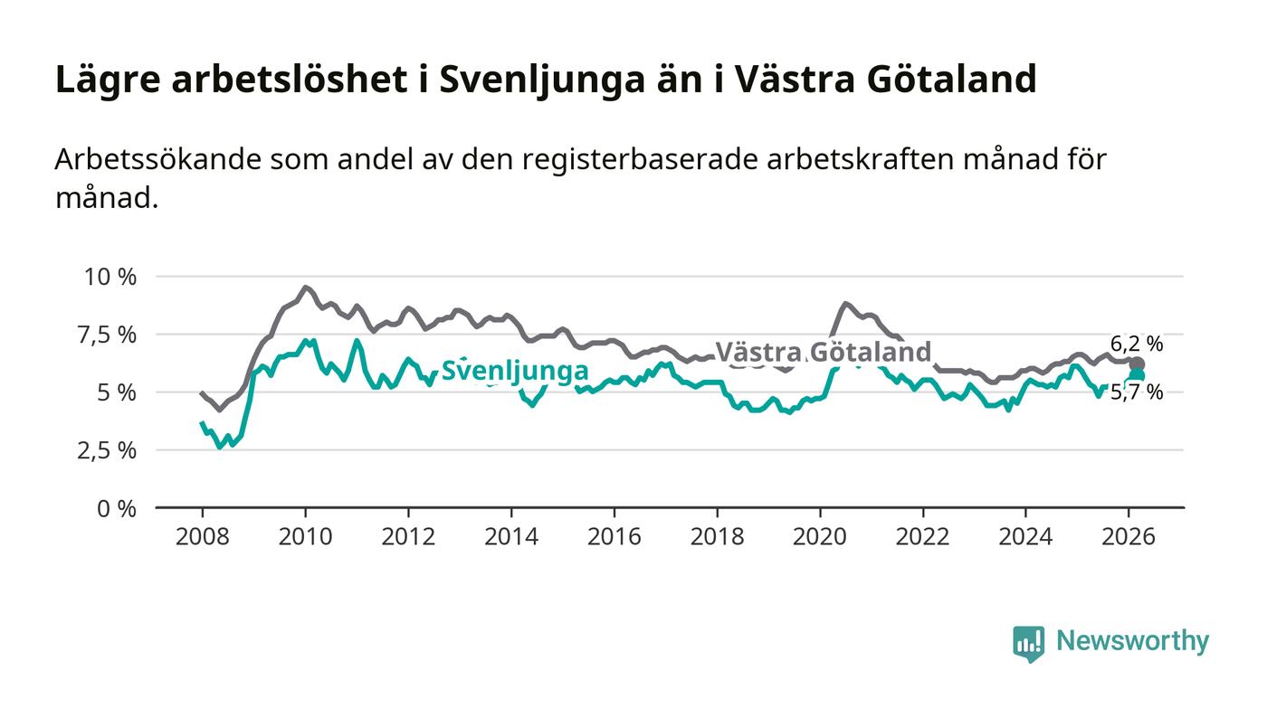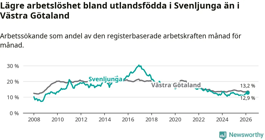 Medan arbetslösheten bland utlandsfödda alltså ökar i Svenljunga så minskar den i Västra Götaland. Jämfört med mars förra året har andelen arbetslösa utlandsfödda i länet minskat med 1,2 procentenheter (till 13,2 procent). Trots den senaste uppgången har Svenljunga med andra ord fortfarande lägre arbetslöshet bland utlandsfödda än Västra Götaland.