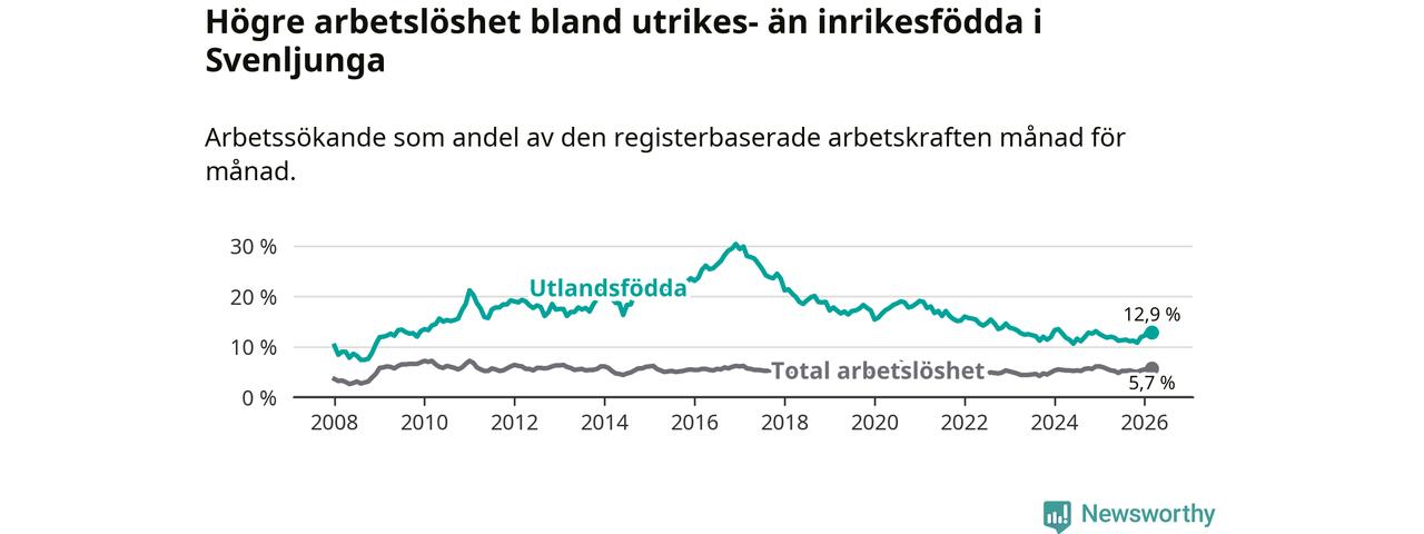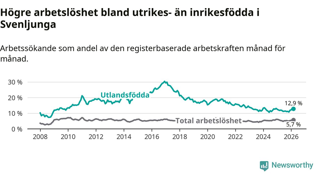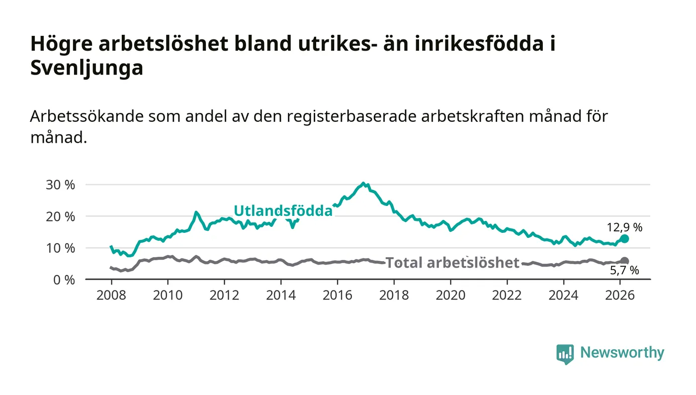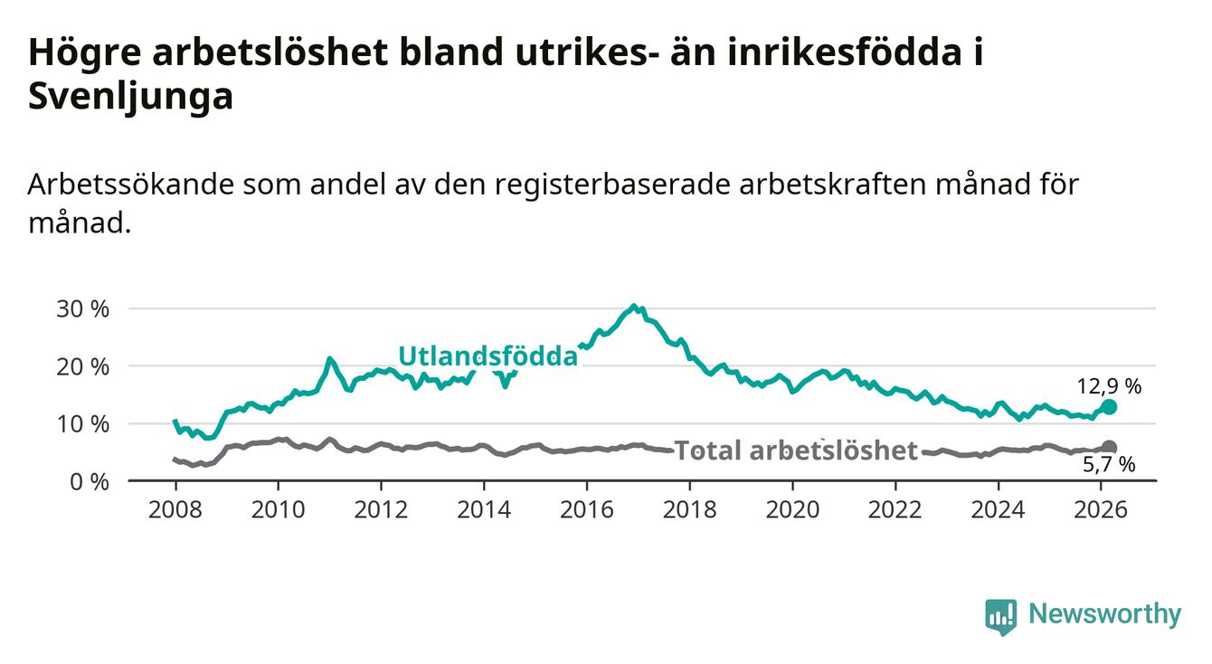 Arbetslösheten bland utlandsfödda var 12,9 procent i Svenljunga under mars månad, motsvarande 109 av 845 personer. Det är 1,1 procentenheter fler än vid samma tidpunkt i fjol (+7 om man räknar personer).