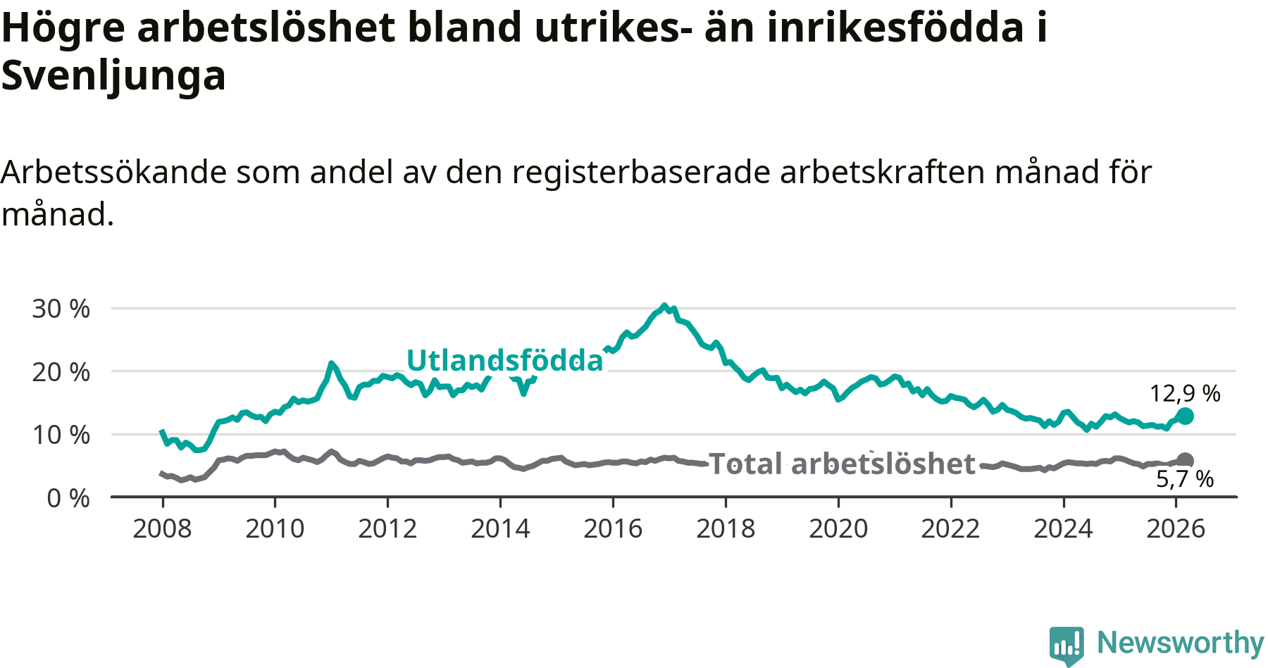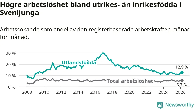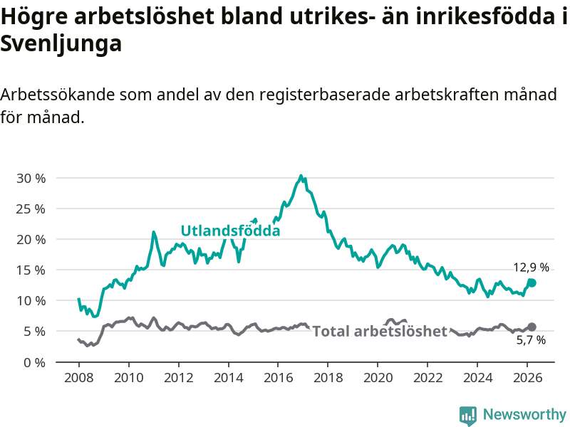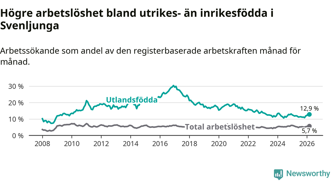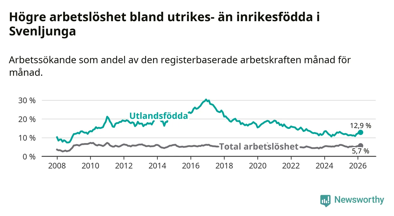 Arbetslösheten bland utlandsfödda var 12,9 procent i Svenljunga under mars månad, motsvarande 109 av 845 personer. Det är 1,1 procentenheter fler än vid samma tidpunkt i fjol (+7 om man räknar personer).
