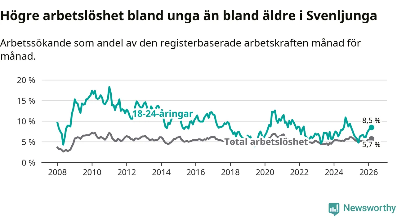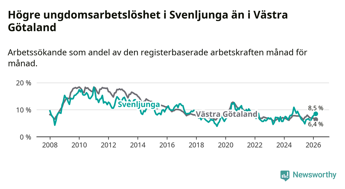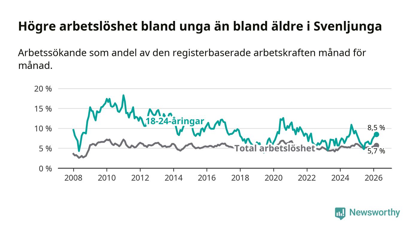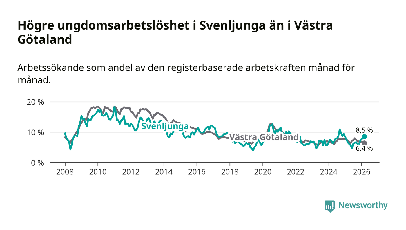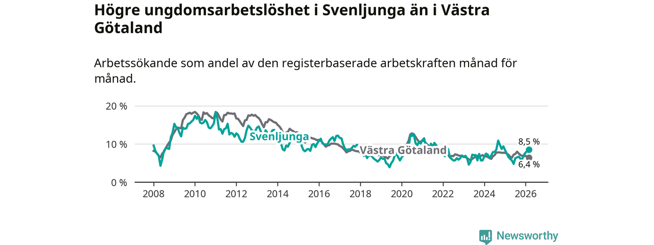 Medan Svenljunga har lägre total arbetslöshet än Västra Götaland, ligger ungdomsarbetslösheten 2,1 procentenheter högre i Svenljunga.