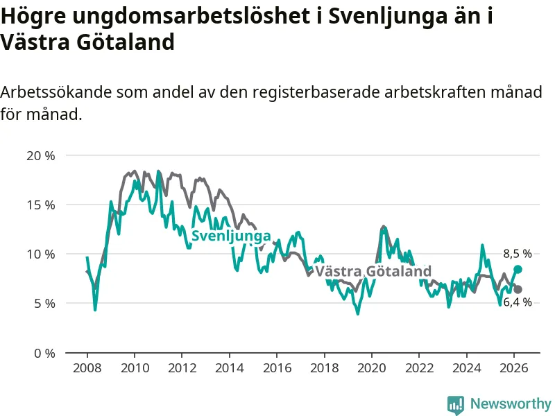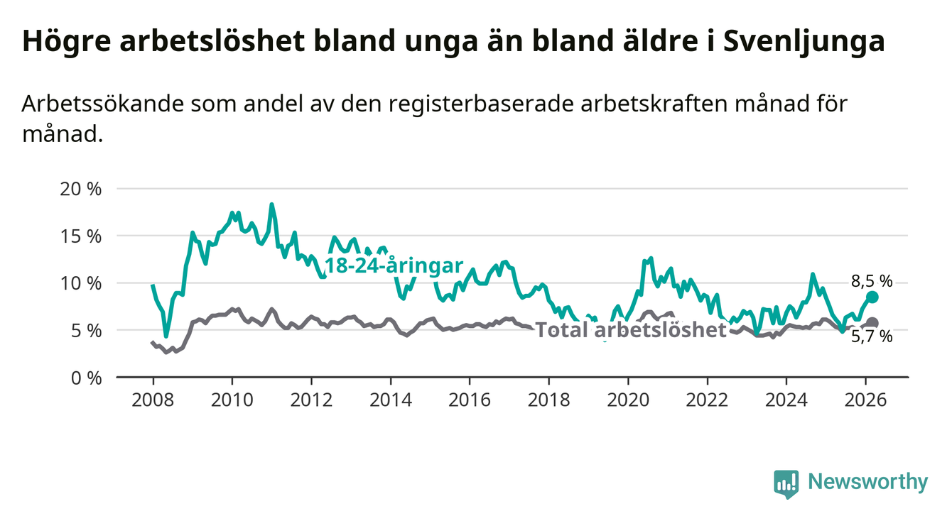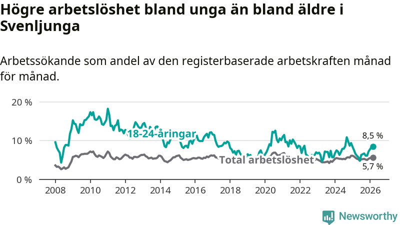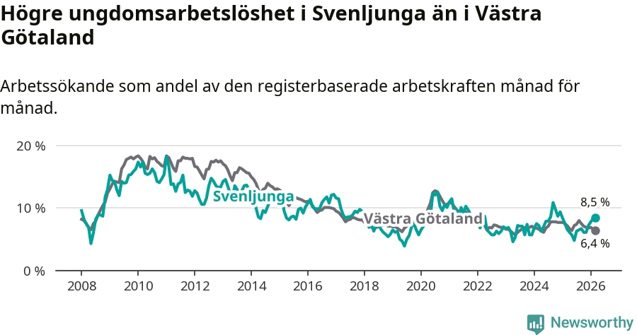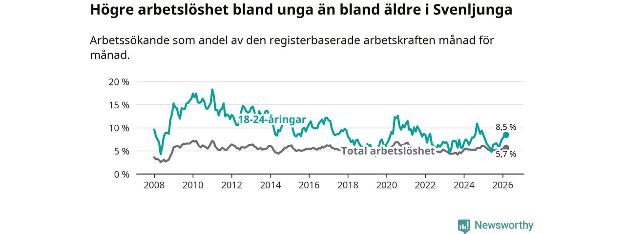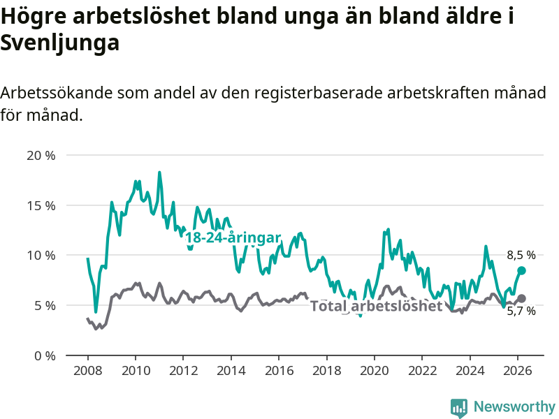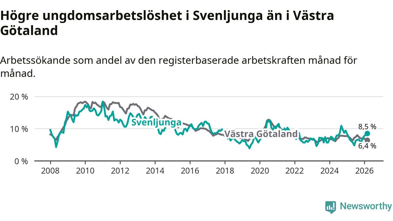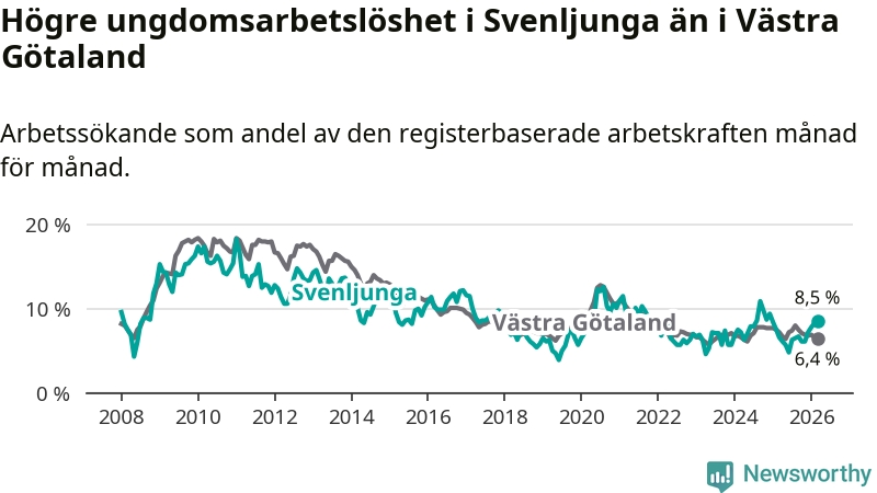 Medan Svenljunga har lägre total arbetslöshet än Västra Götaland, ligger ungdomsarbetslösheten 2,1 procentenheter högre i Svenljunga.