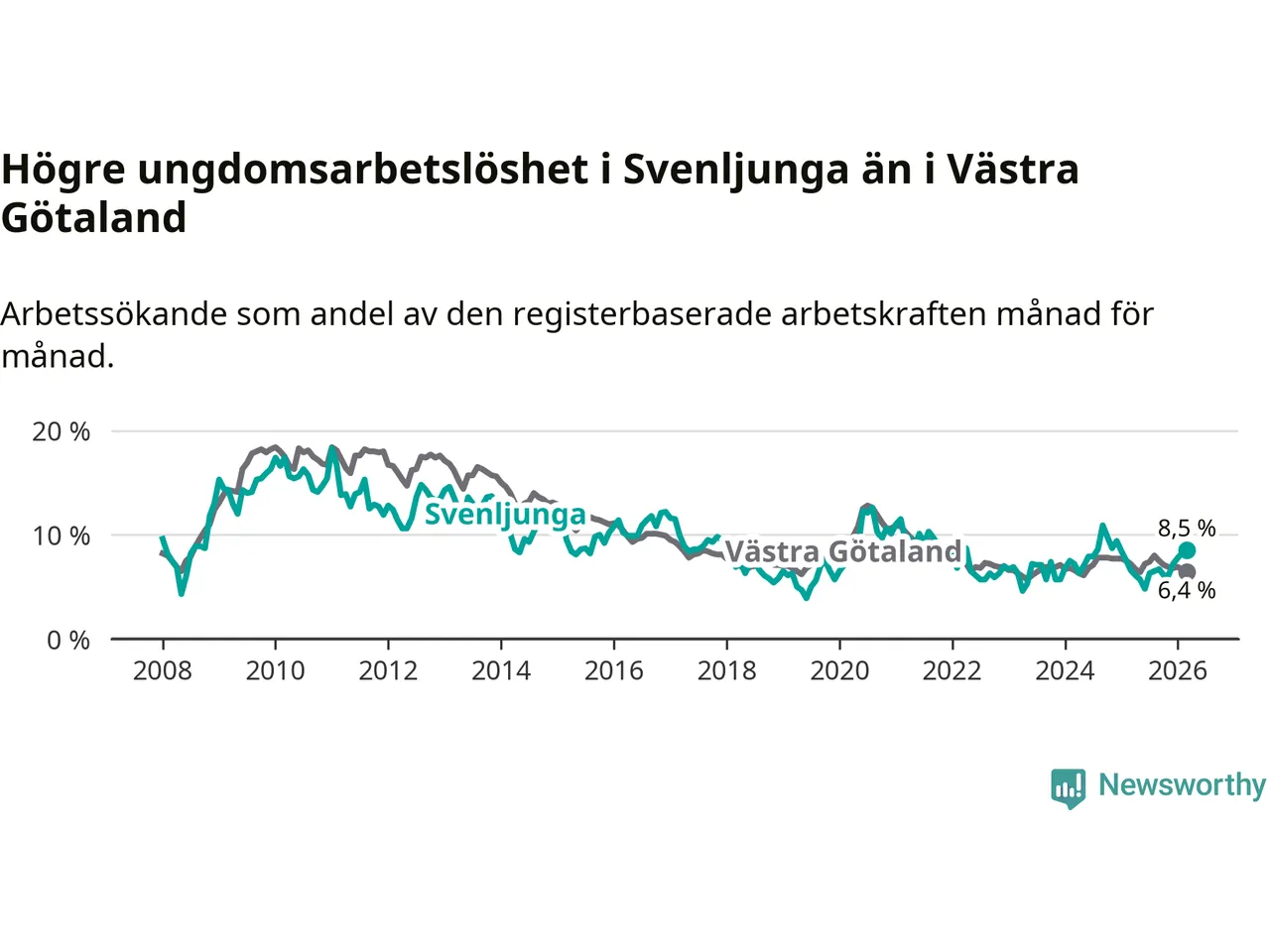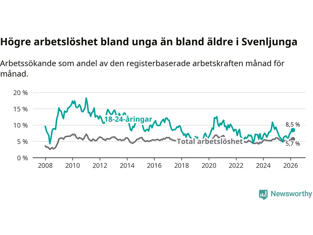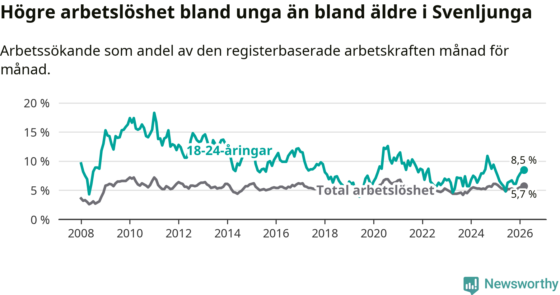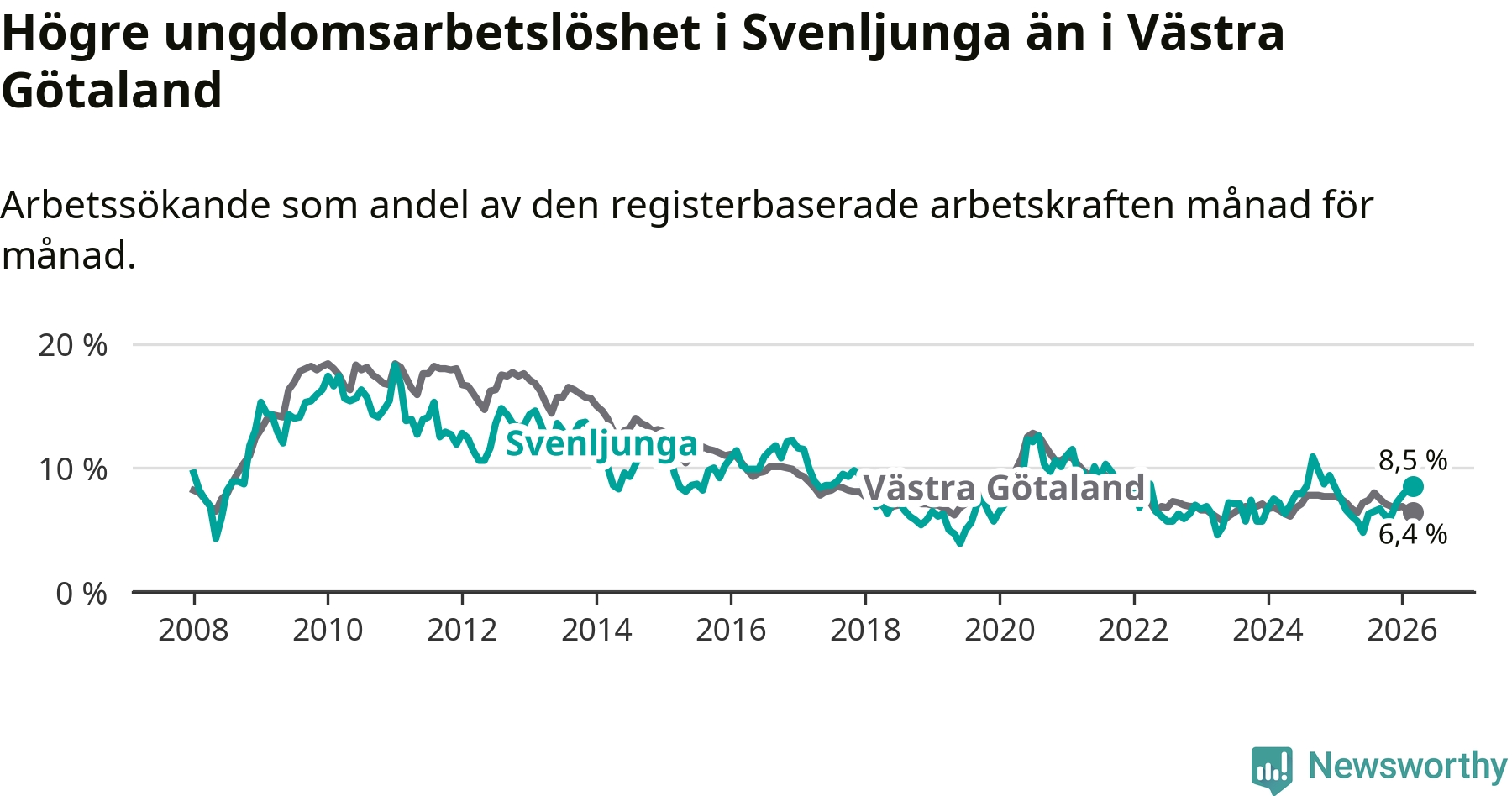 Medan Svenljunga har lägre total arbetslöshet än Västra Götaland, ligger ungdomsarbetslösheten 2,1 procentenheter högre i Svenljunga.