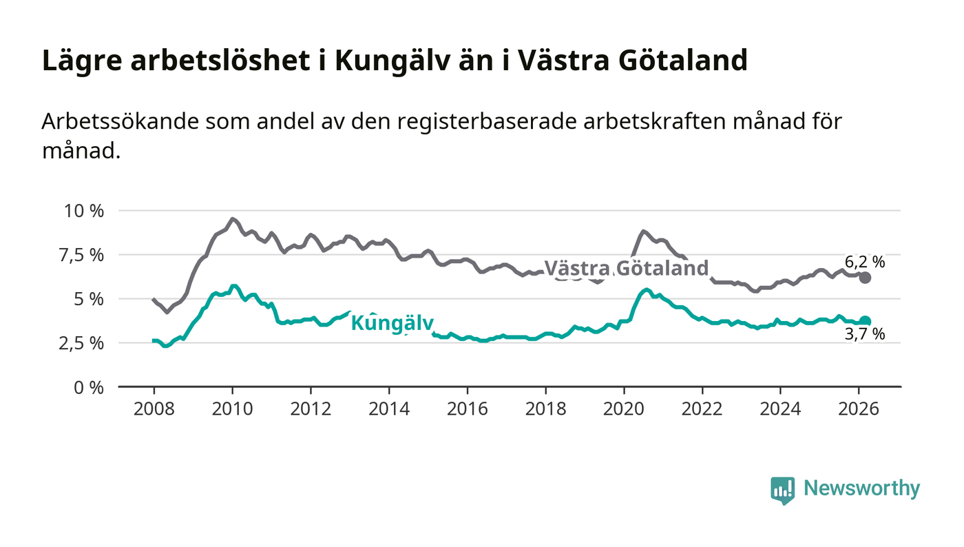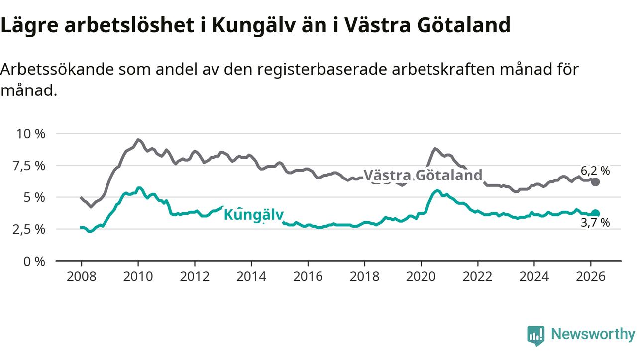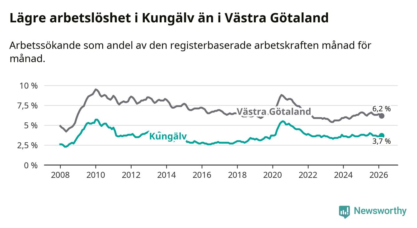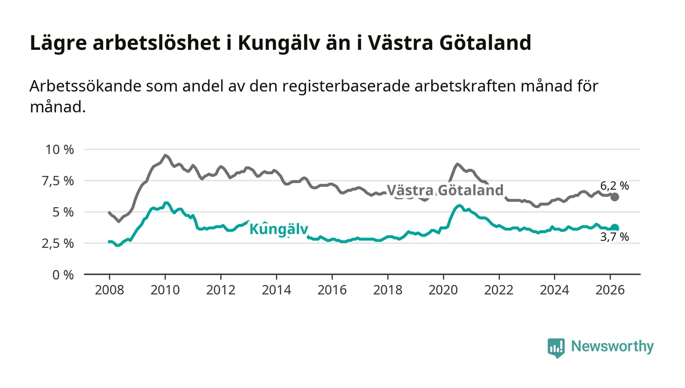 Under mars månad rapporterade Kungälvs kommun en total arbetslöshet på 3,7 procent. Det är en minskning jämfört med samma tidpunkt i fjol (−0,1 procentenheter). Även i Västra Götalands län sjunker arbetslösheten .