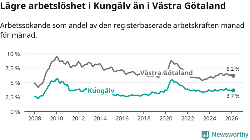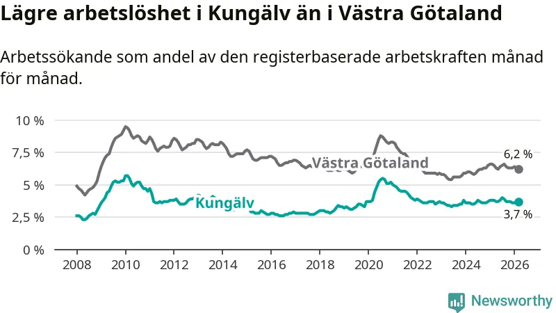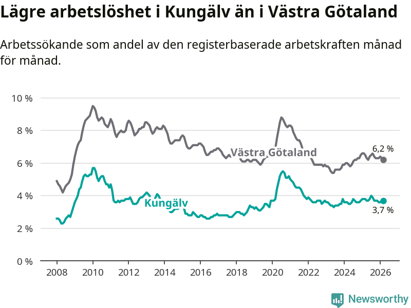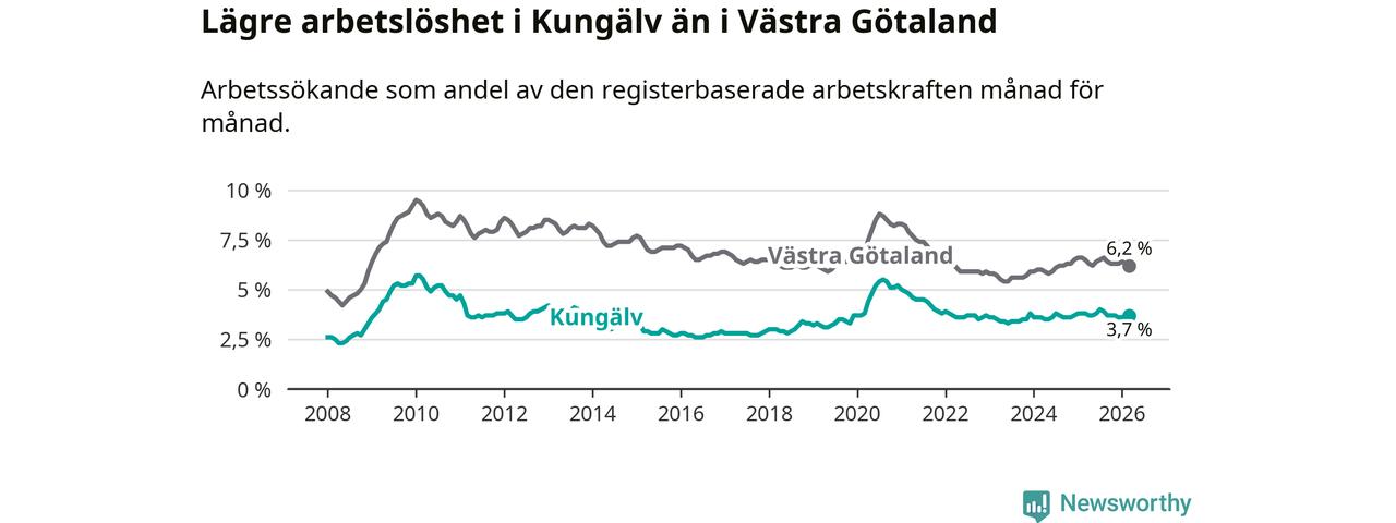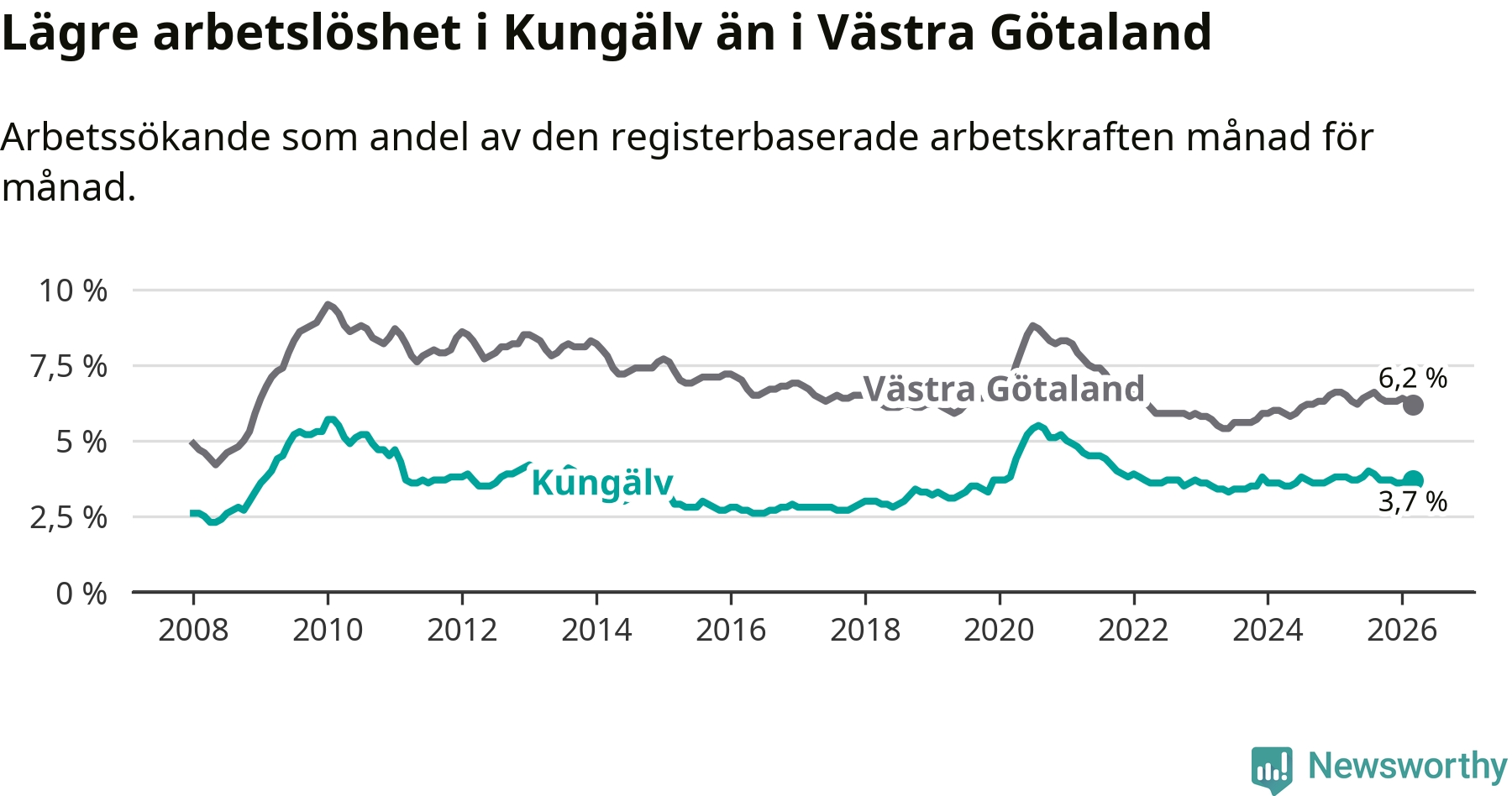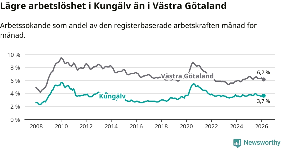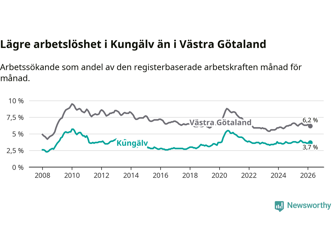 Under mars månad rapporterade Kungälvs kommun en total arbetslöshet på 3,7 procent. Det är en minskning jämfört med samma tidpunkt i fjol (−0,1 procentenheter). Även i Västra Götalands län sjunker arbetslösheten .