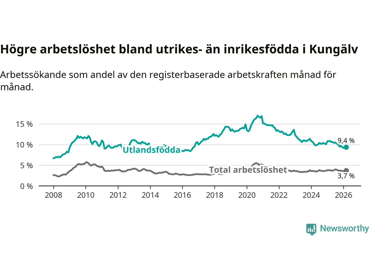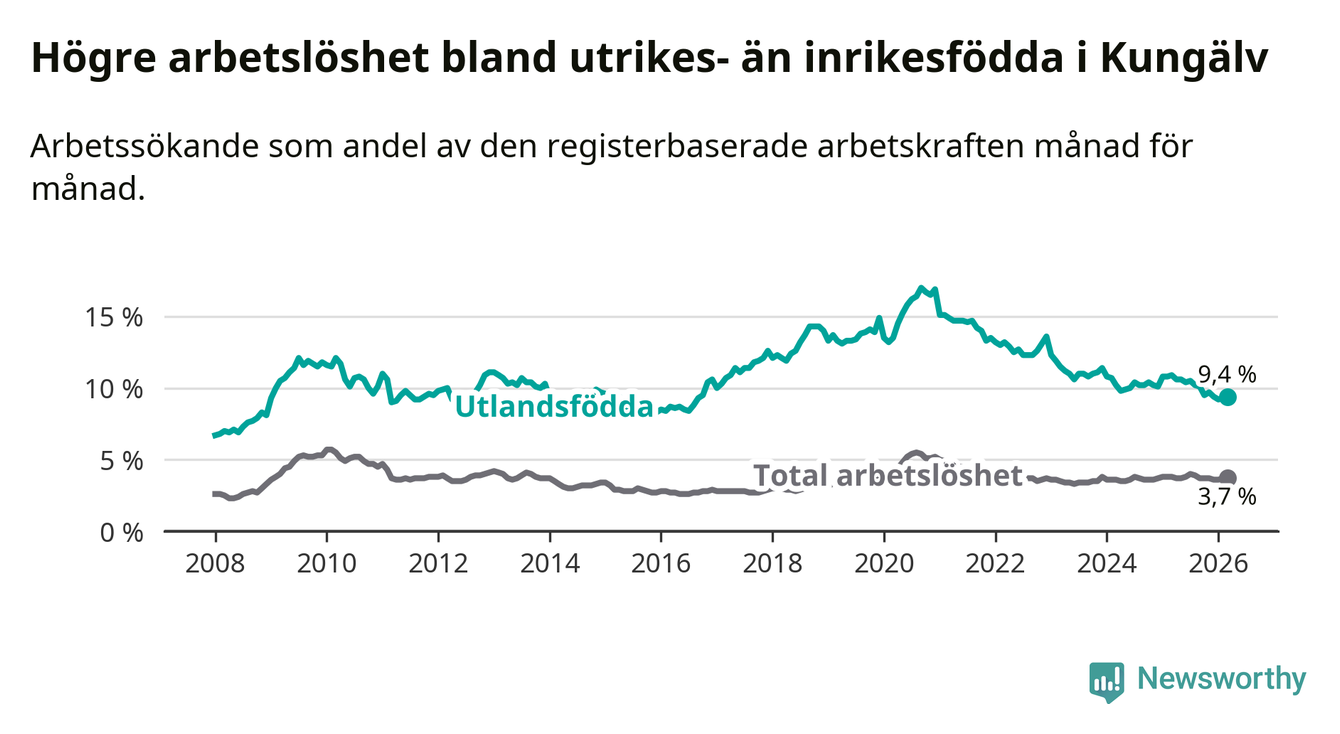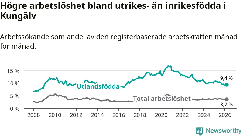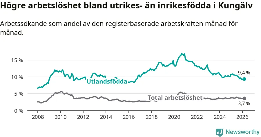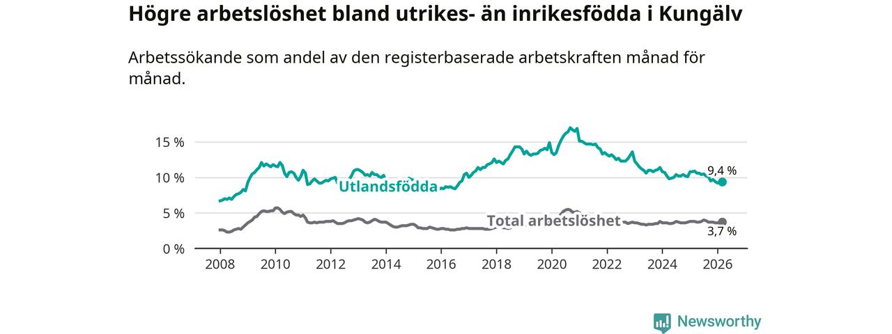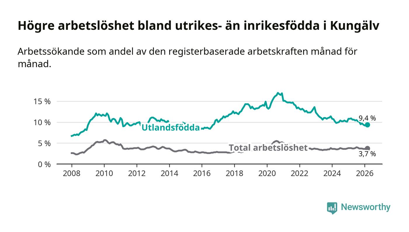 Skillnaden i arbetslöshet mellan utrikesfödda och hela befolkningen är 5,7 procentenheter i Kungälv. Det är en mindre skillnad än för ett år sedan (−1,4 procentenheter).