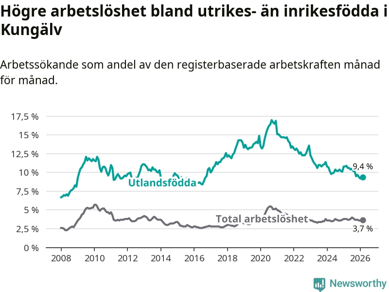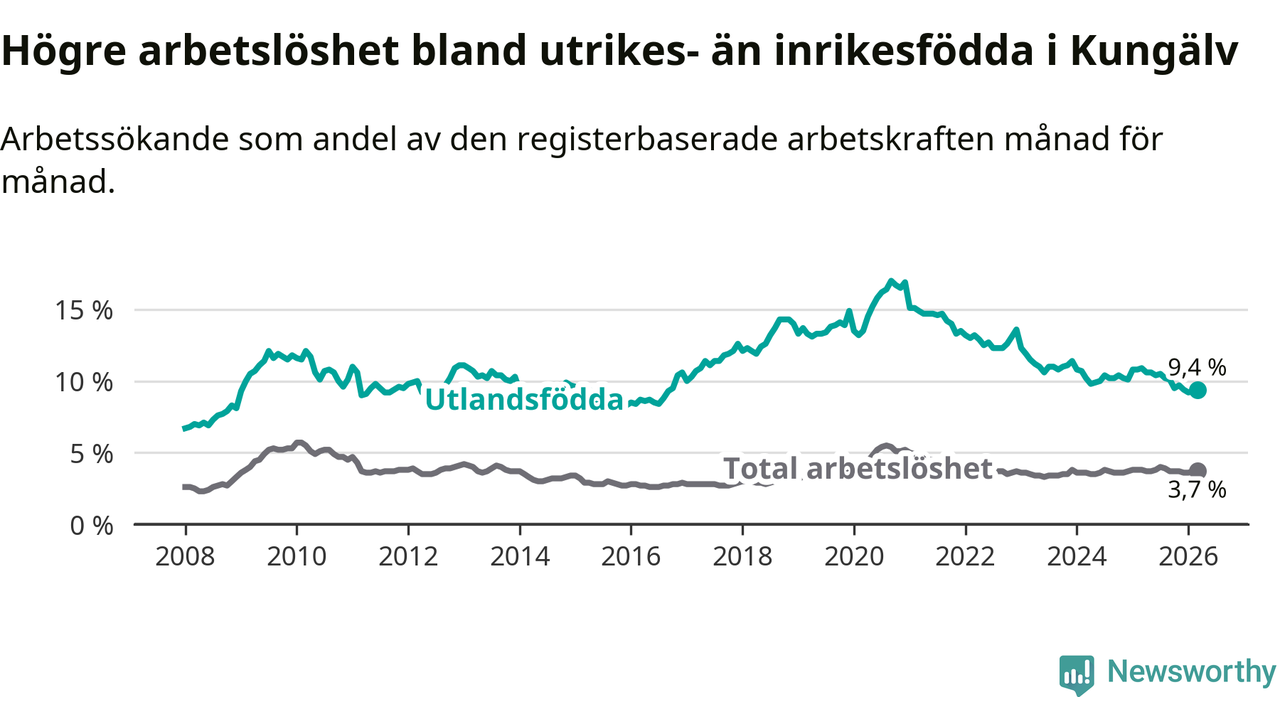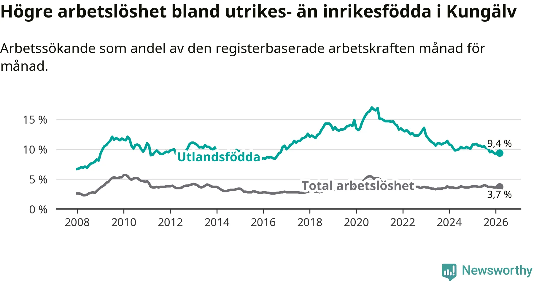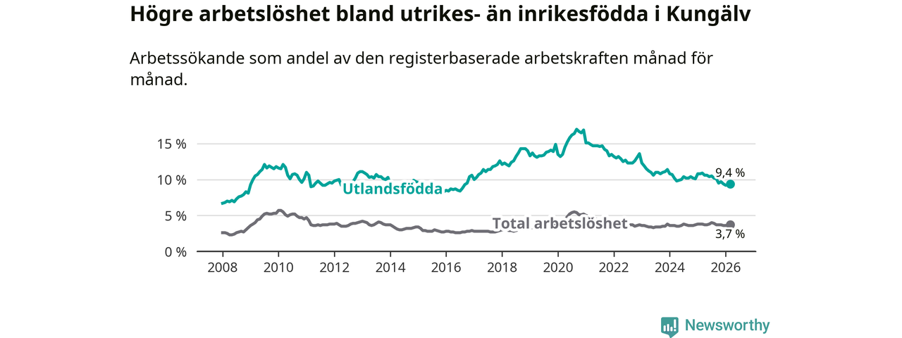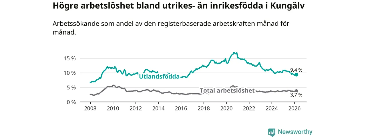 Skillnaden i arbetslöshet mellan utrikesfödda och hela befolkningen är 5,7 procentenheter i Kungälv. Det är en mindre skillnad än för ett år sedan (−1,4 procentenheter).