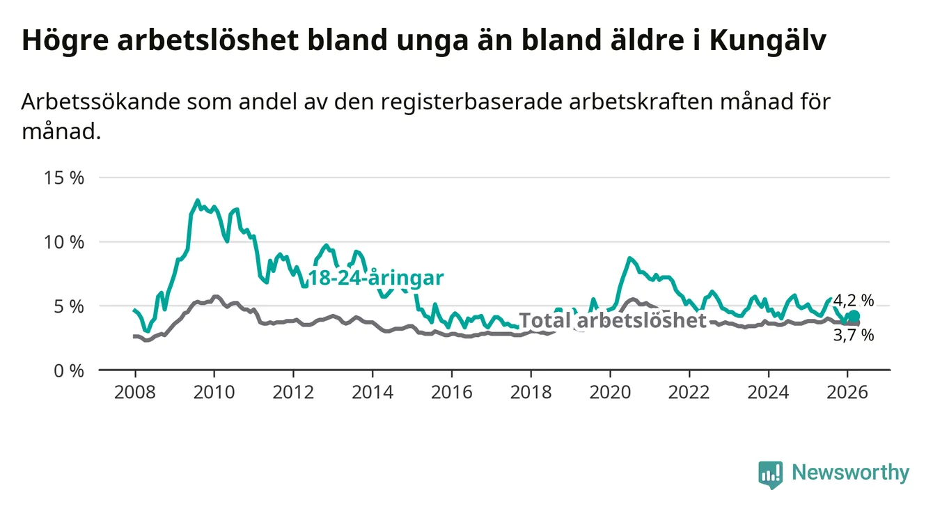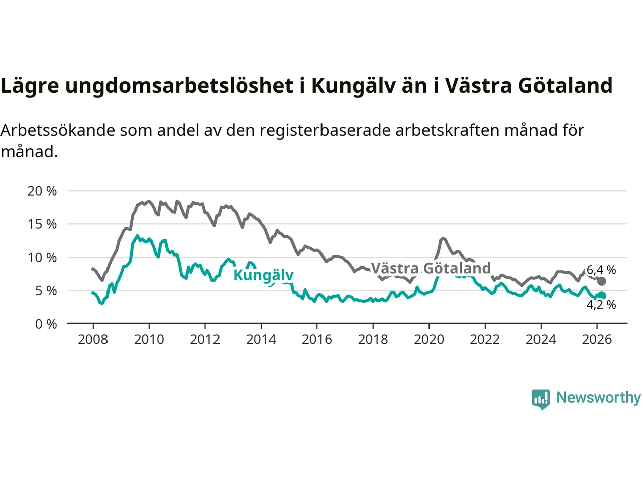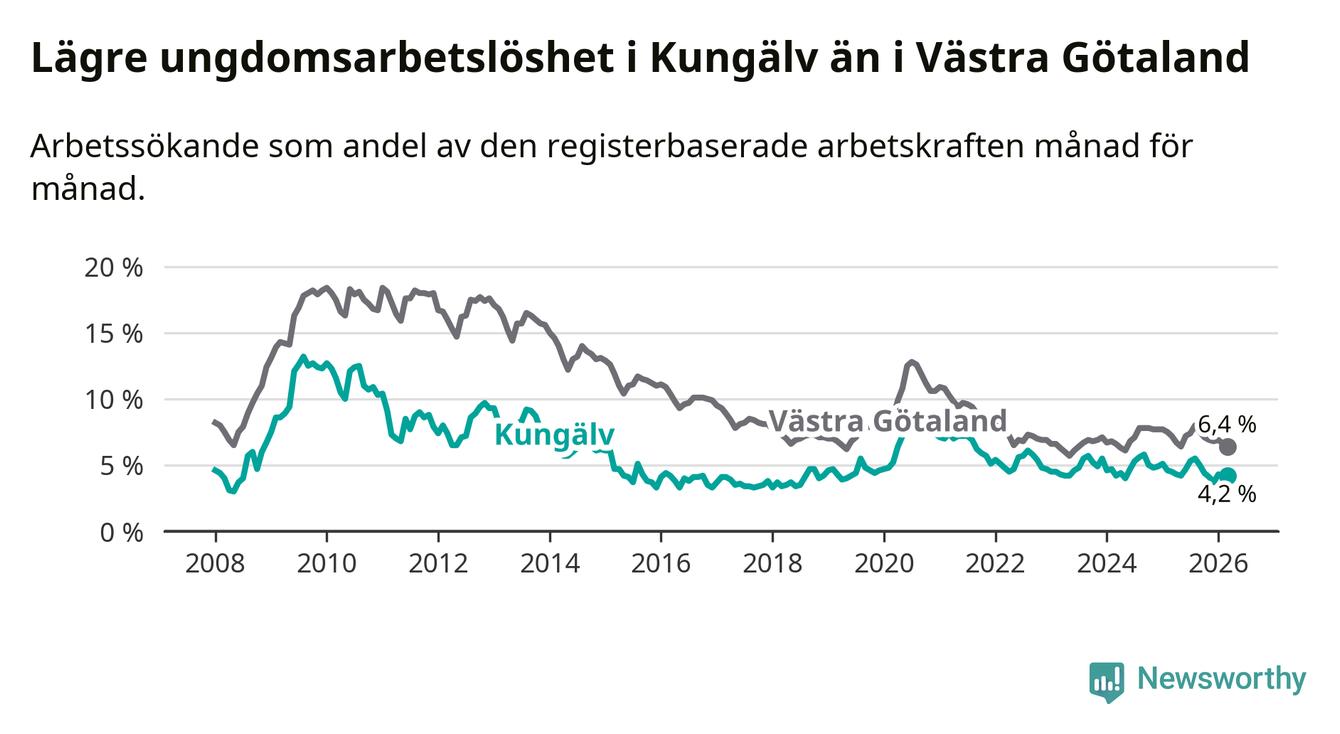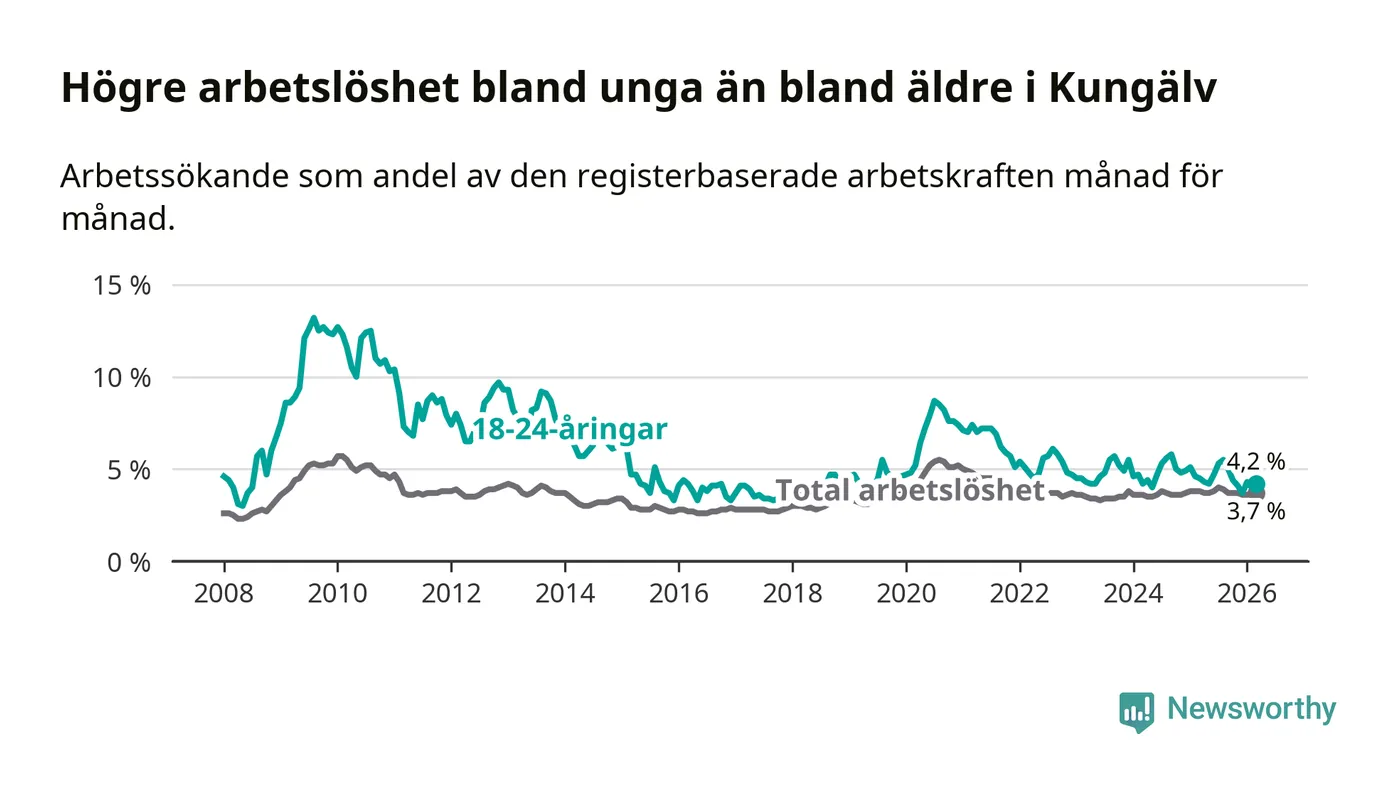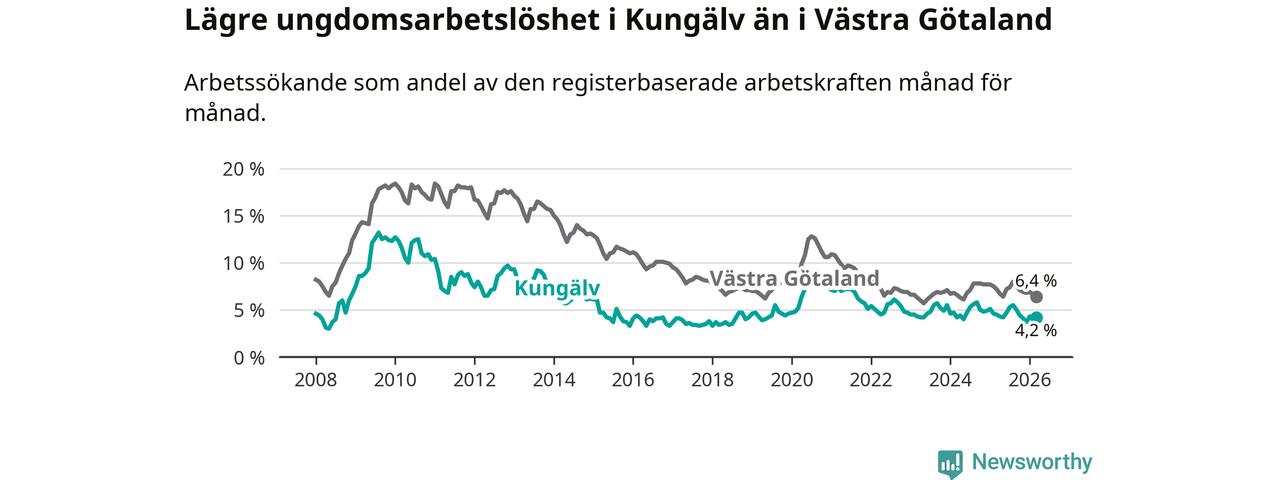 I och med den senaste månadens nedgång har de ungas arbetslöshet i Kungälv sjunkit åtta månader i följd (ner från 5,3 procent i juli 2025 till 4,2 procent nu).