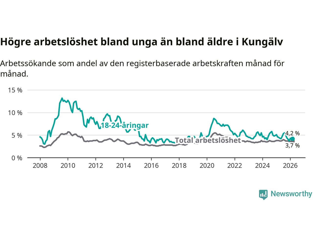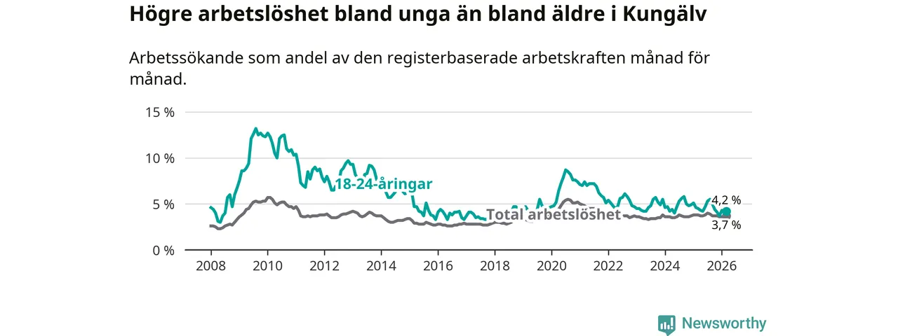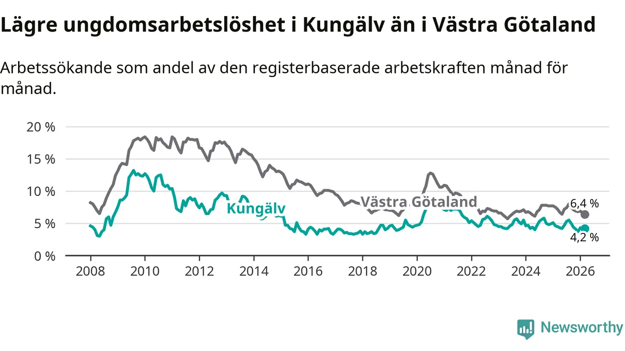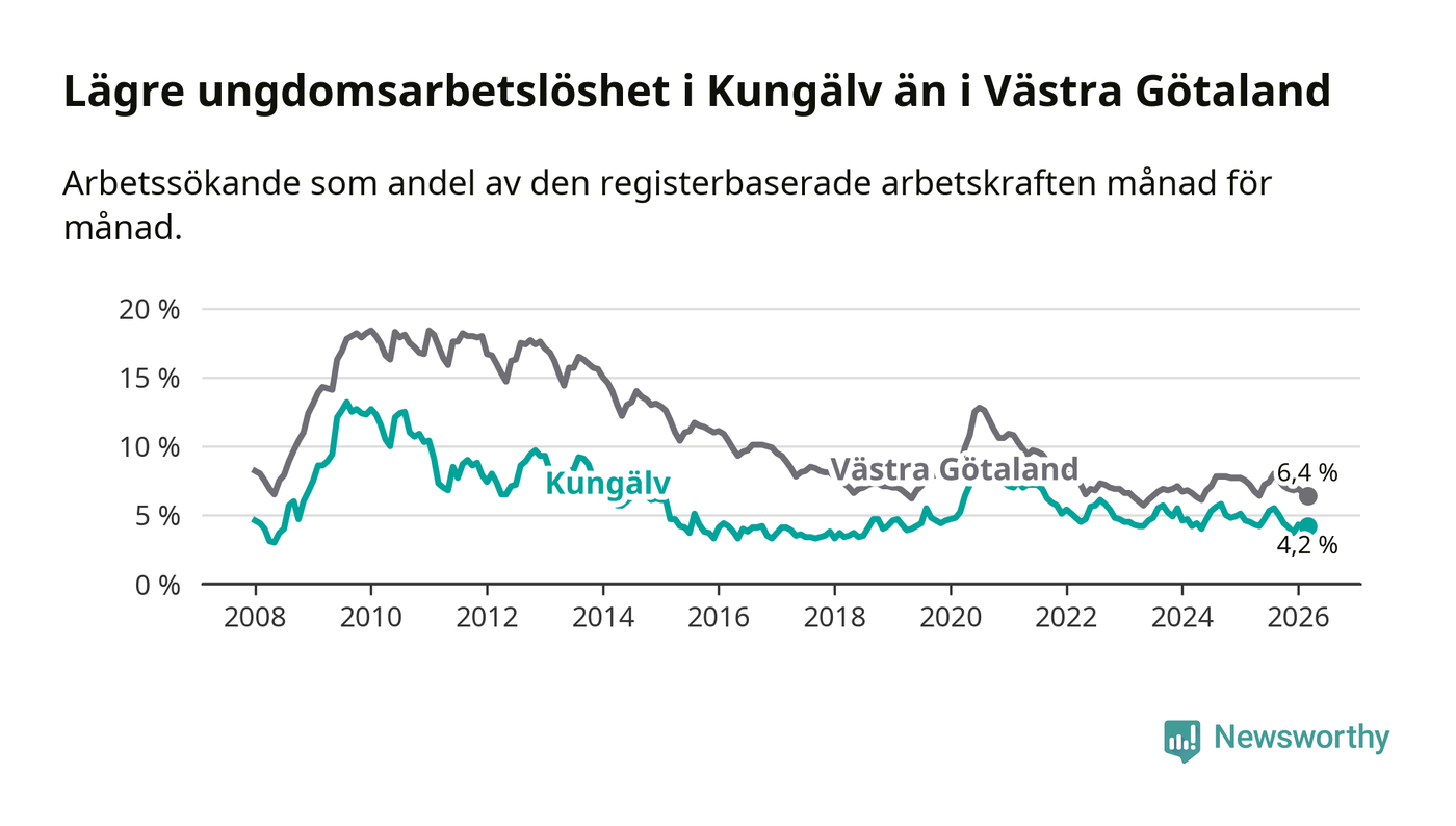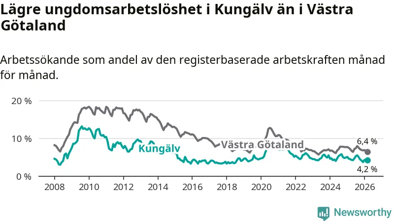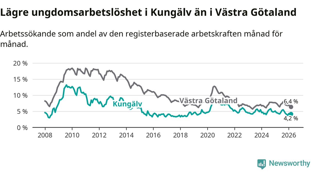 I och med den senaste månadens nedgång har de ungas arbetslöshet i Kungälv sjunkit åtta månader i följd (ner från 5,3 procent i juli 2025 till 4,2 procent nu).