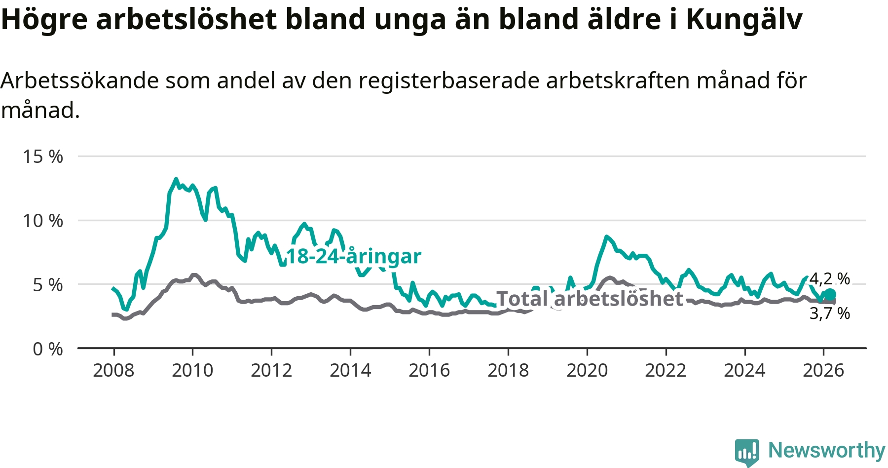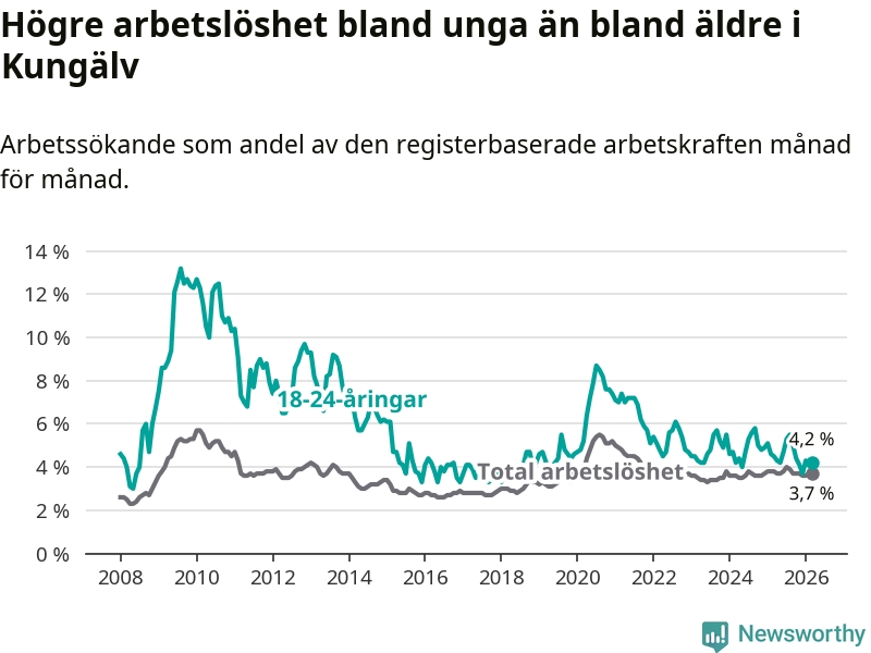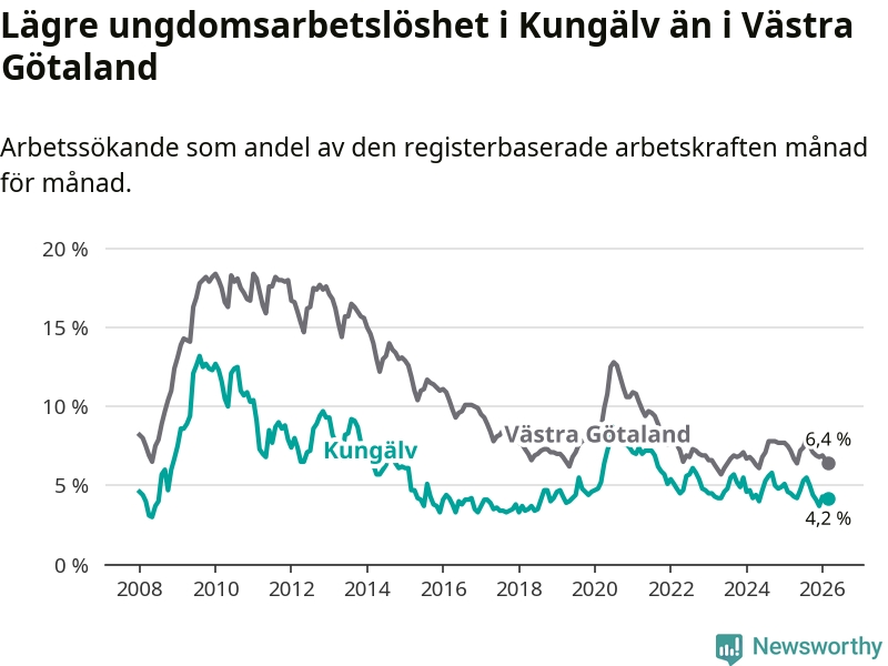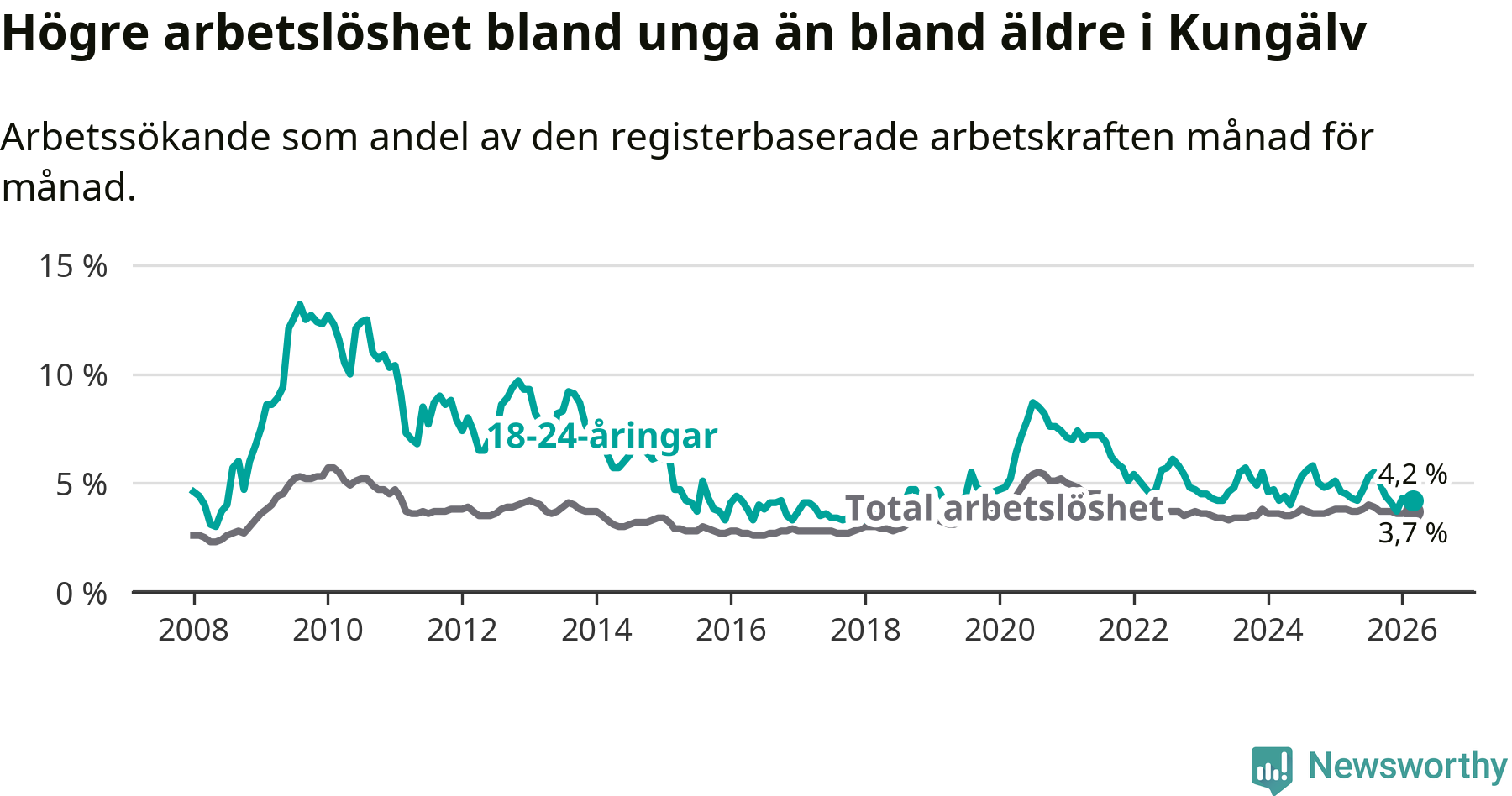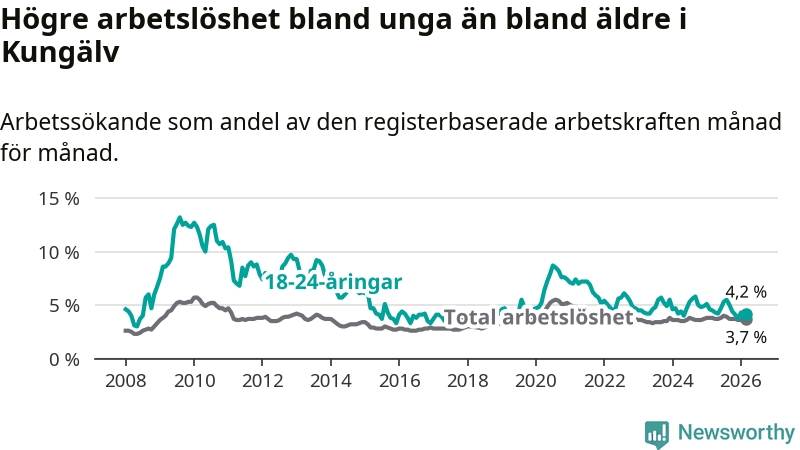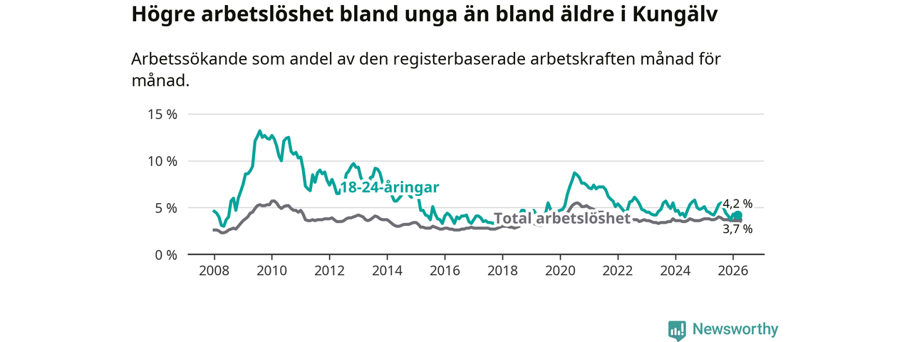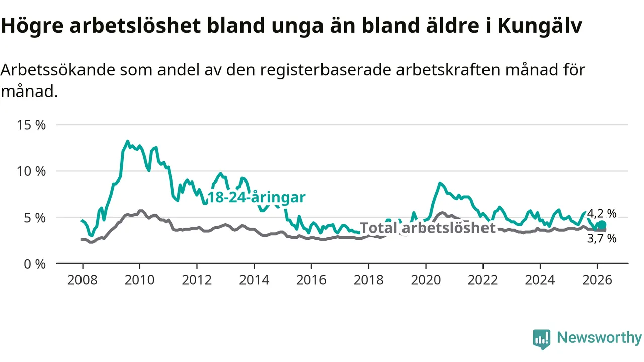 I och med den senaste månadens nedgång har de ungas arbetslöshet i Kungälv sjunkit åtta månader i följd (ner från 5,3 procent i juli 2025 till 4,2 procent nu).