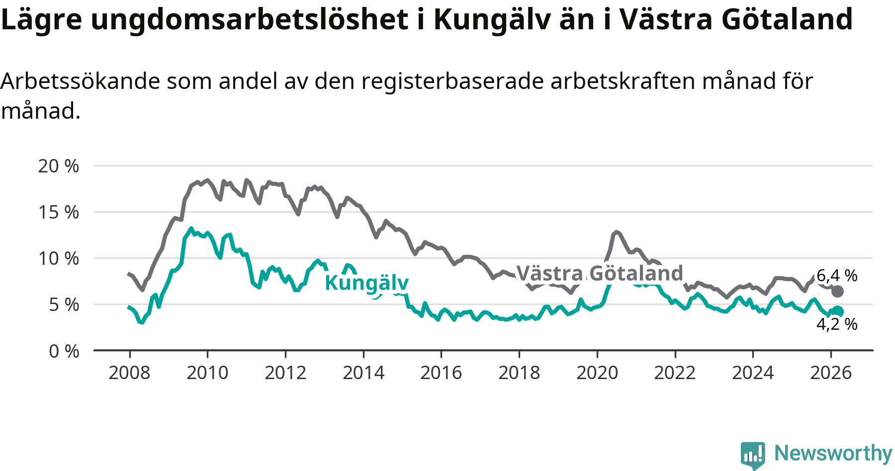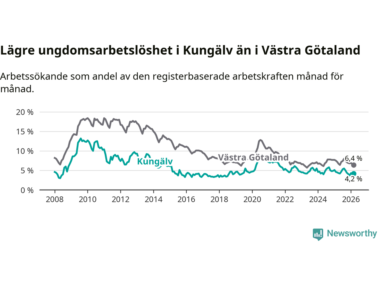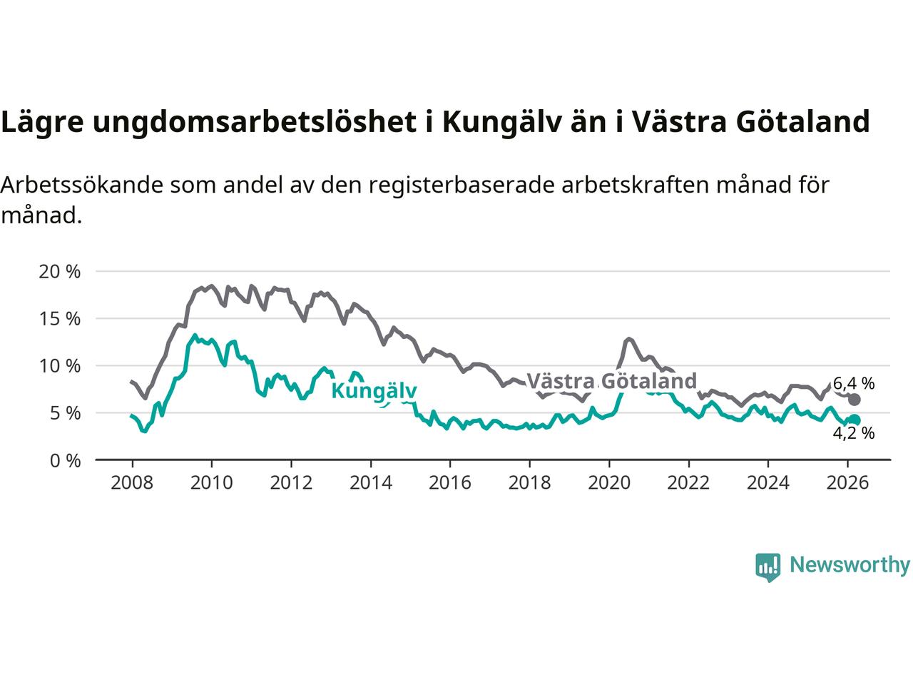 Precis som den totala arbetslösheten ligger ungdomsarbetslösheten i Kungälv lägre än i Västra Götaland som helhet. Skillnaden mellan kommunen och länet är 2,2 procentenheter.