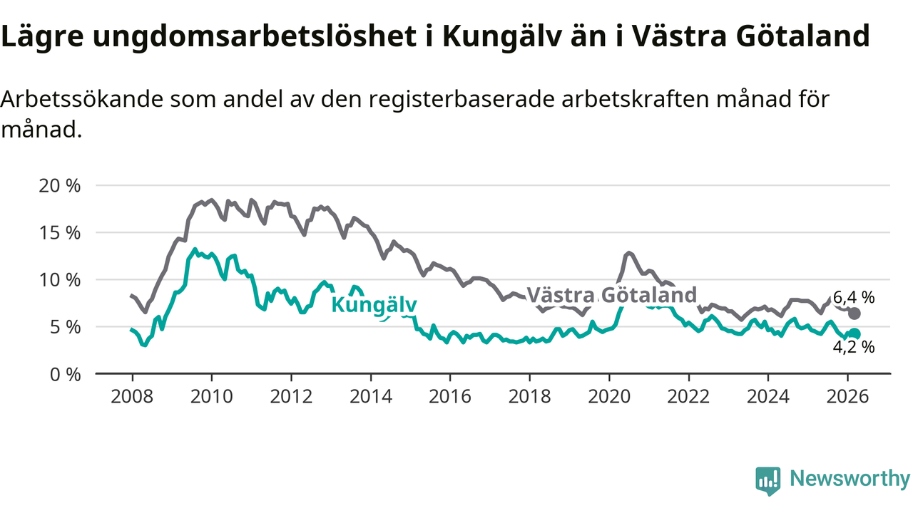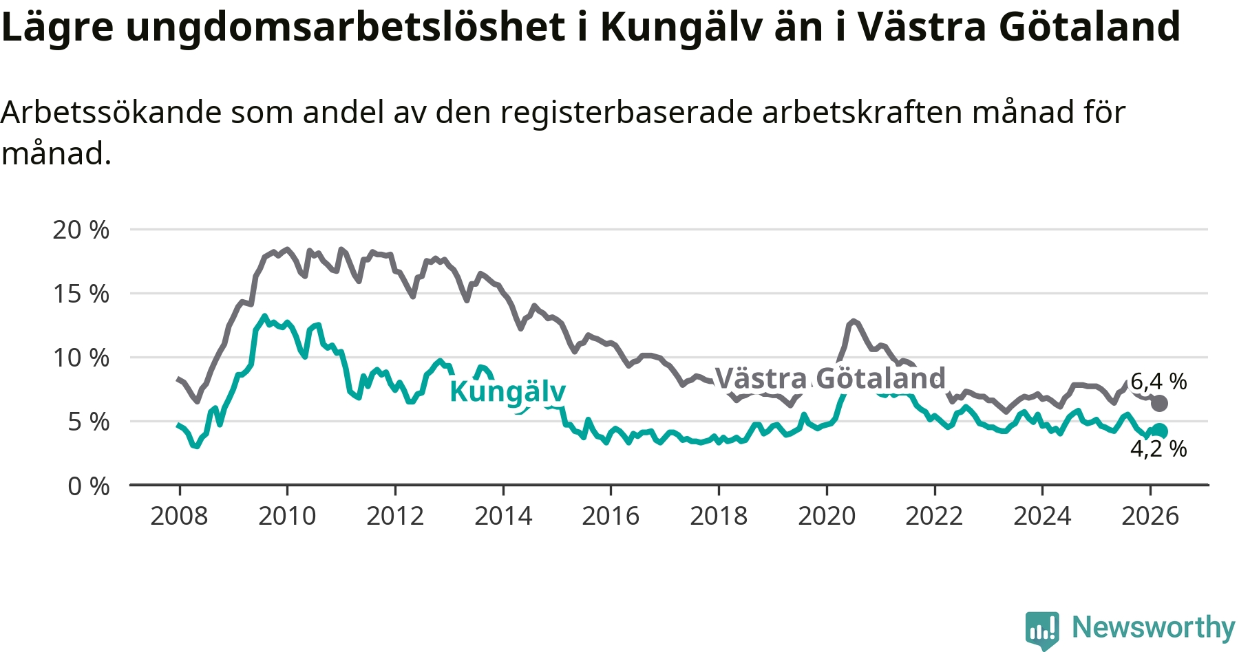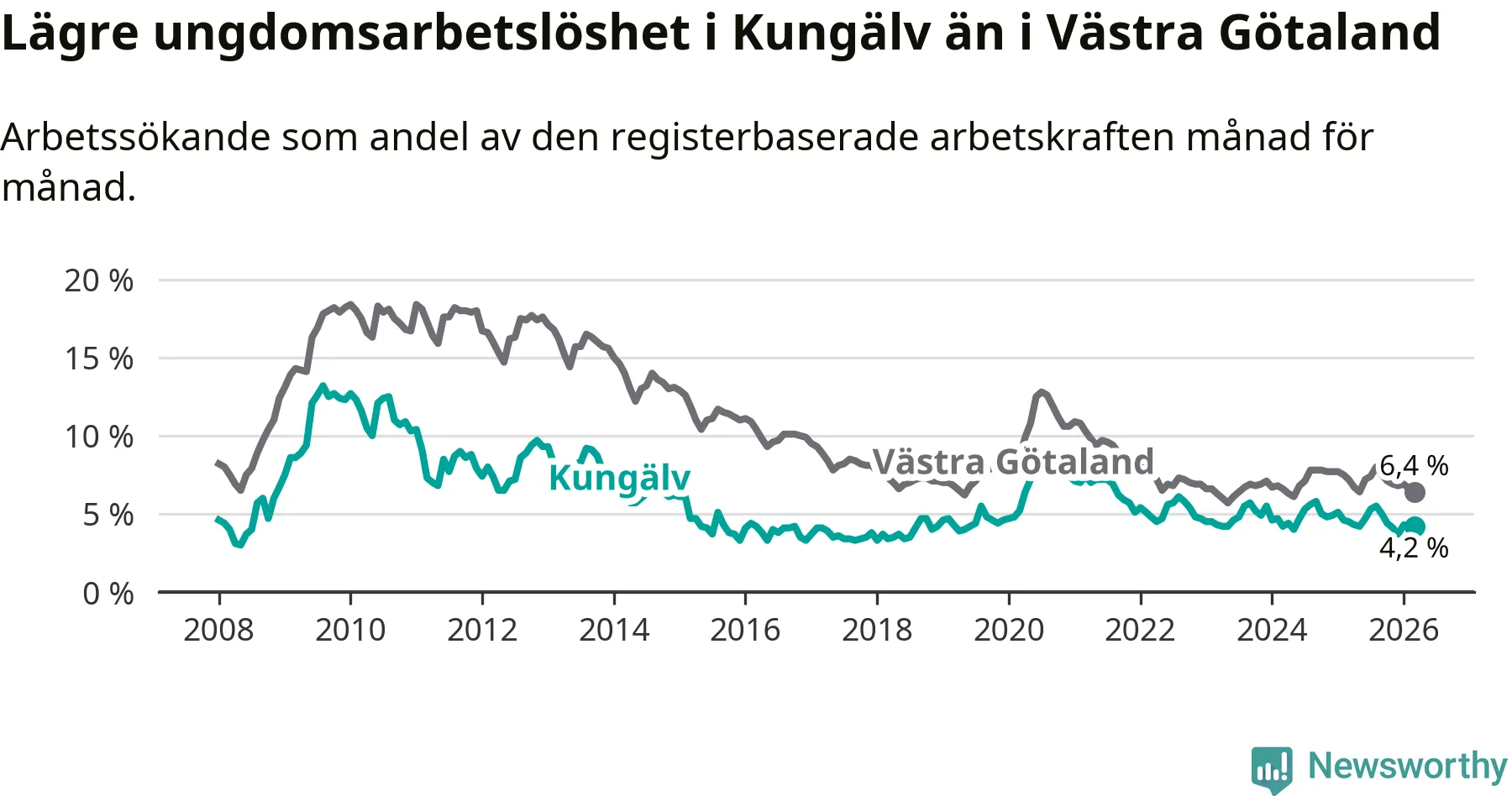 Precis som den totala arbetslösheten ligger ungdomsarbetslösheten i Kungälv lägre än i Västra Götaland som helhet. Skillnaden mellan kommunen och länet är 2,2 procentenheter.