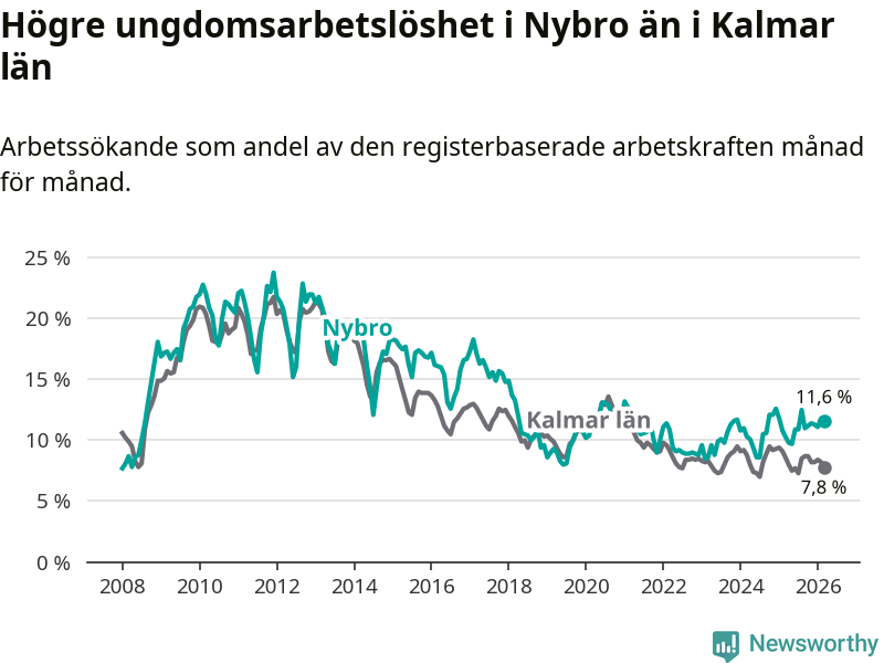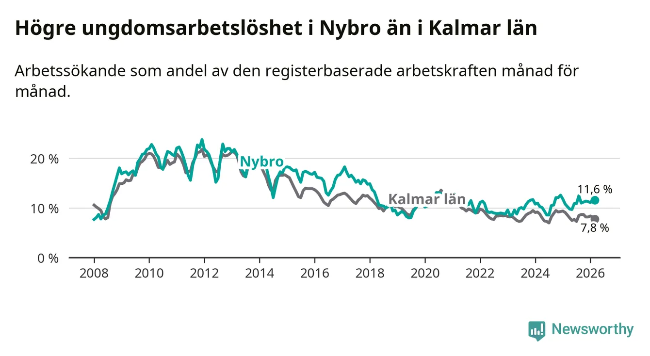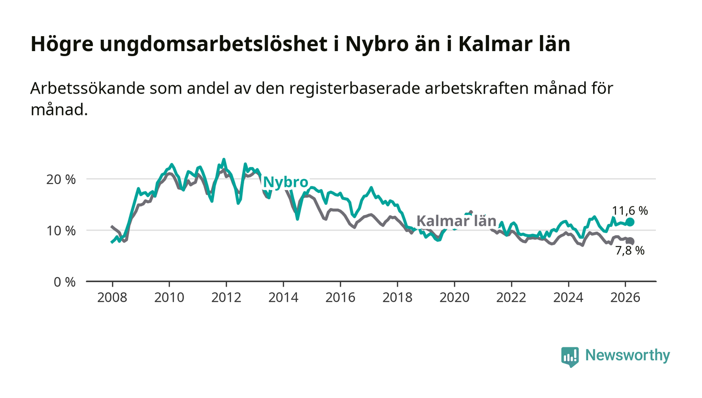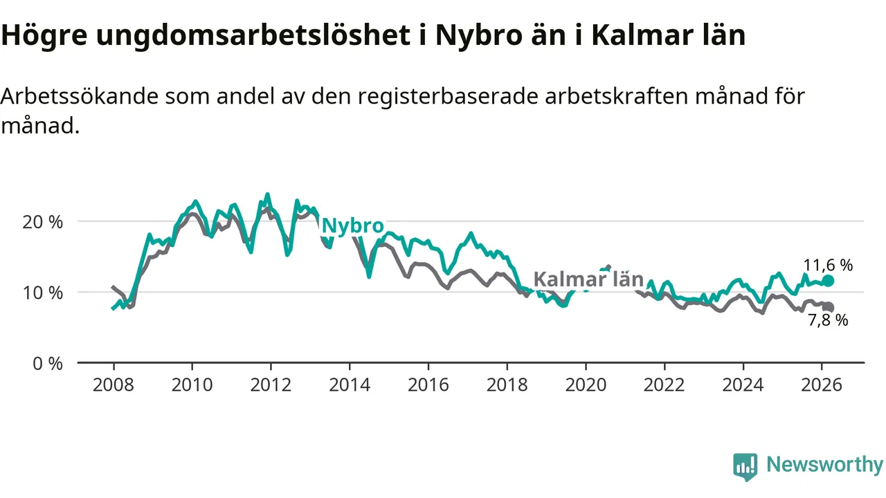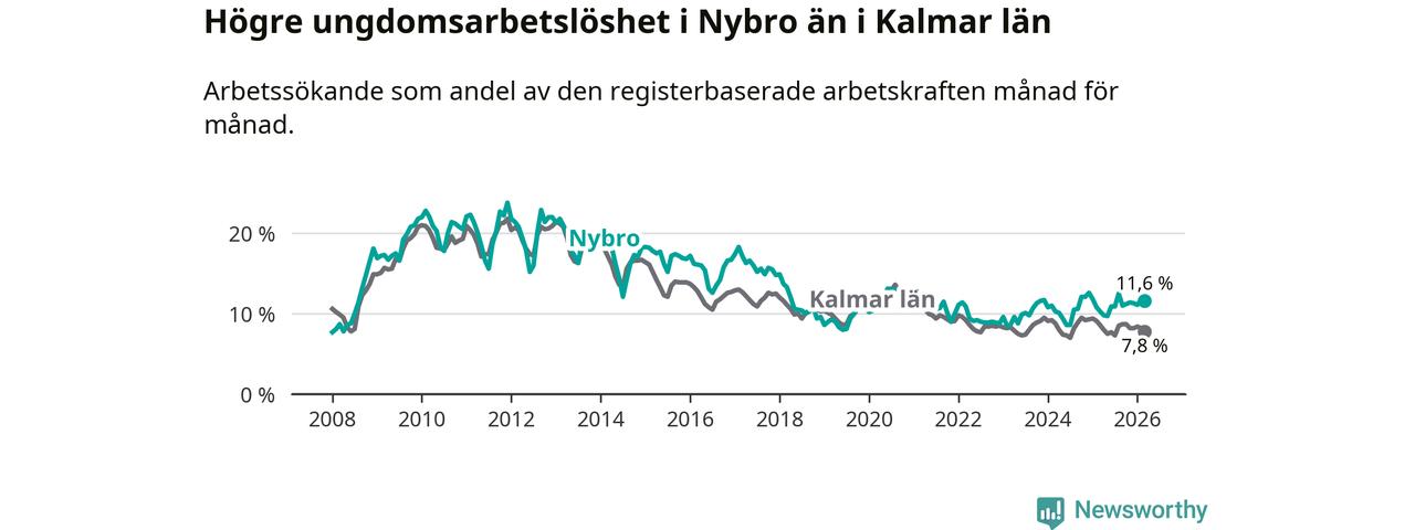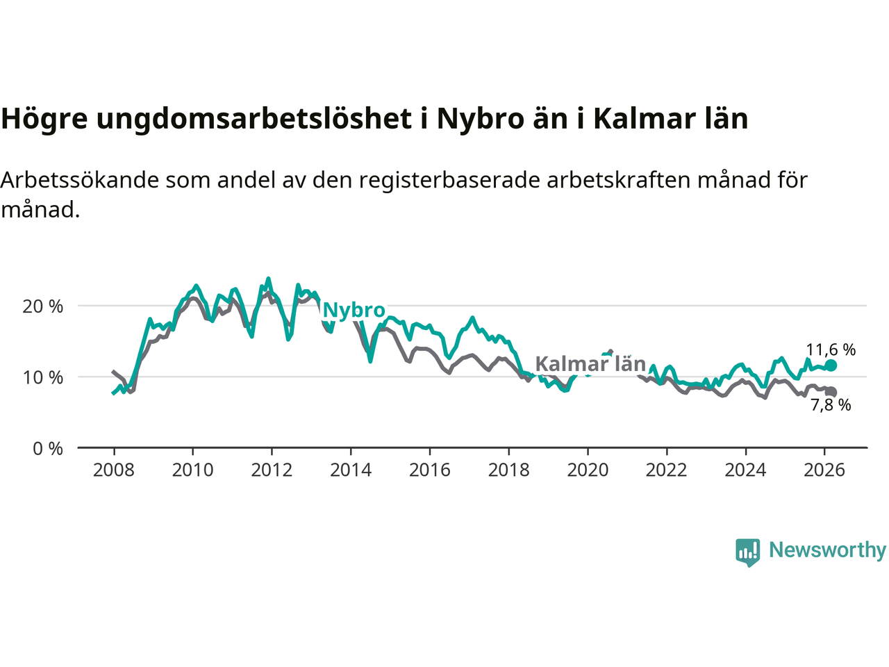 Precis som den totala arbetslösheten ligger ungdomsarbetslösheten i Nybro högre än i Kalmar län som helhet. Skillnaden mellan kommunen och länet är 3,8 procentenheter.