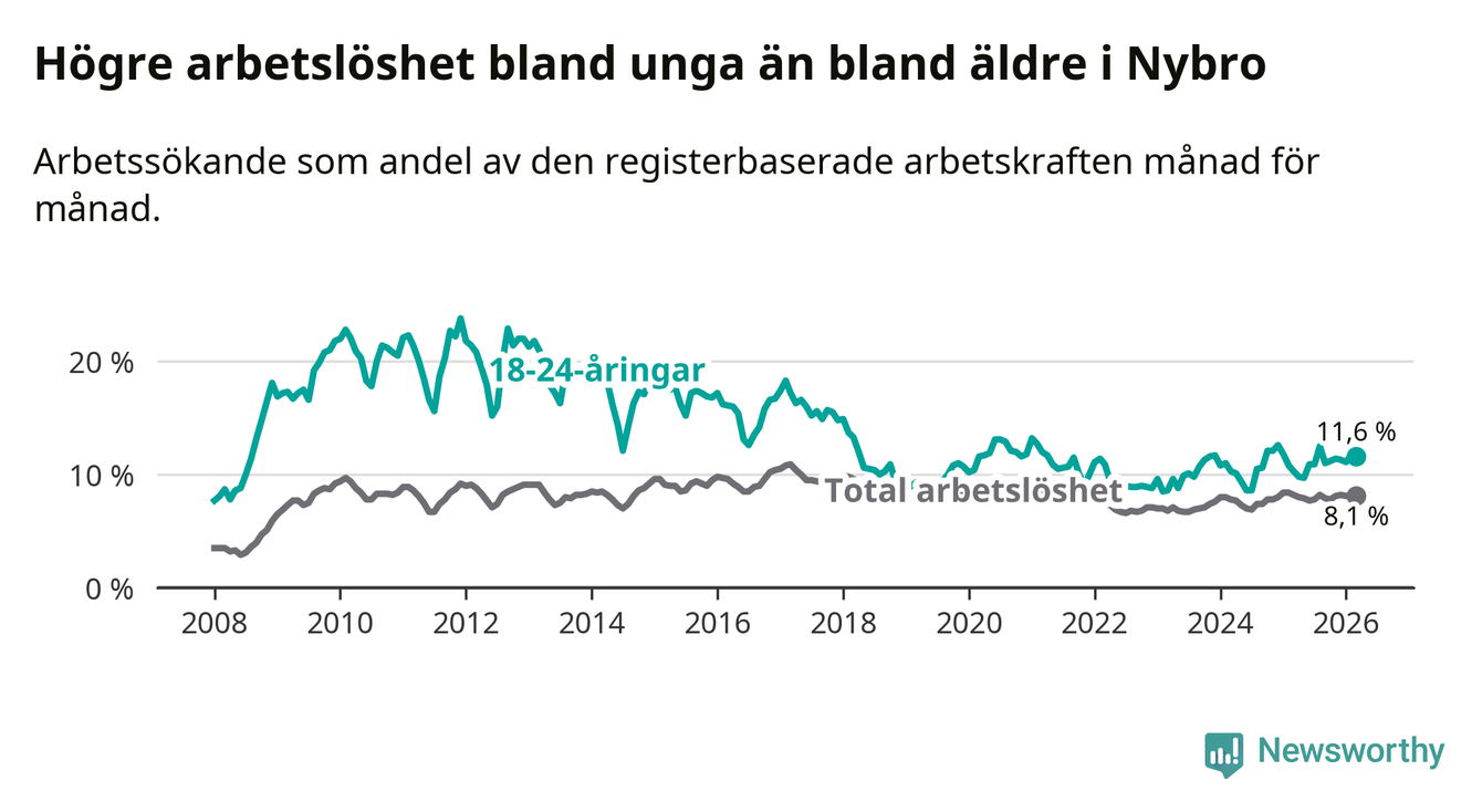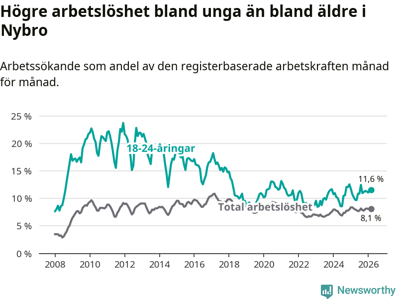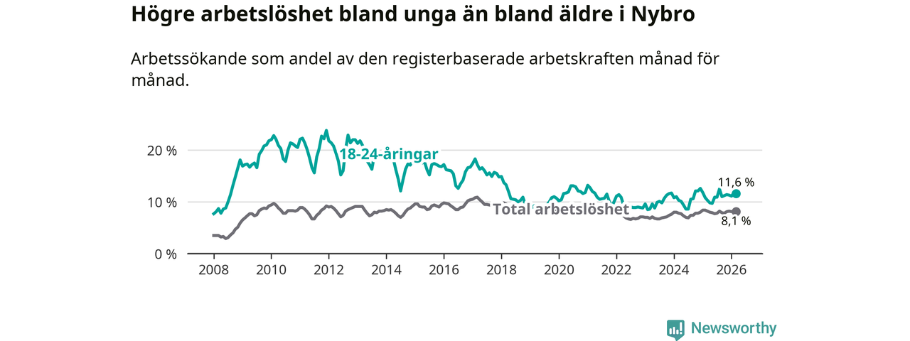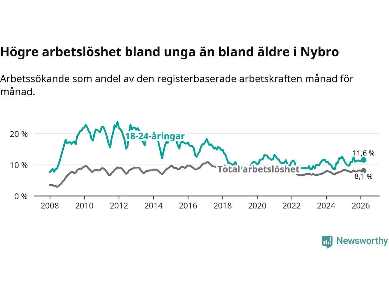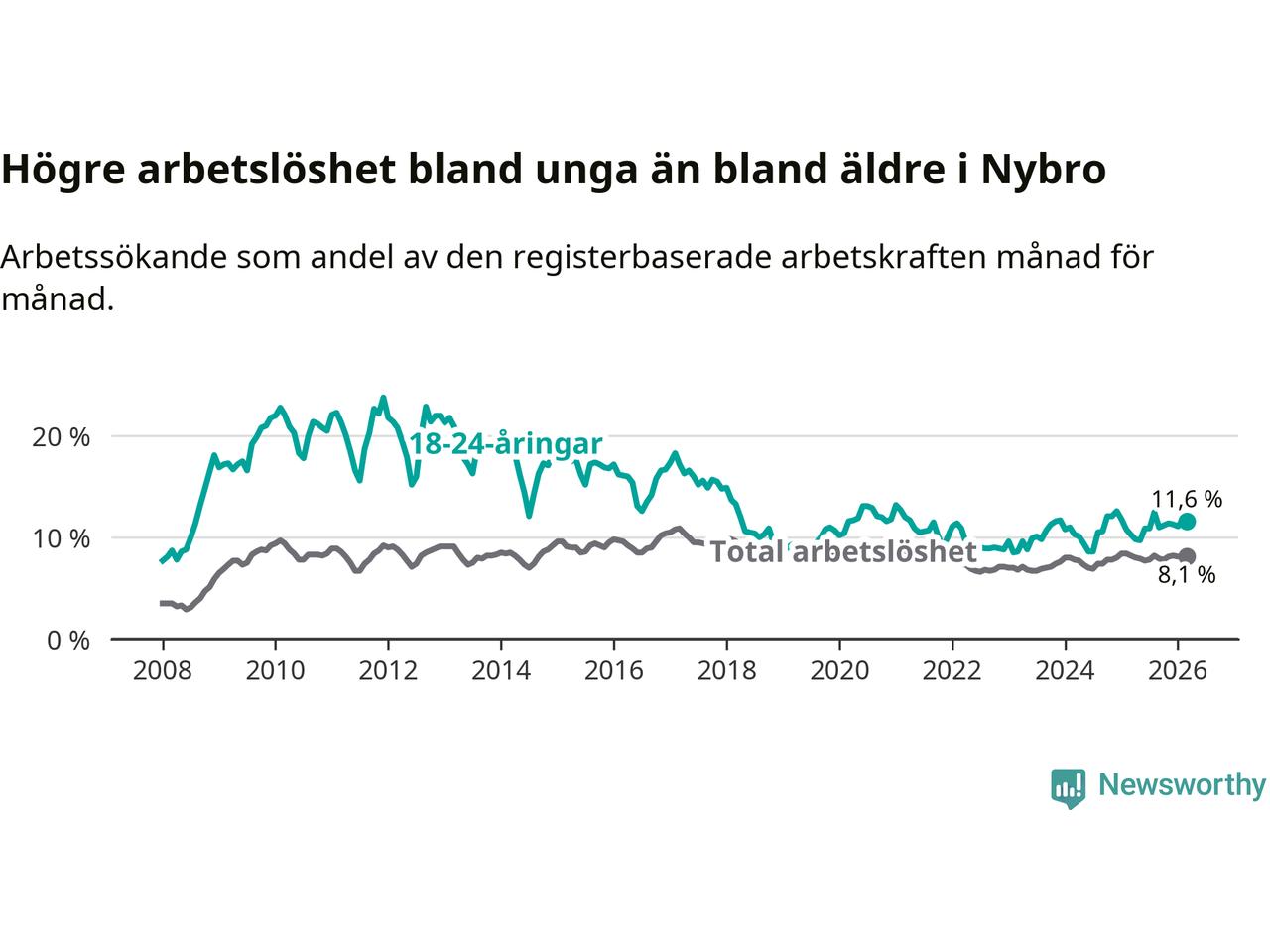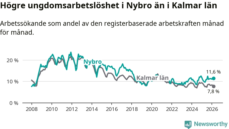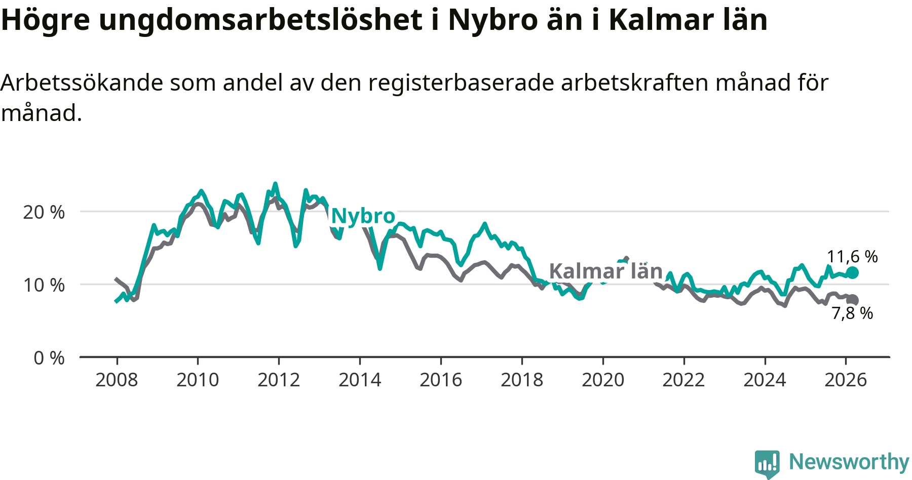 Precis som den totala arbetslösheten ligger ungdomsarbetslösheten i Nybro högre än i Kalmar län som helhet. Skillnaden mellan kommunen och länet är 3,8 procentenheter.