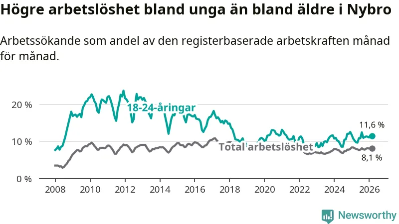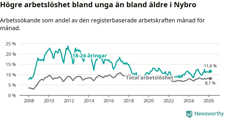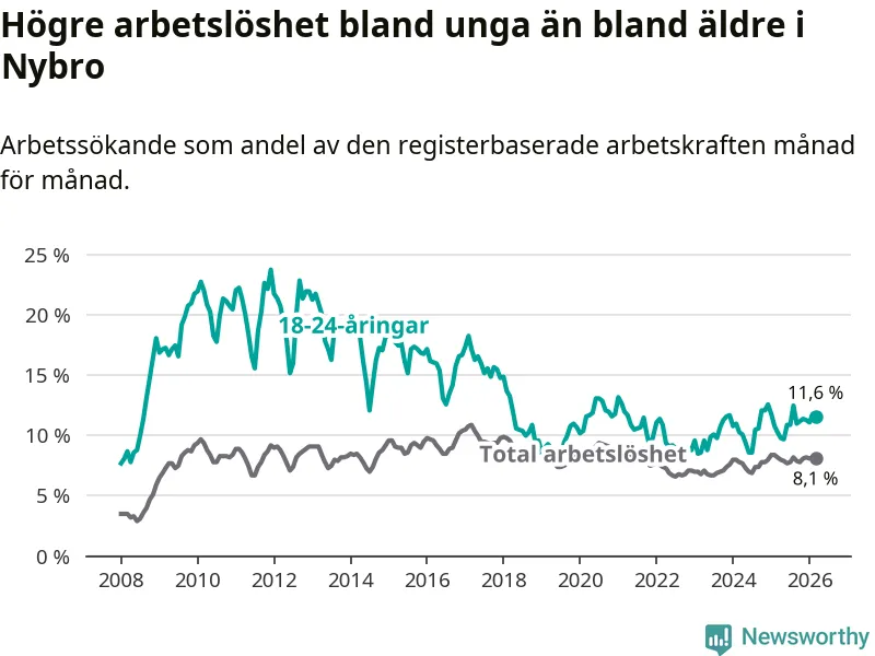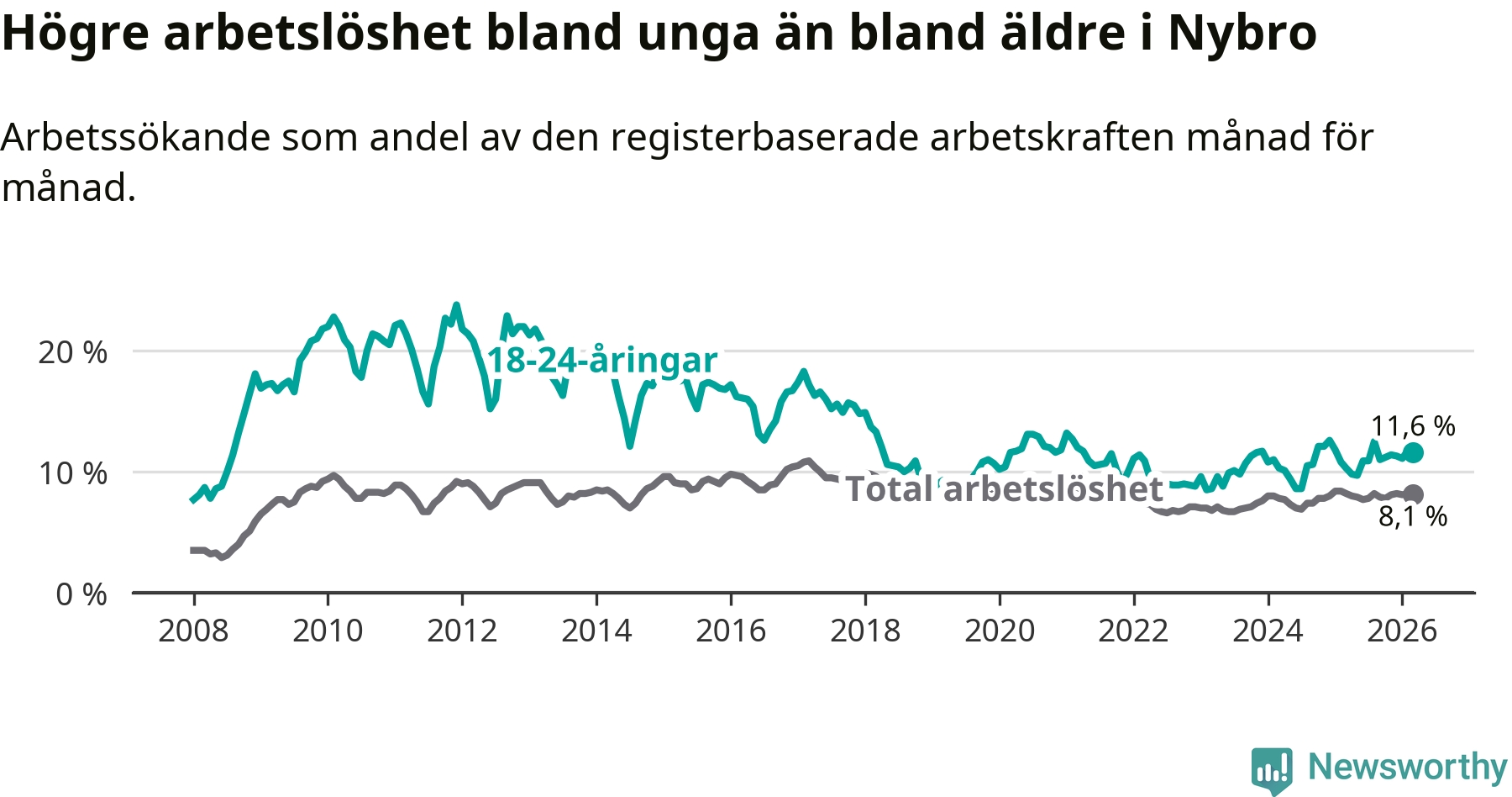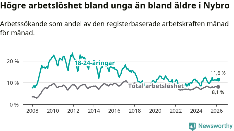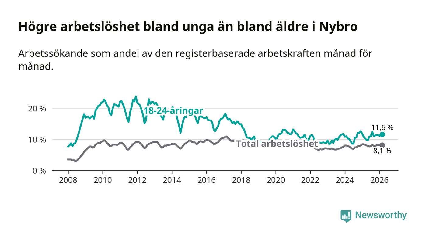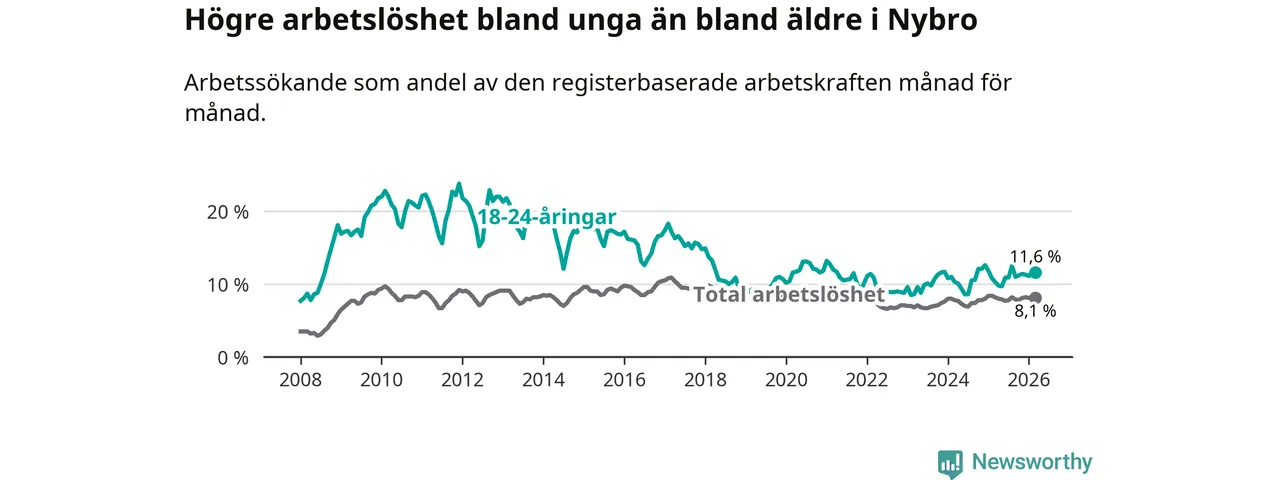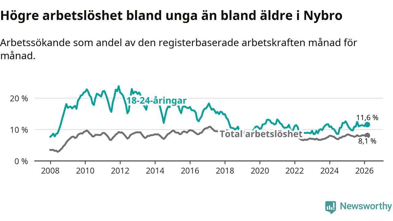 Precis som den totala arbetslösheten ligger ungdomsarbetslösheten i Nybro högre än i Kalmar län som helhet. Skillnaden mellan kommunen och länet är 3,8 procentenheter.