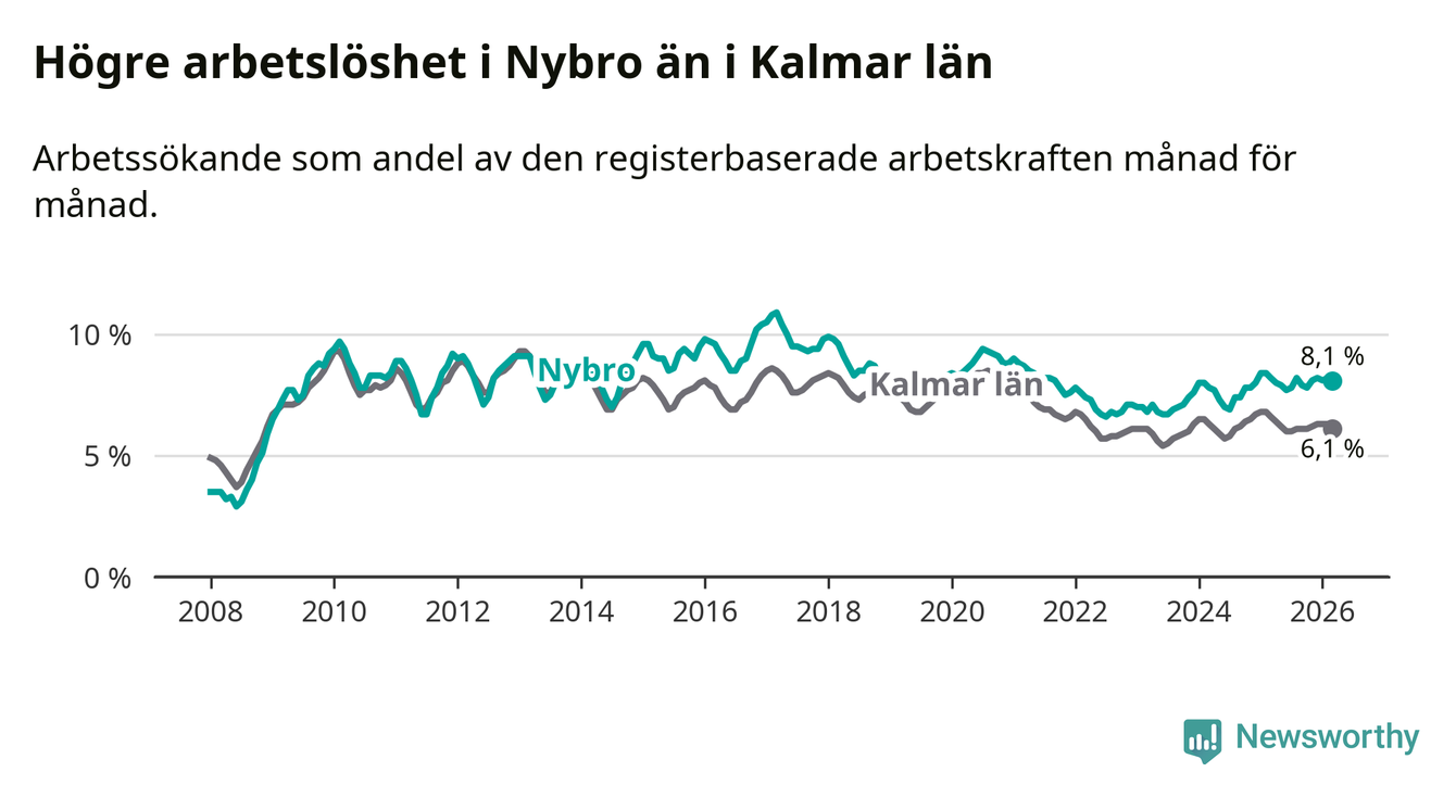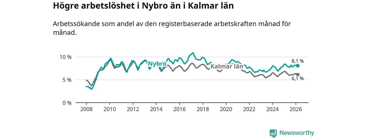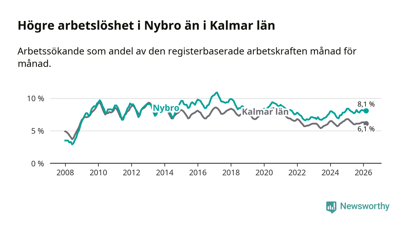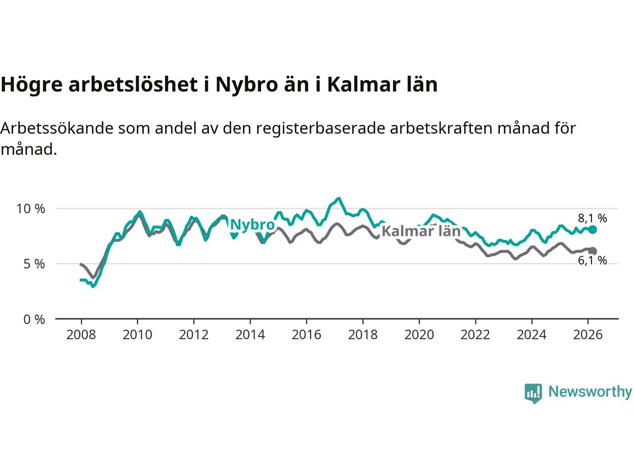 Under mars månad rapporterade Nybro kommun en total arbetslöshet på 8,1 procent. Det är en minskning jämfört med samma tidpunkt i fjol (−0,1 procentenheter). Även i Kalmar län sjunker arbetslösheten .