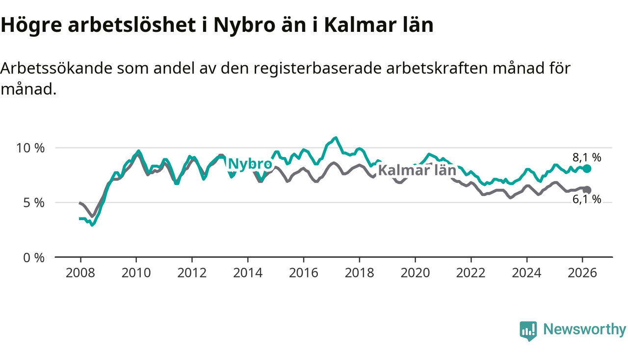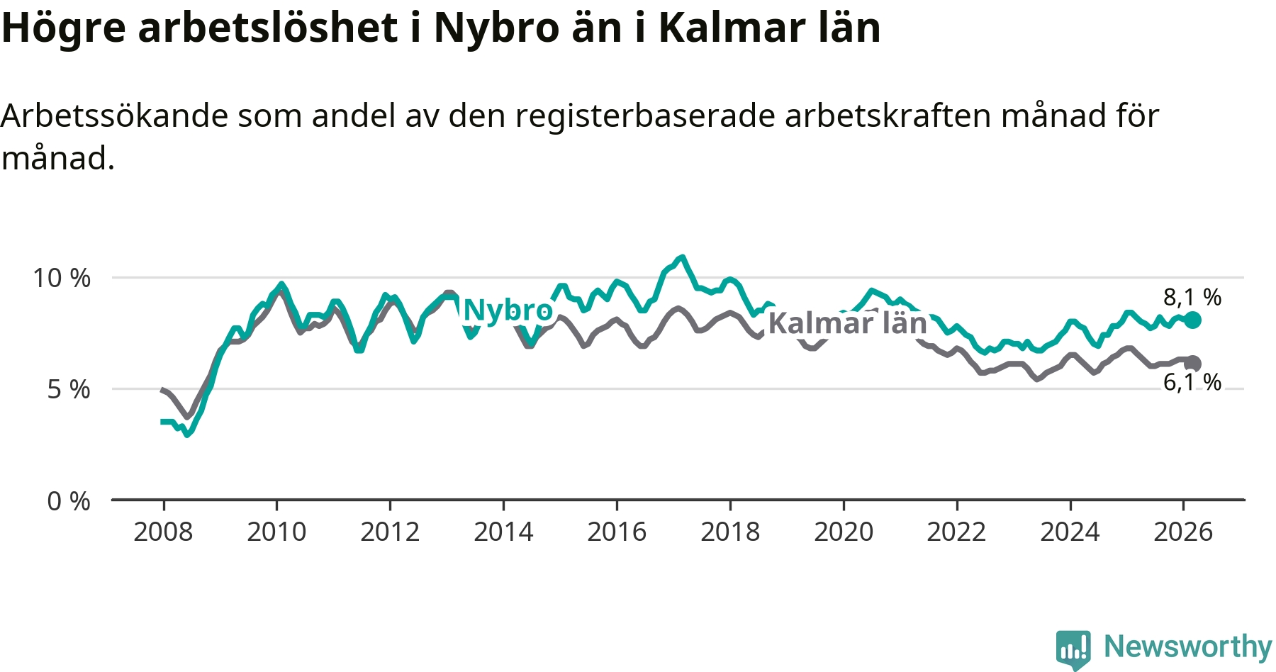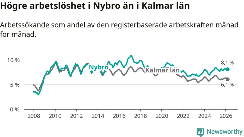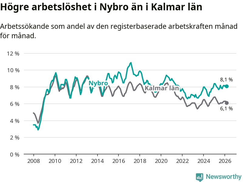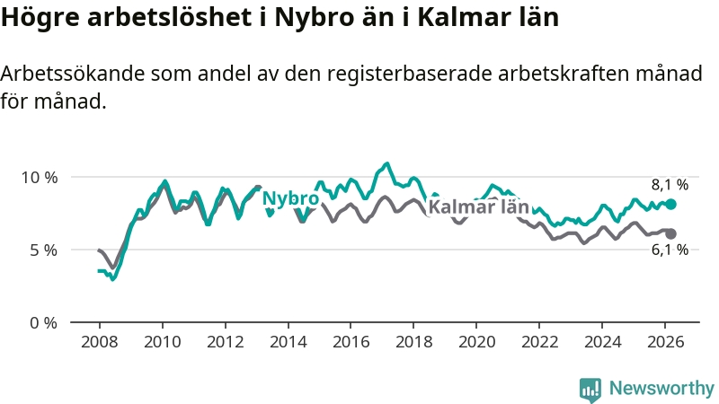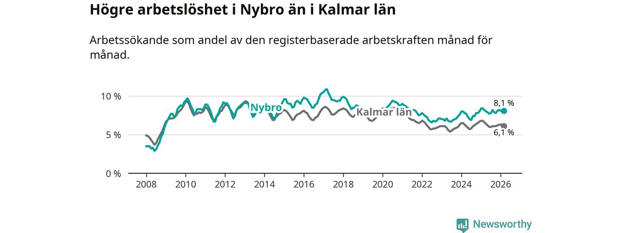 Under mars månad rapporterade Nybro kommun en total arbetslöshet på 8,1 procent. Det är en minskning jämfört med samma tidpunkt i fjol (−0,1 procentenheter). Även i Kalmar län sjunker arbetslösheten .