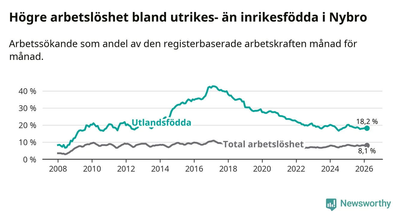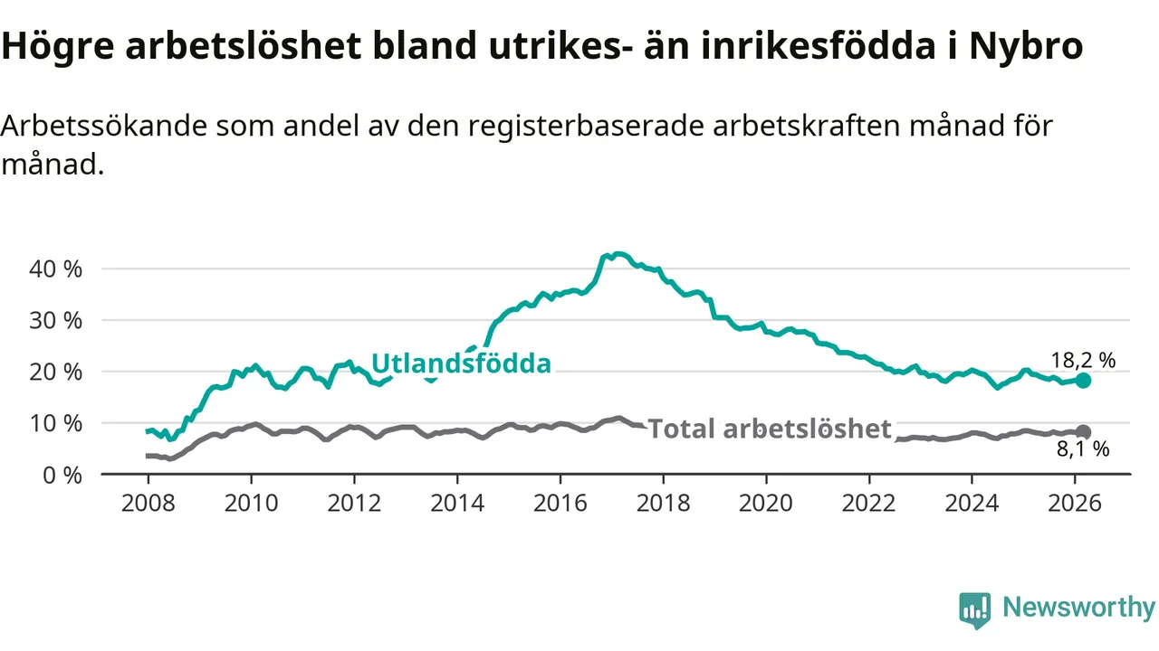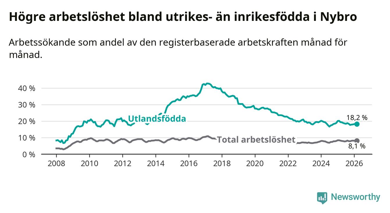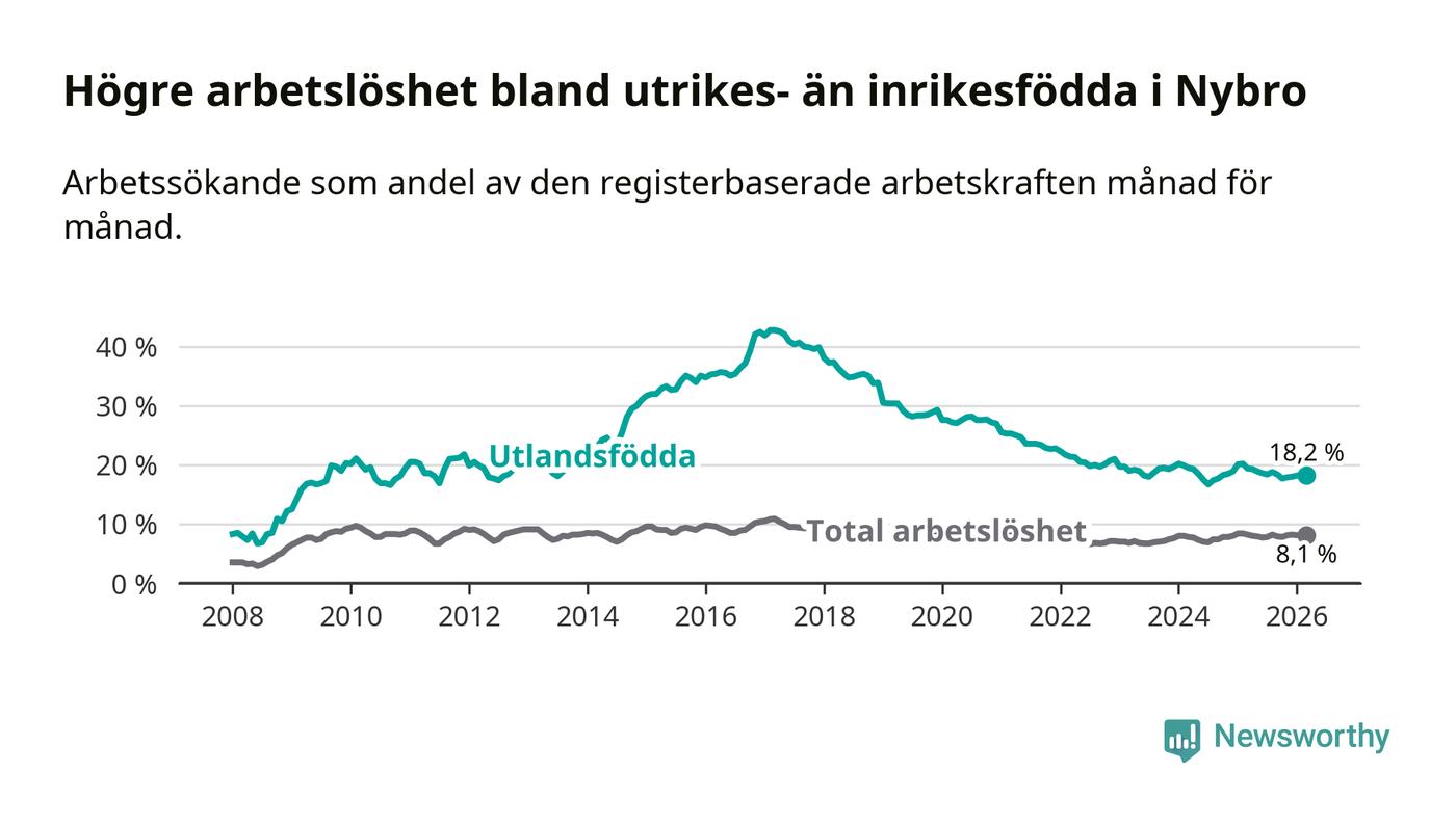 Skillnaden i arbetslöshet mellan utrikesfödda och hela befolkningen är 10,1 procentenheter i Nybro. Det är en mindre skillnad än för ett år sedan (−1,1 procentenheter).