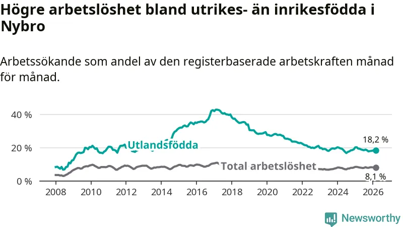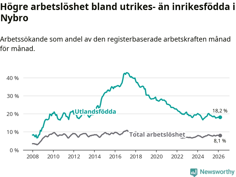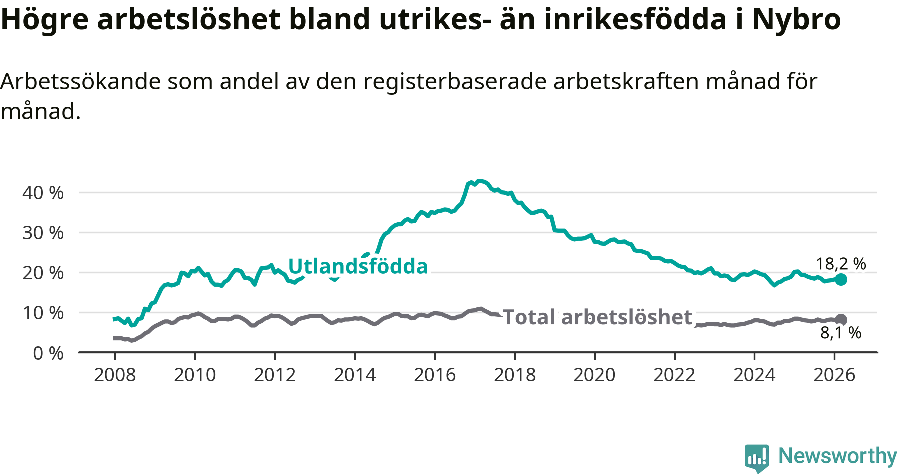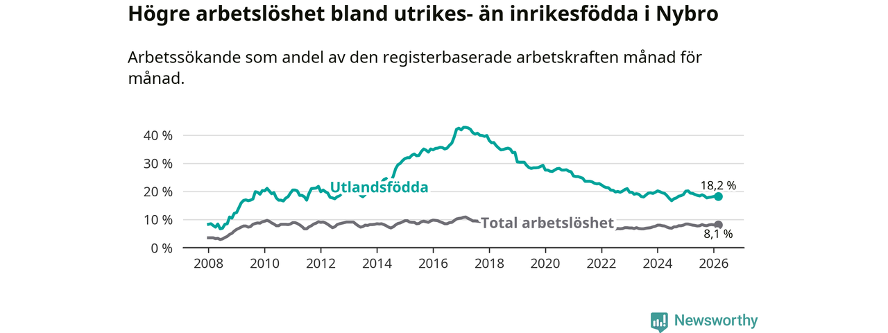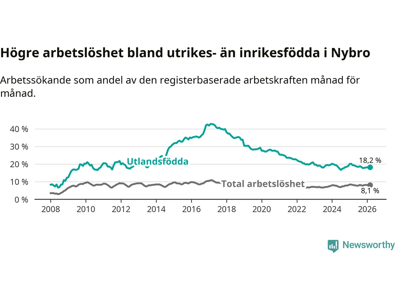 Skillnaden i arbetslöshet mellan utrikesfödda och hela befolkningen är 10,1 procentenheter i Nybro. Det är en mindre skillnad än för ett år sedan (−1,1 procentenheter).