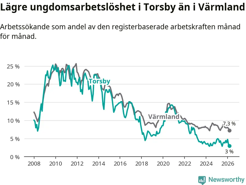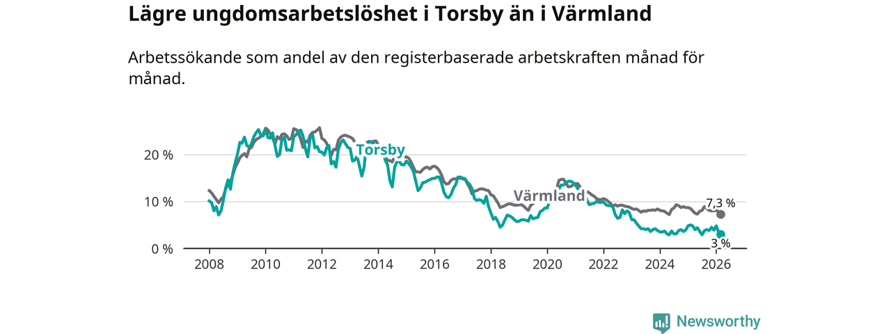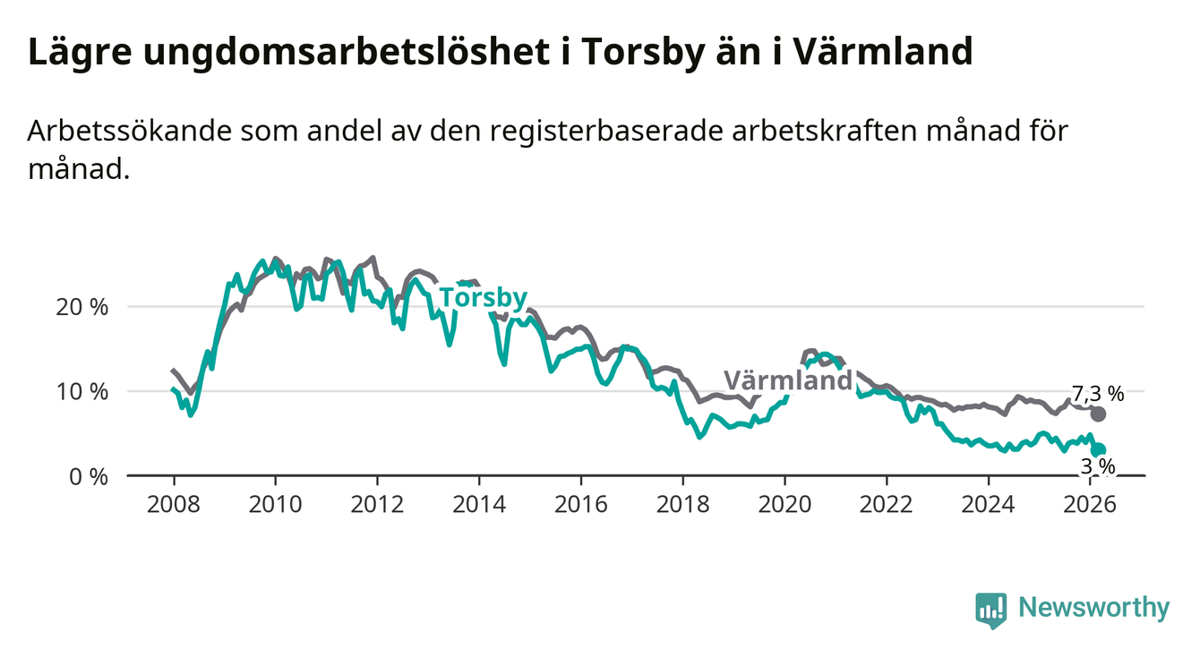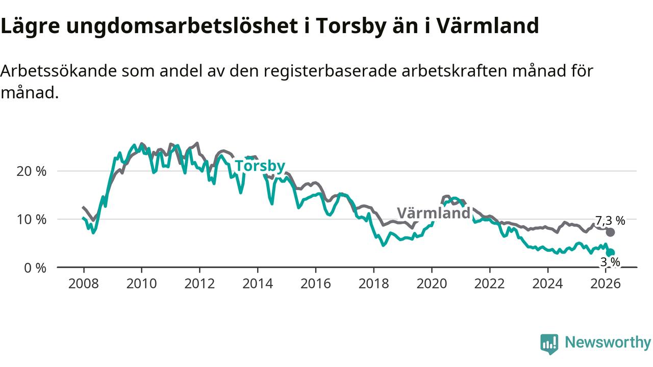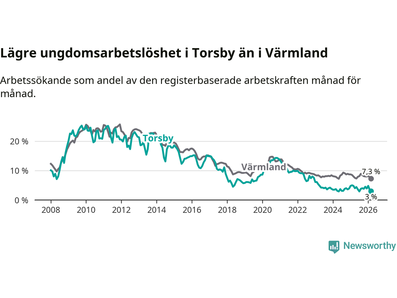 Precis som den totala arbetslösheten ligger ungdomsarbetslösheten i Torsby lägre än i Värmland som helhet. Skillnaden mellan kommunen och länet är 4,3 procentenheter.