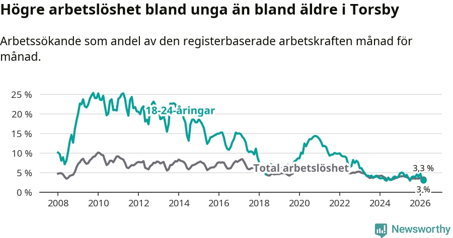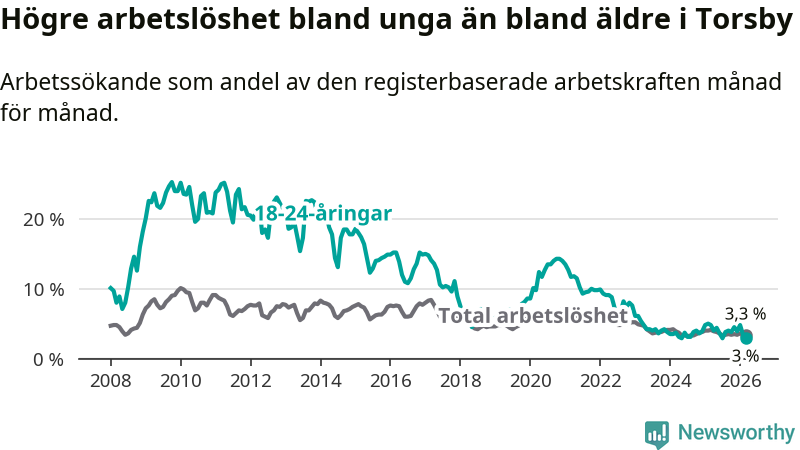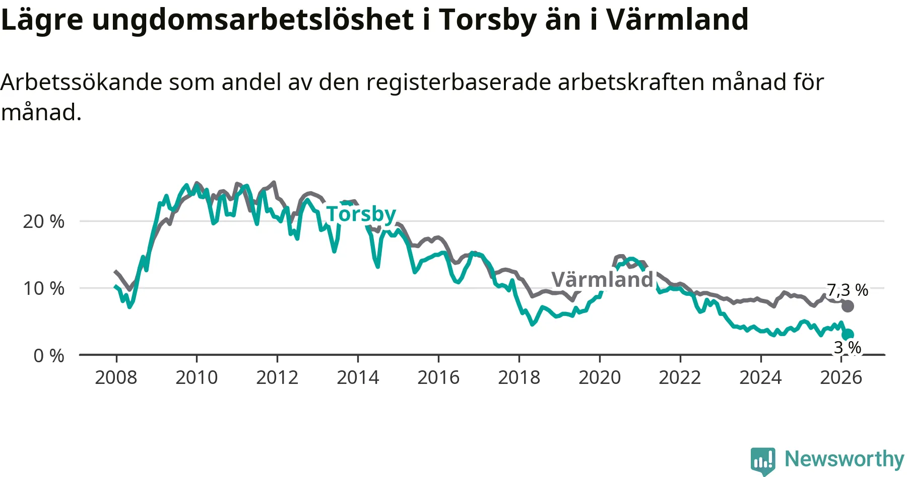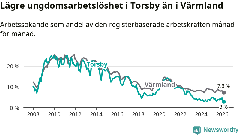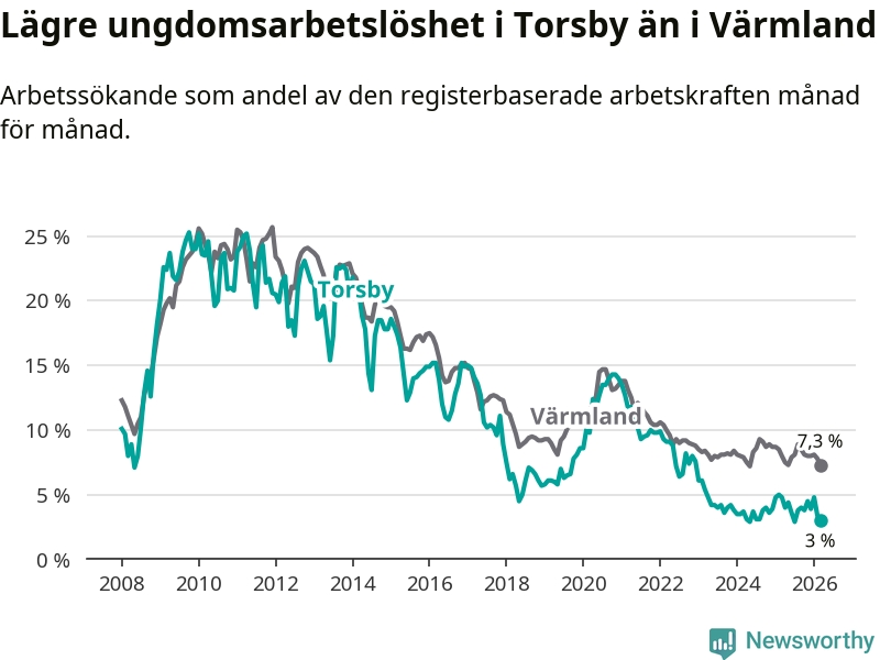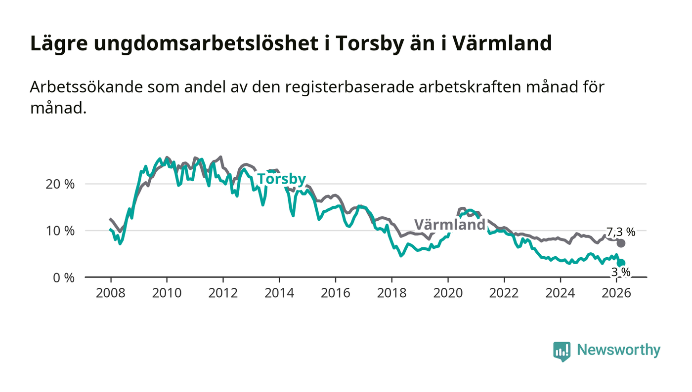 Precis som den totala arbetslösheten ligger ungdomsarbetslösheten i Torsby lägre än i Värmland som helhet. Skillnaden mellan kommunen och länet är 4,3 procentenheter.