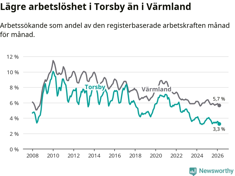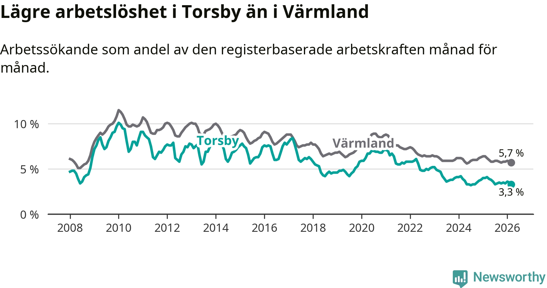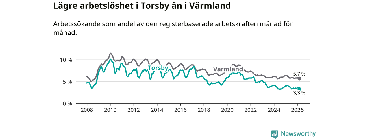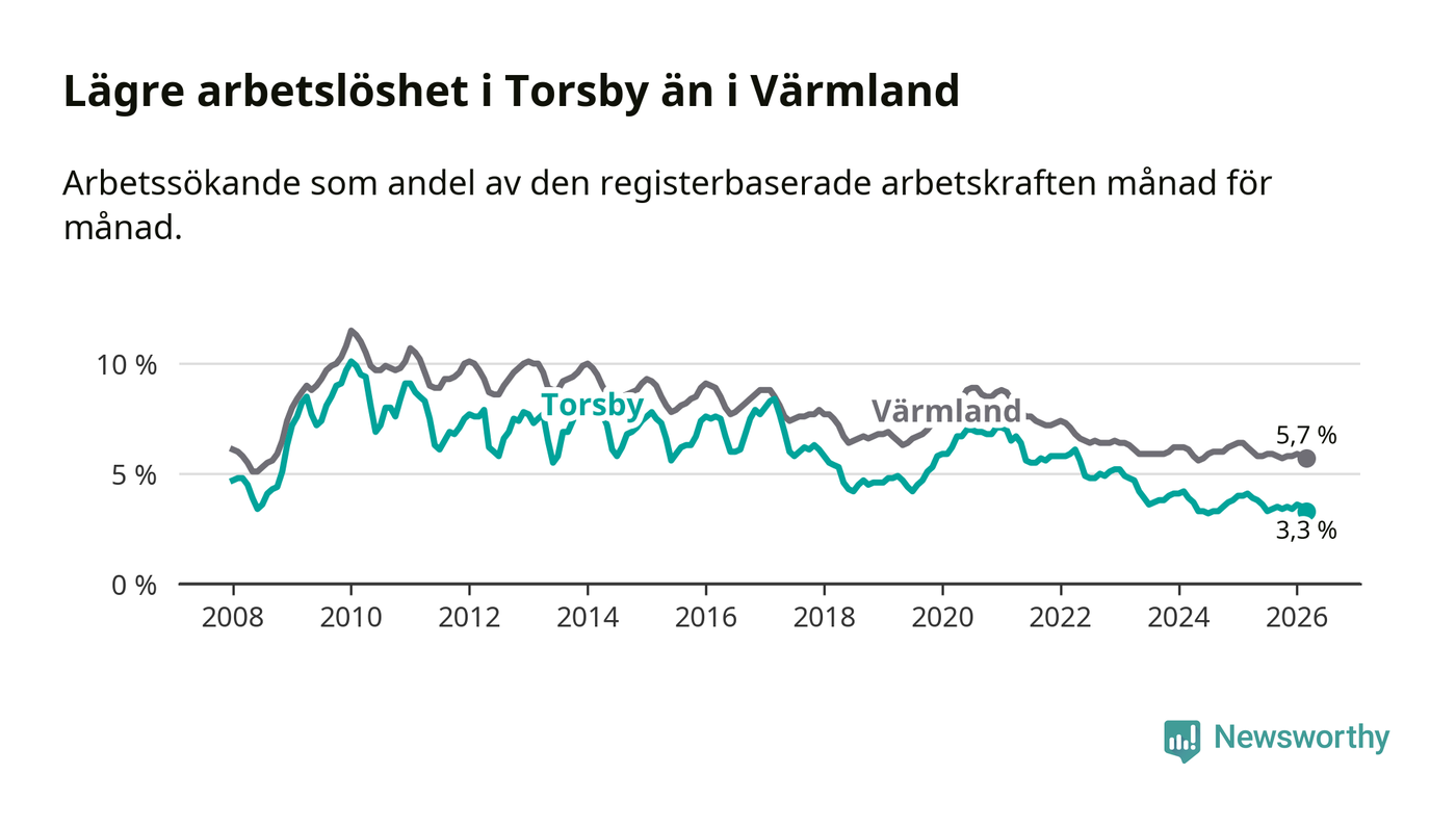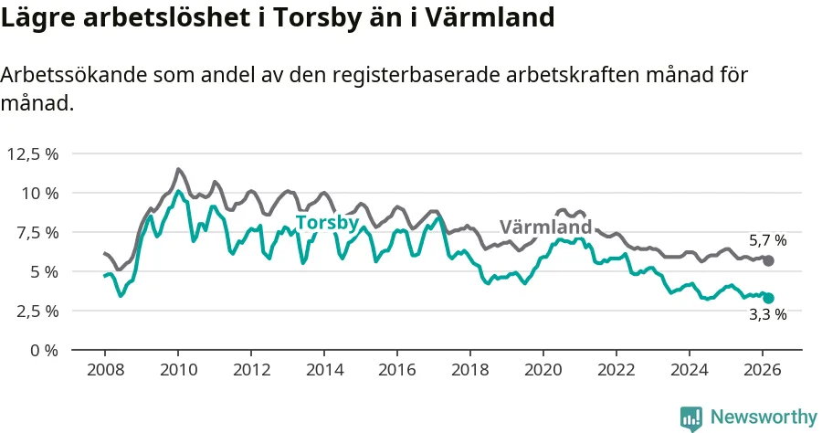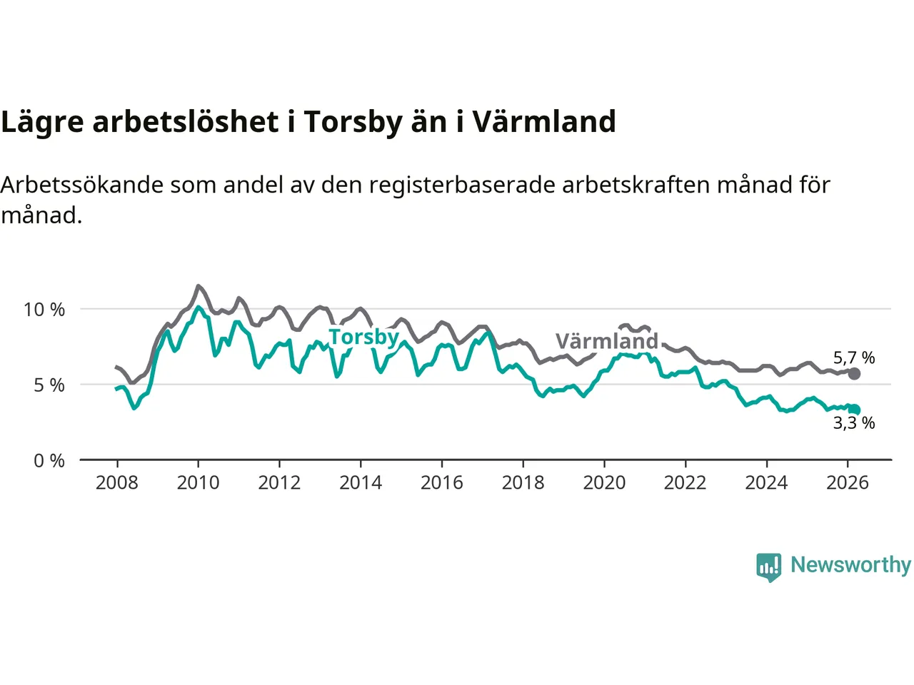 Under mars månad rapporterade Torsby kommun en total arbetslöshet på 3,3 procent. Det är en minskning jämfört med samma tidpunkt i fjol (−0,8 procentenheter). Även i Värmlands län sjunker arbetslösheten .