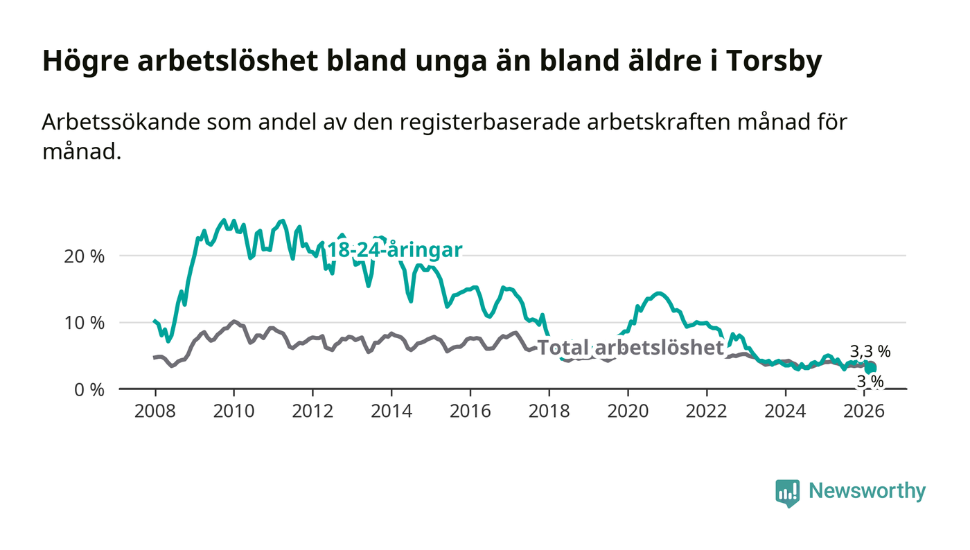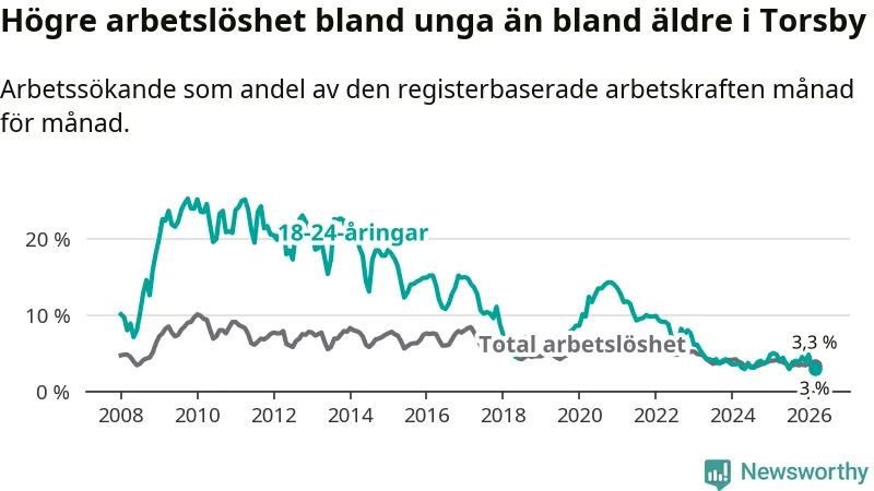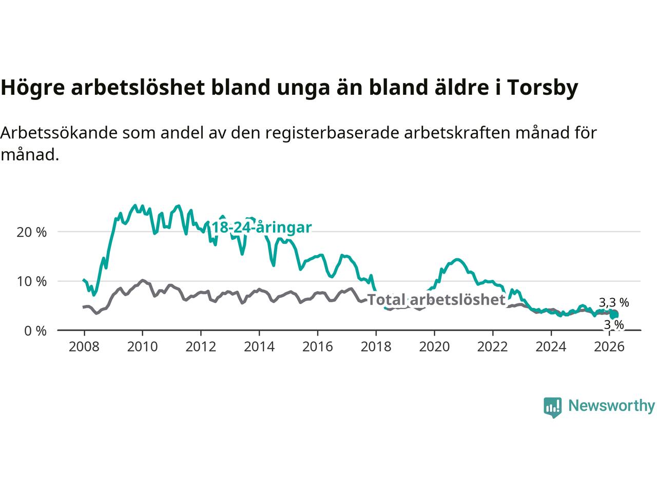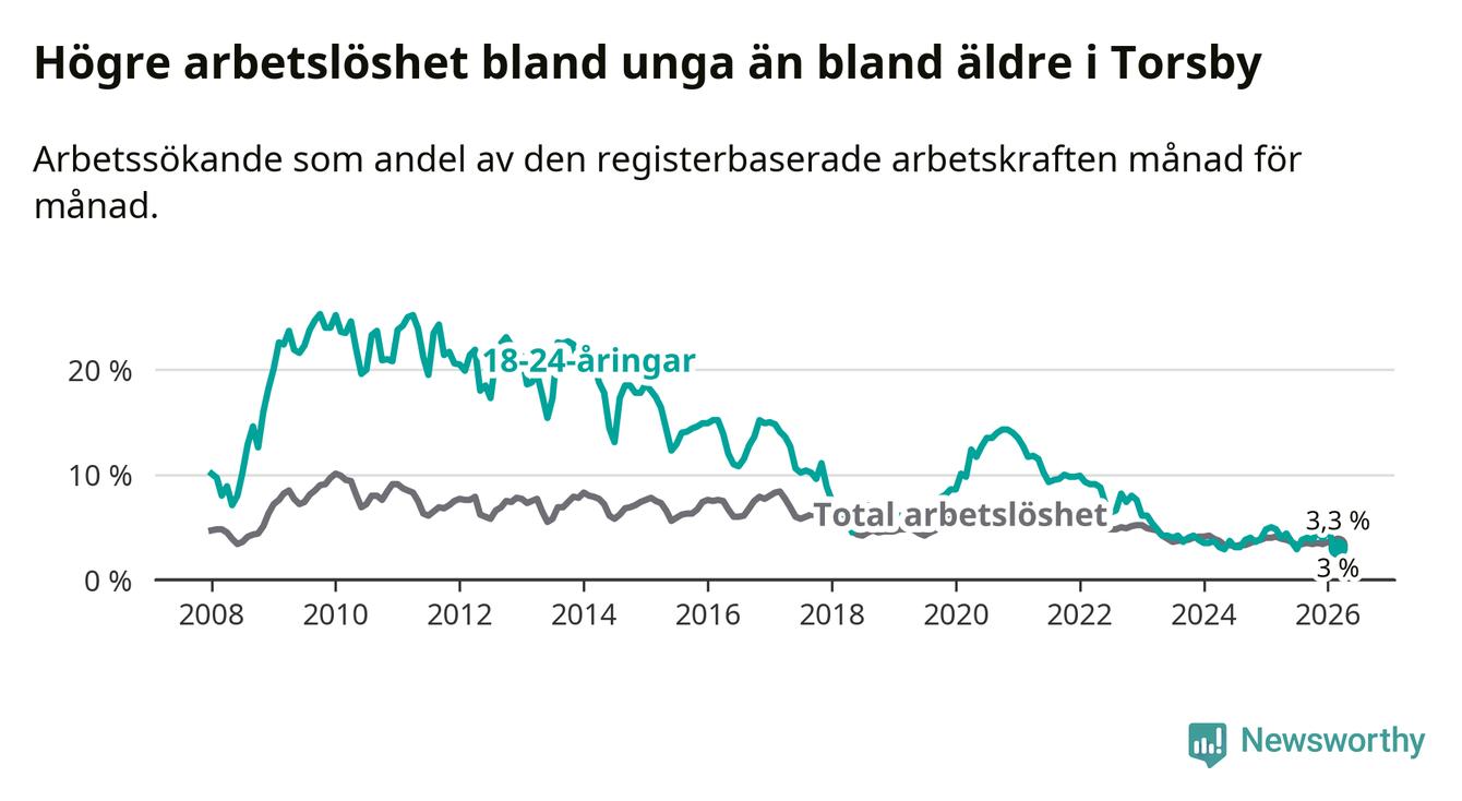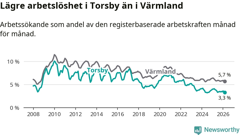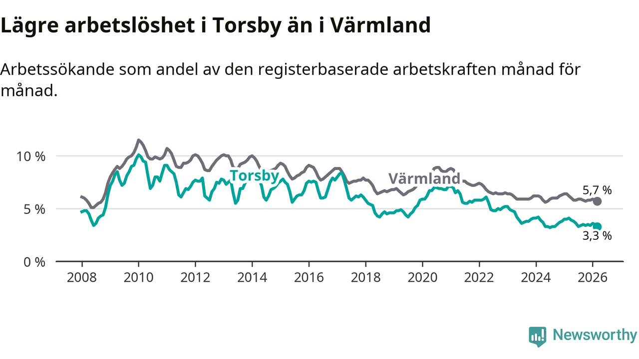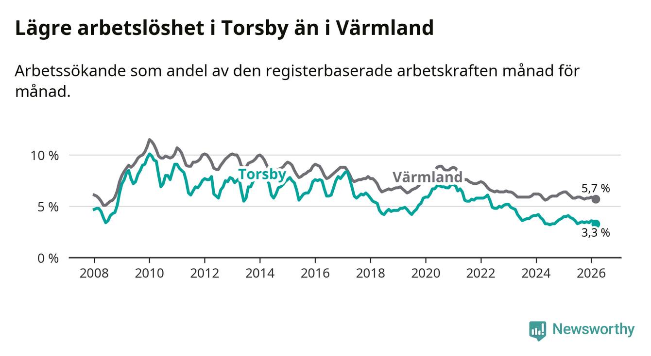 Under mars månad rapporterade Torsby kommun en total arbetslöshet på 3,3 procent. Det är en minskning jämfört med samma tidpunkt i fjol (−0,8 procentenheter). Även i Värmlands län sjunker arbetslösheten .
