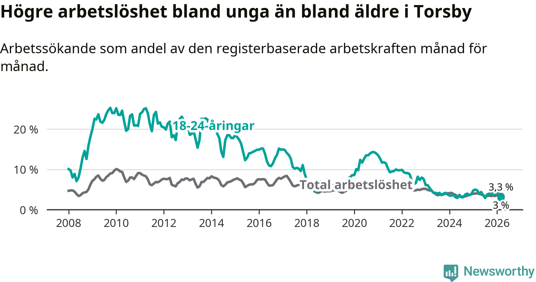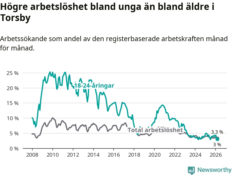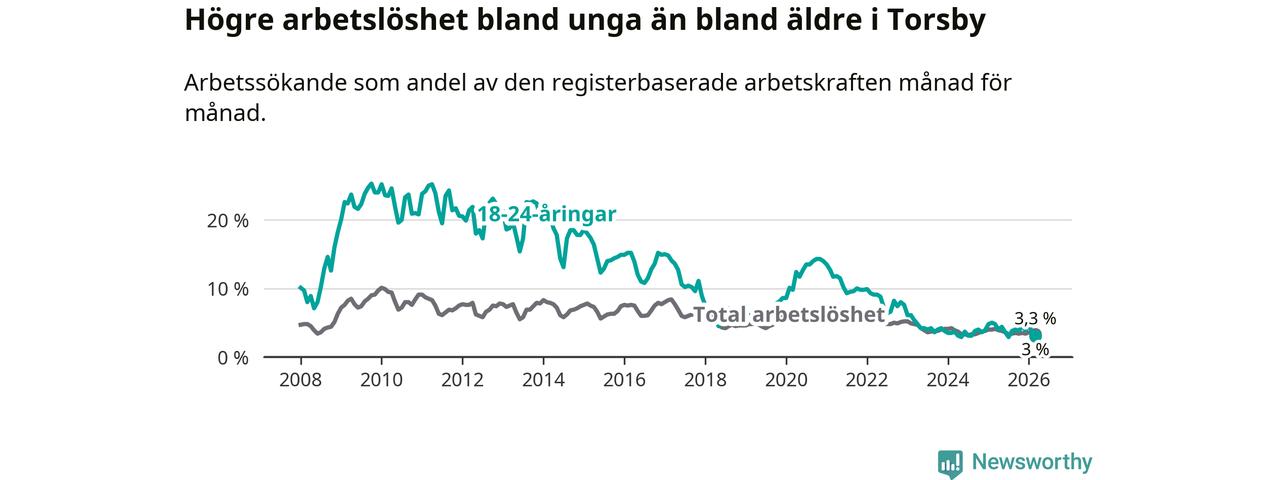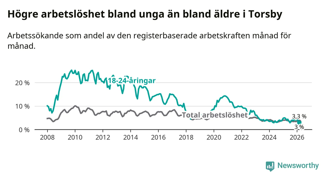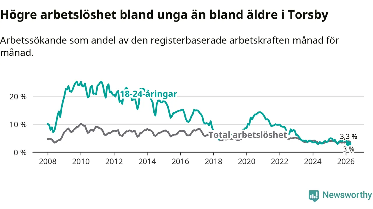 Graf: Arbetslöshet bland unga i Torsby kommun och Värmlands län