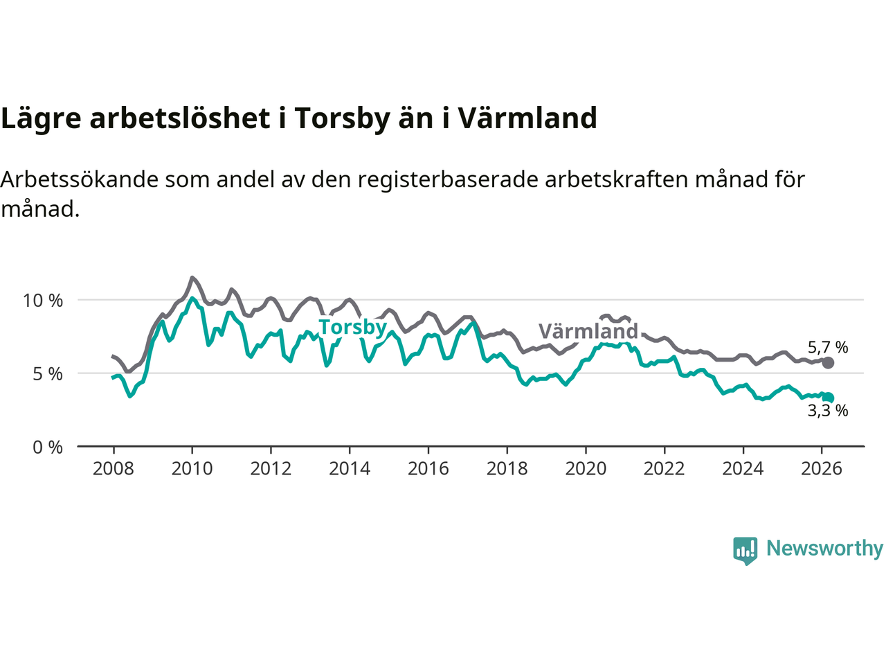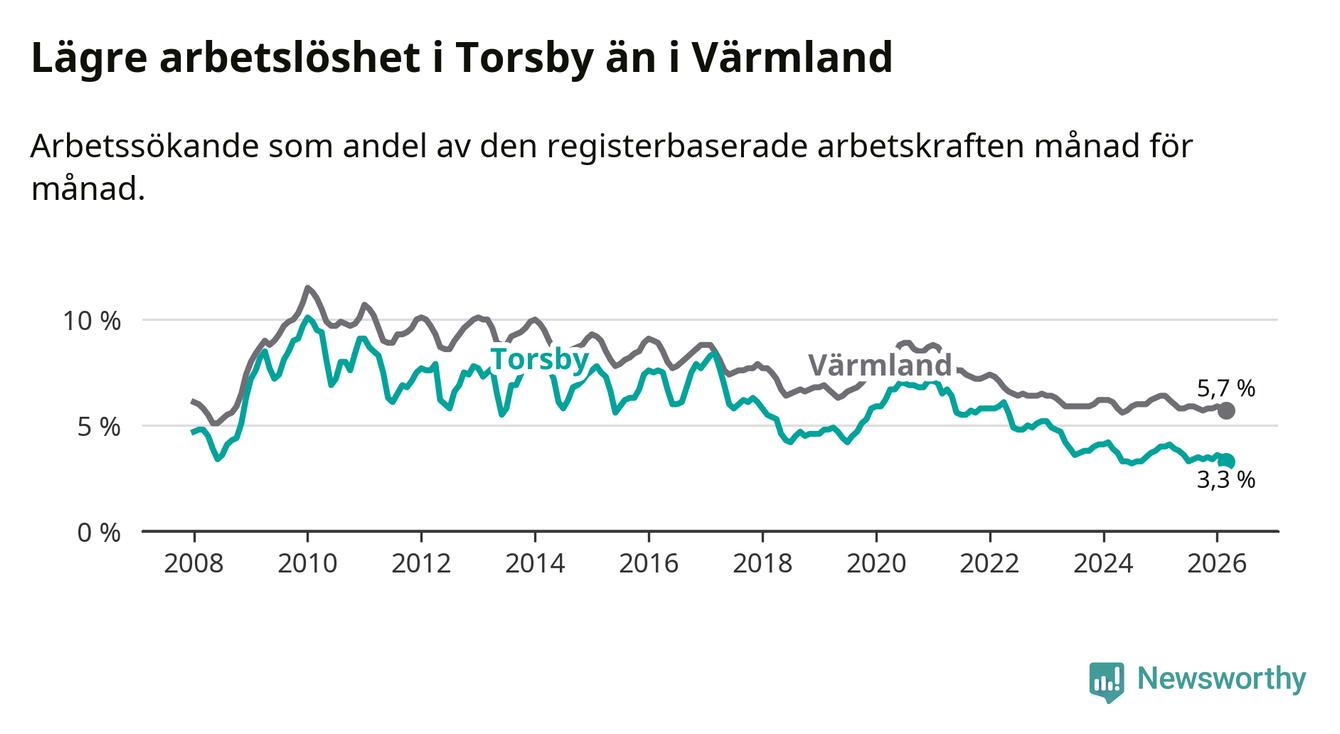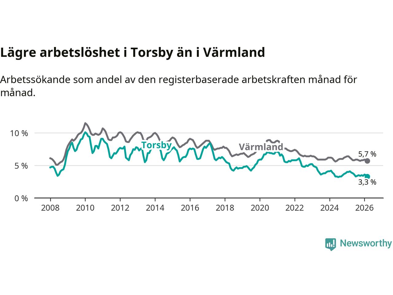 Torsby hade redan tidigare lägre arbetslöshet än snittet i hela Värmlands län och nu växer klyftan (3,3 procent i kommunen, jämfört med 5,7 procent i hela länet). Torsby har därmed även den lägsta arbetslöshetsnivån i länet. Filipstad har den högsta (8,4 procent).