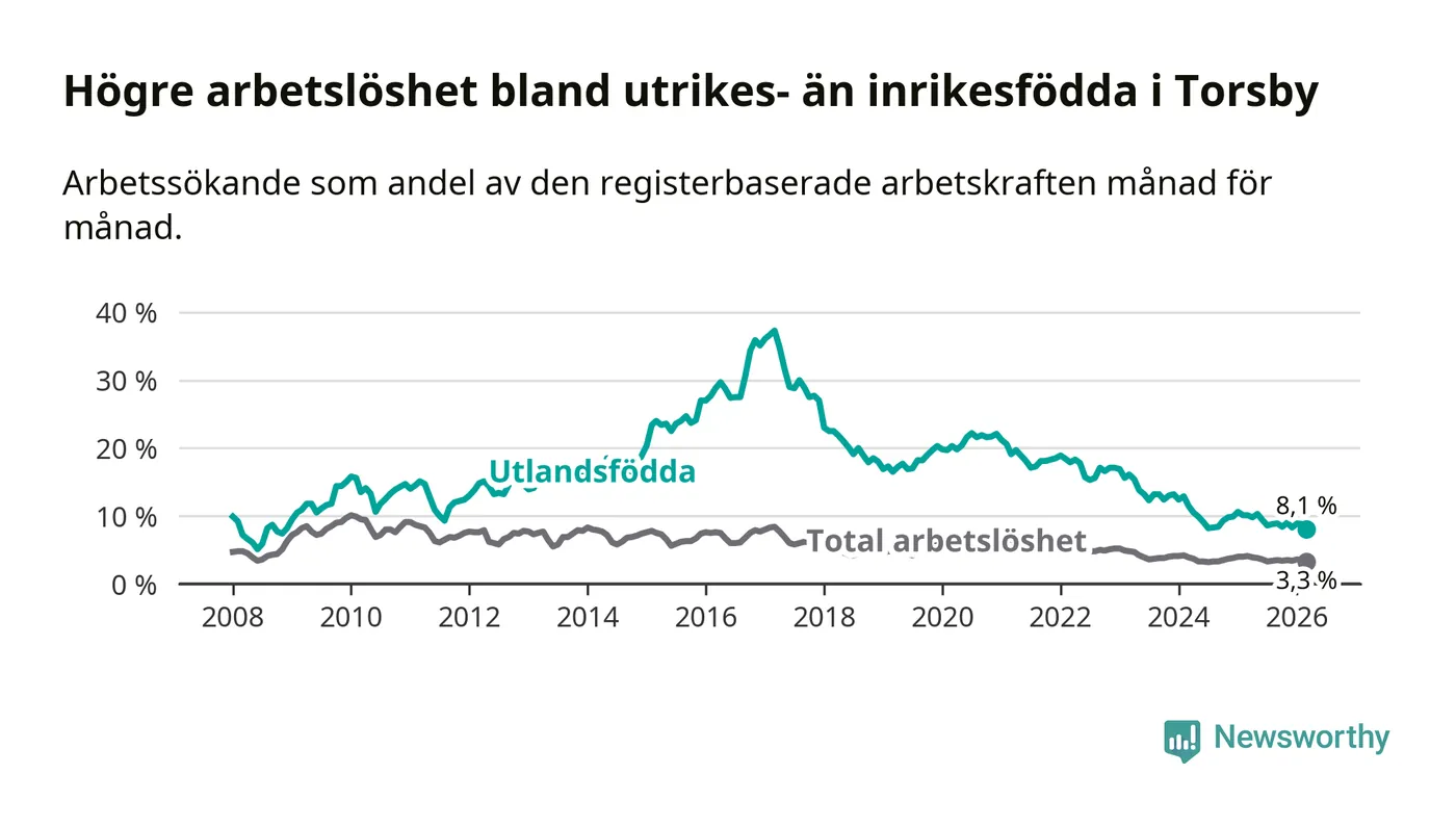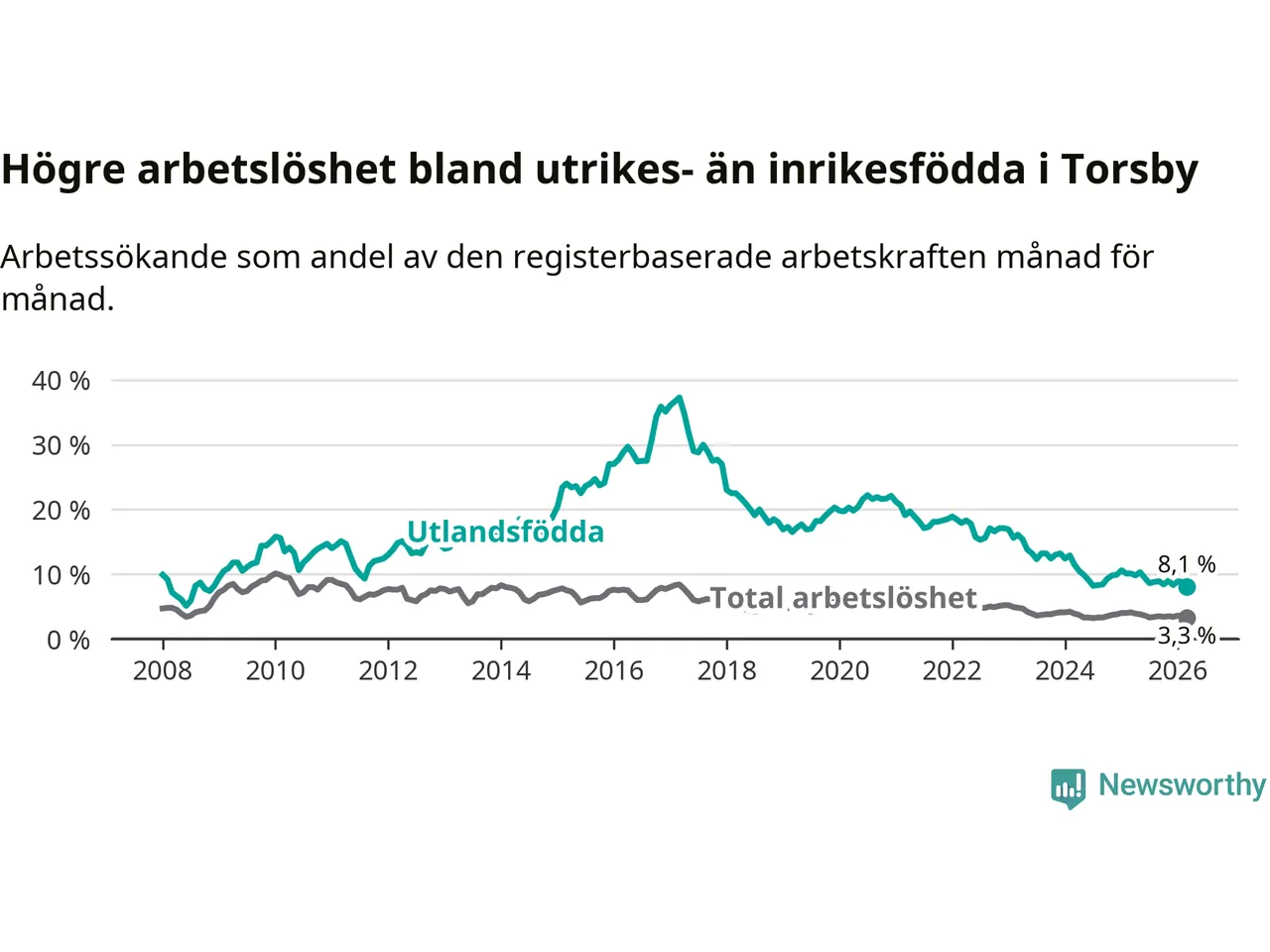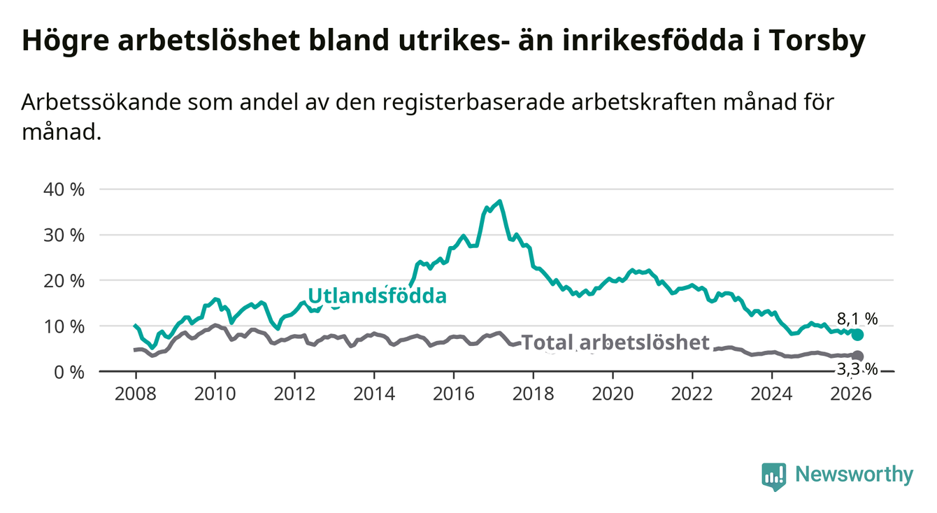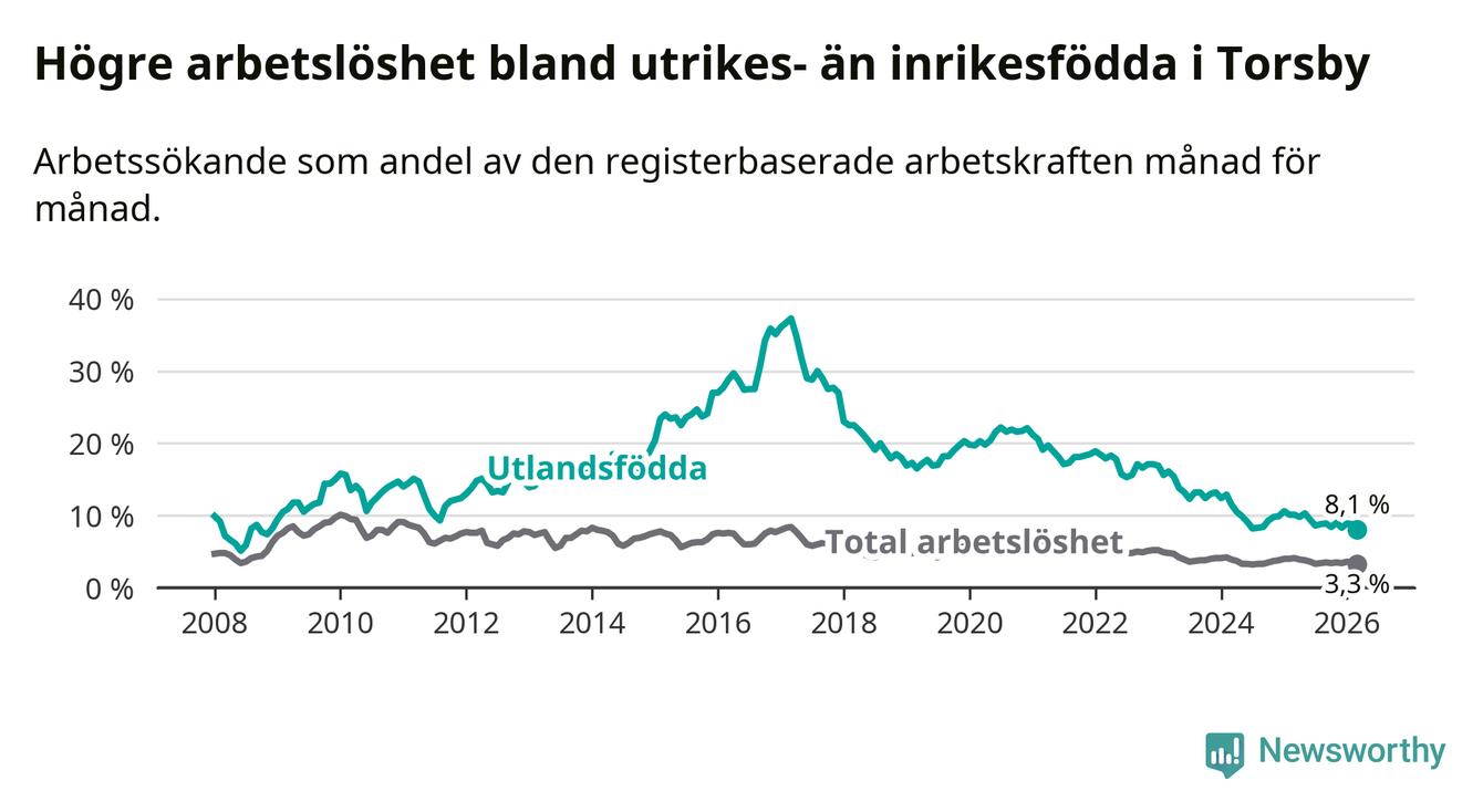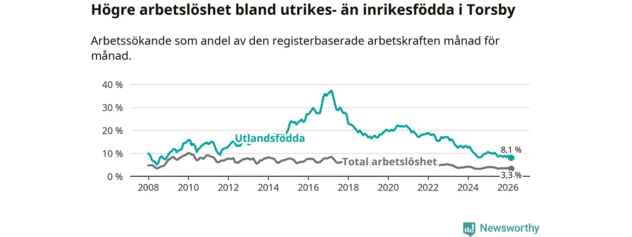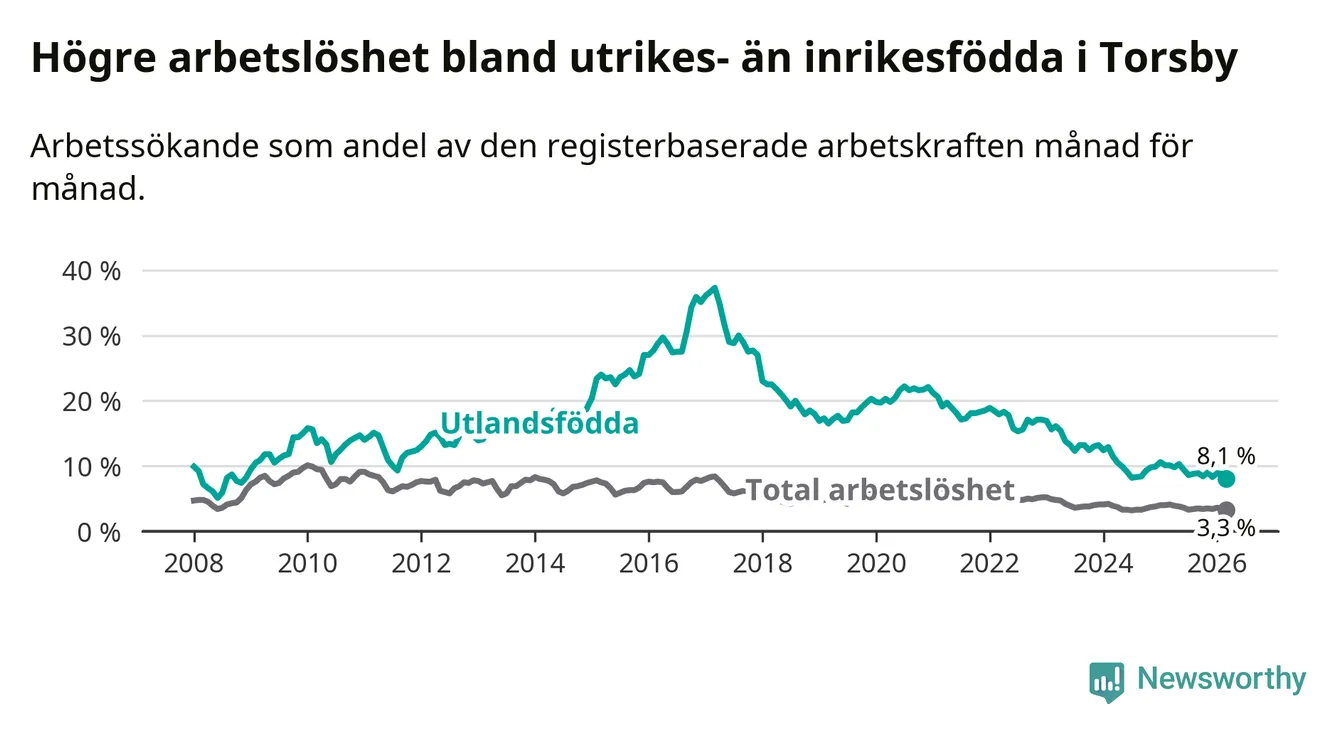 Skillnaden i arbetslöshet mellan utrikesfödda och hela befolkningen är 4,8 procentenheter i Torsby. Det är en mindre skillnad än för ett år sedan (−1,2 procentenheter).