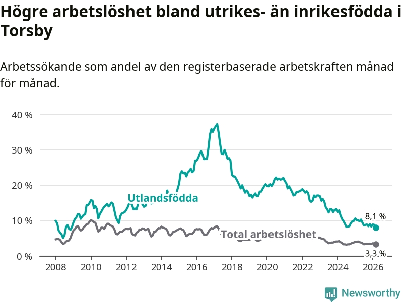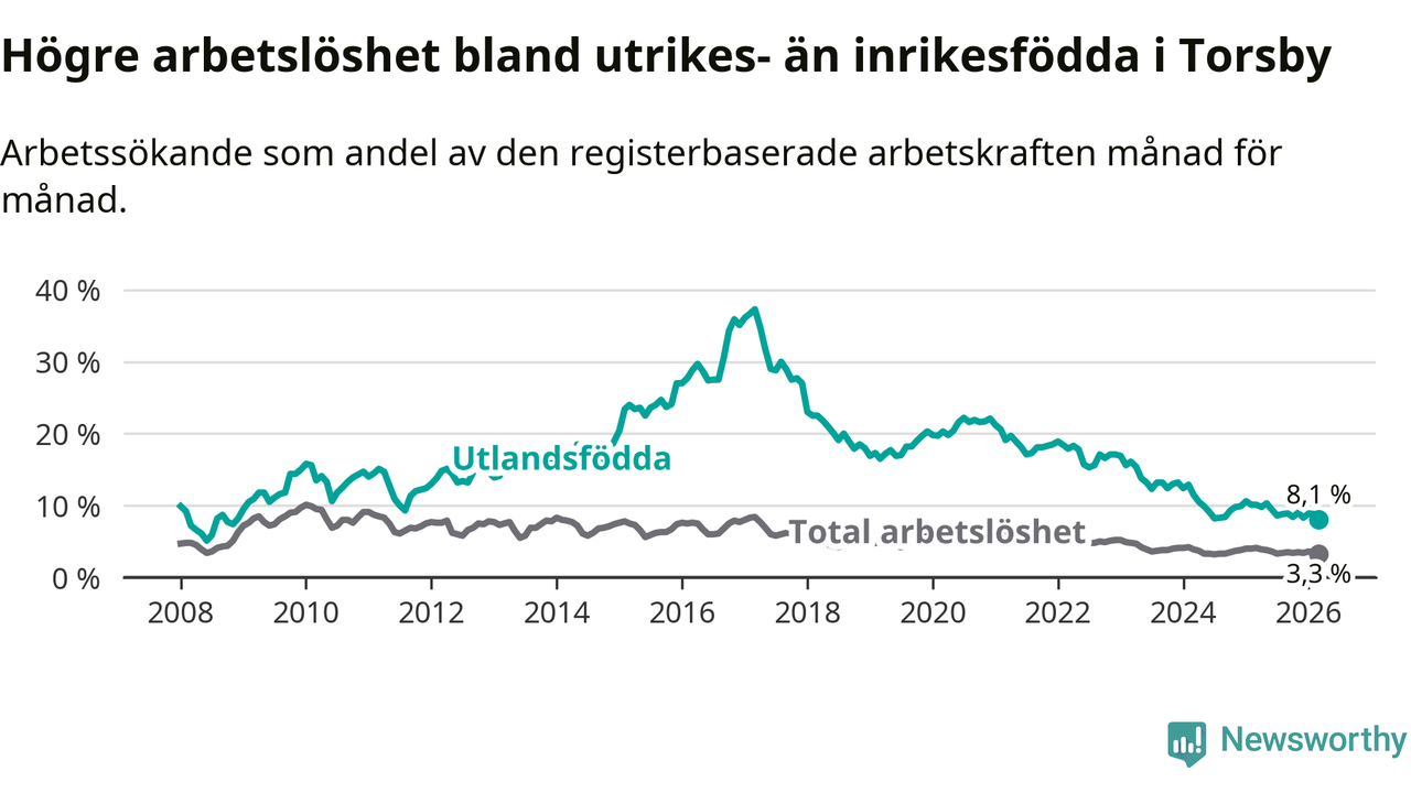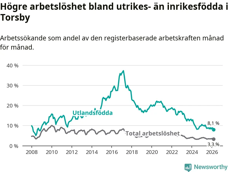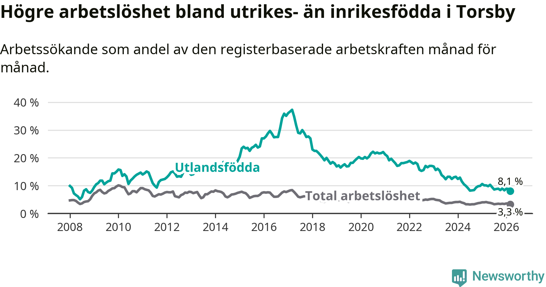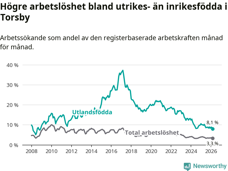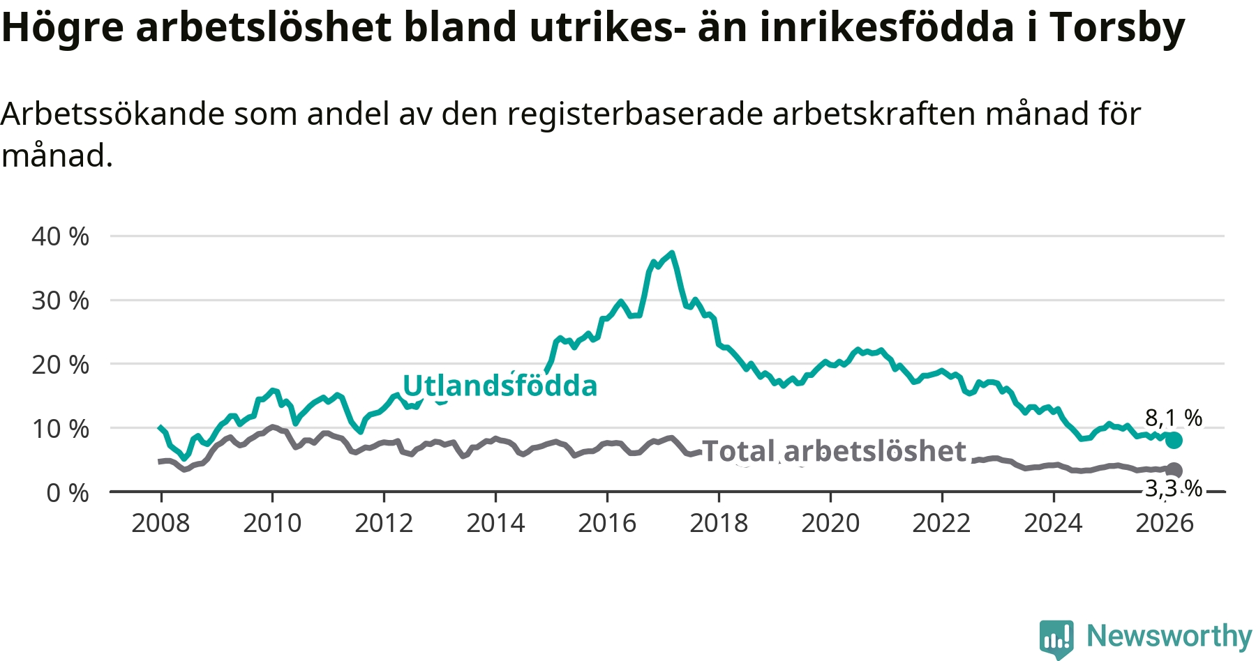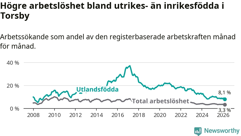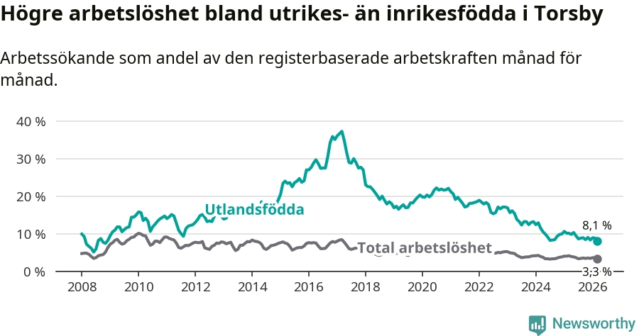 Skillnaden i arbetslöshet mellan utrikesfödda och hela befolkningen är 4,8 procentenheter i Torsby. Det är en mindre skillnad än för ett år sedan (−1,2 procentenheter).