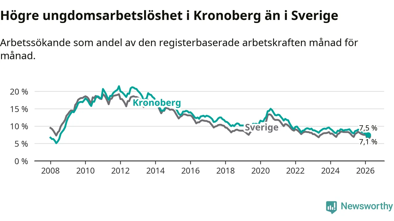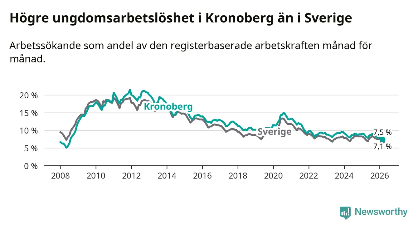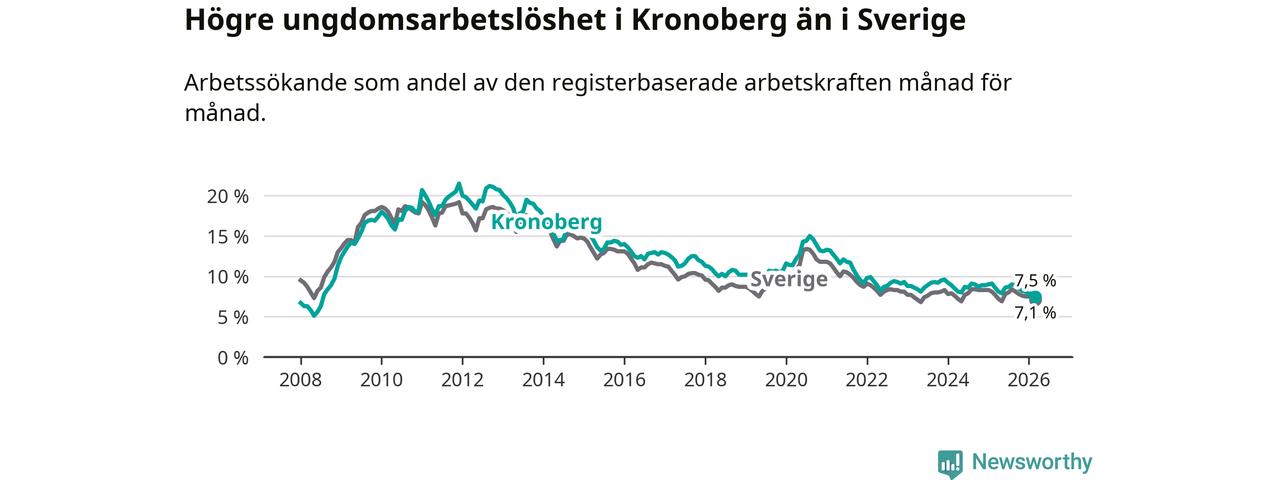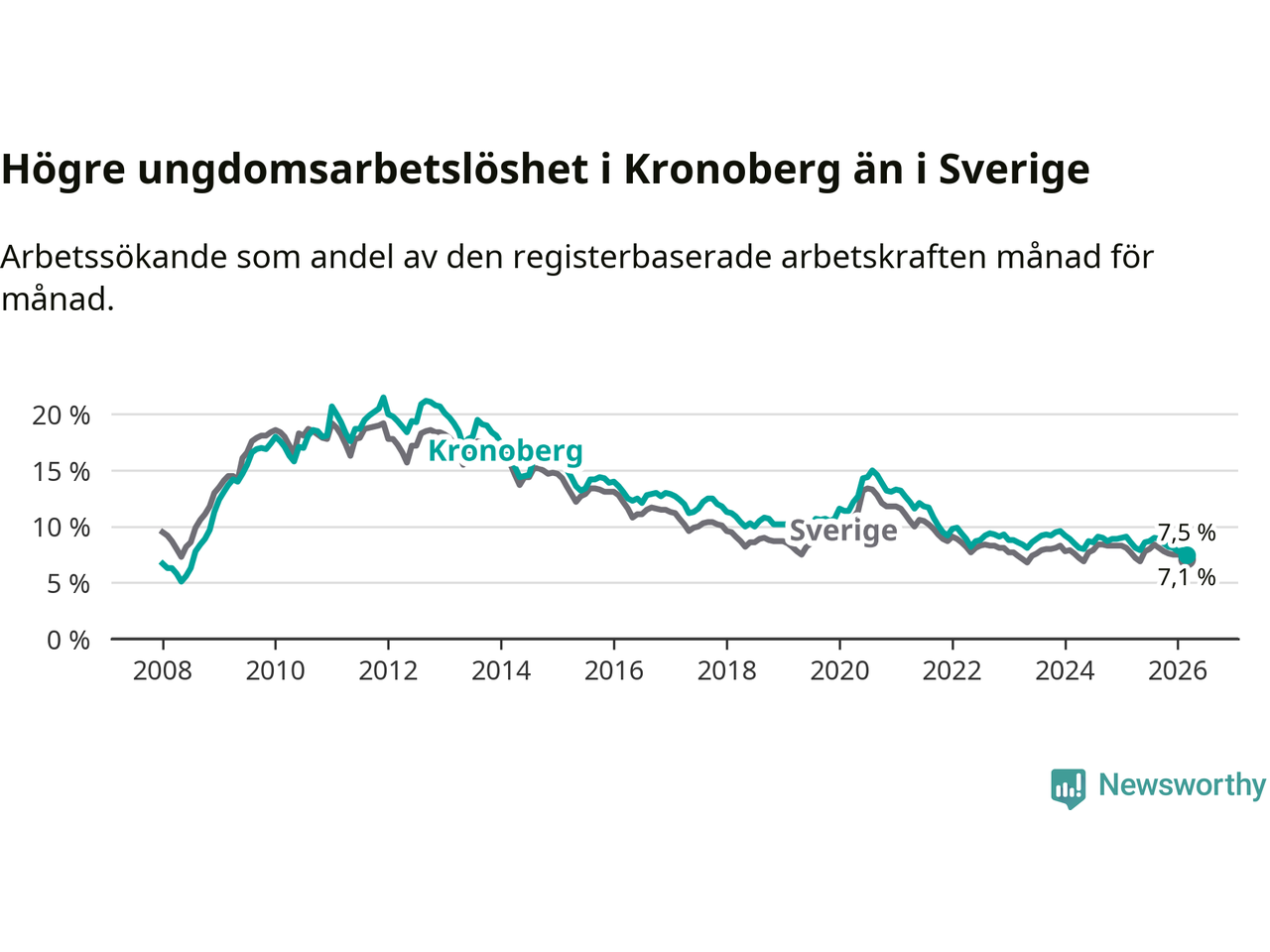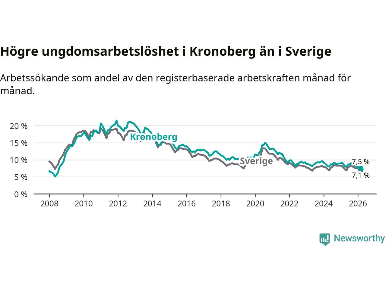 Medan Kronoberg har ungefär samma total arbetslöshet som Sverige, ligger ungdomsarbetslösheten 0,4 procentenheter högre i Kronoberg.