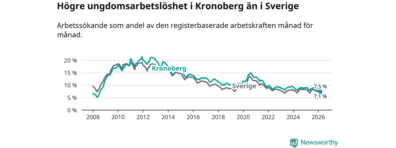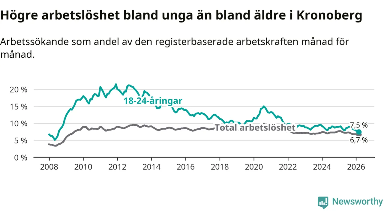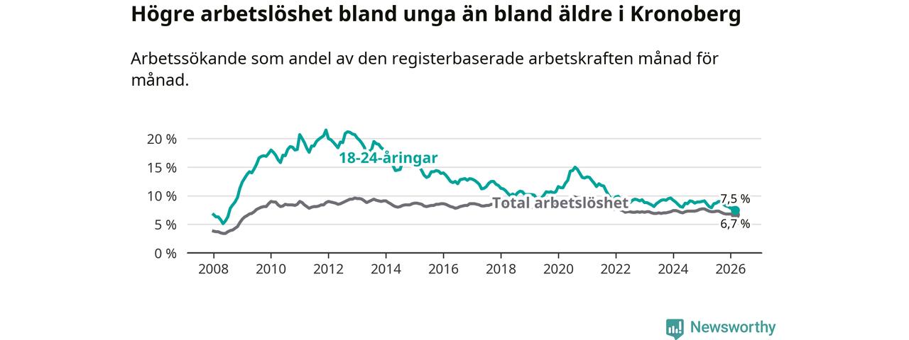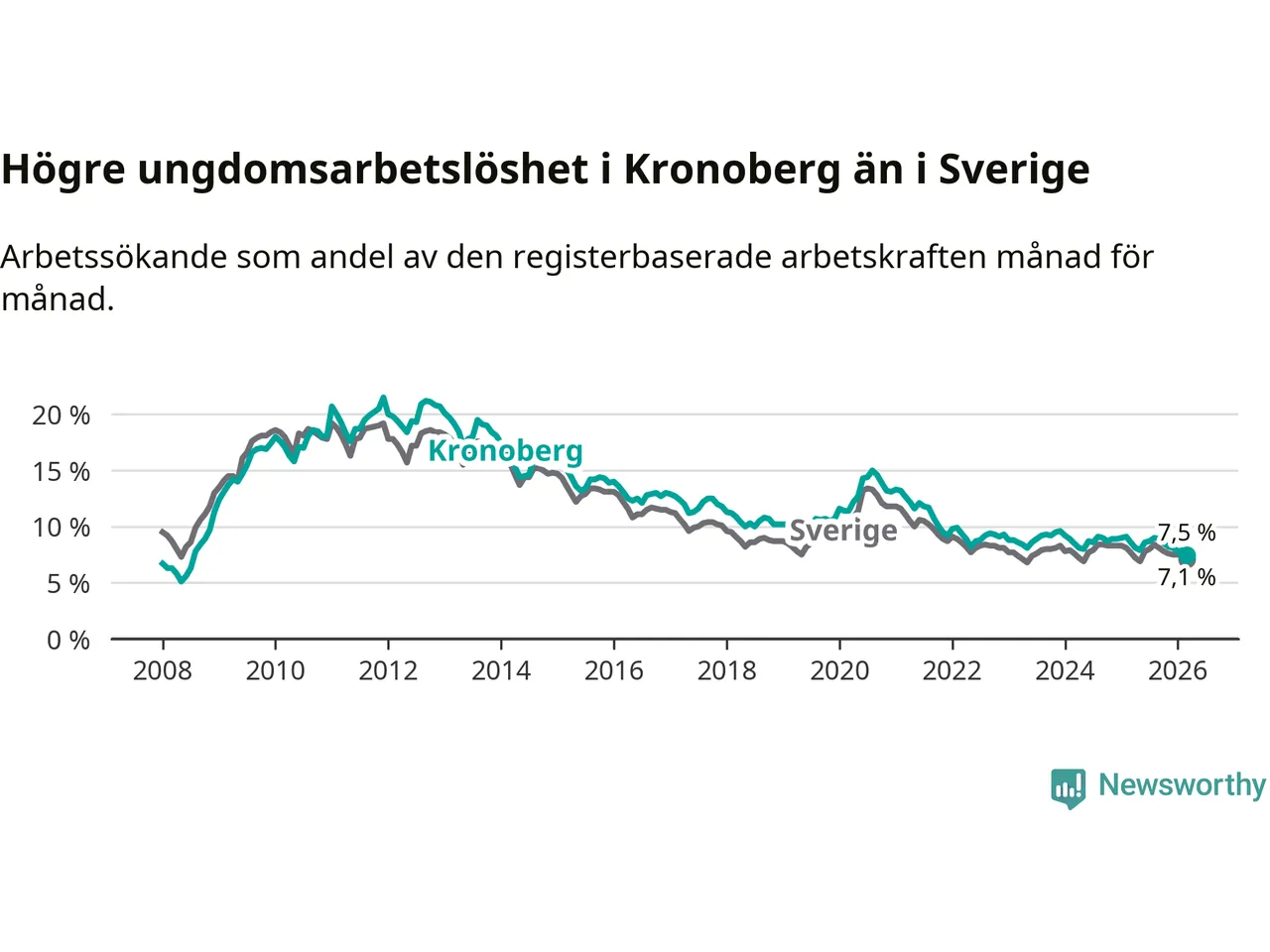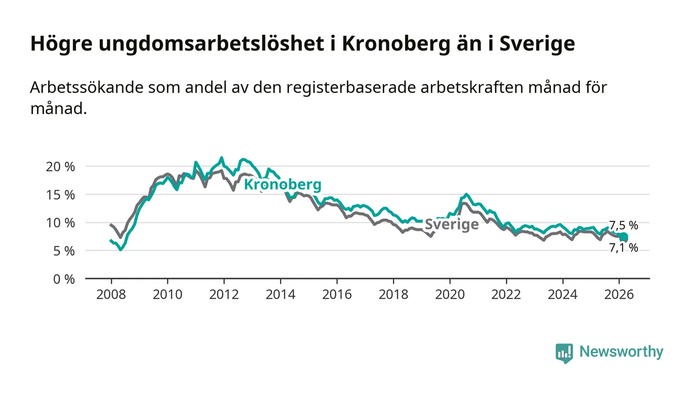 Medan Kronoberg har ungefär samma total arbetslöshet som Sverige, ligger ungdomsarbetslösheten 0,4 procentenheter högre i Kronoberg.