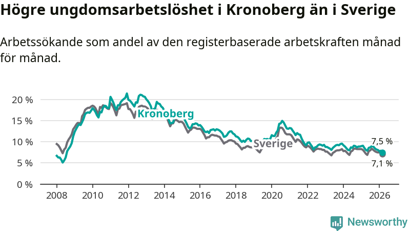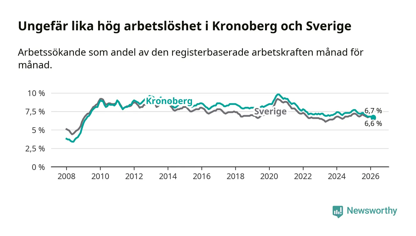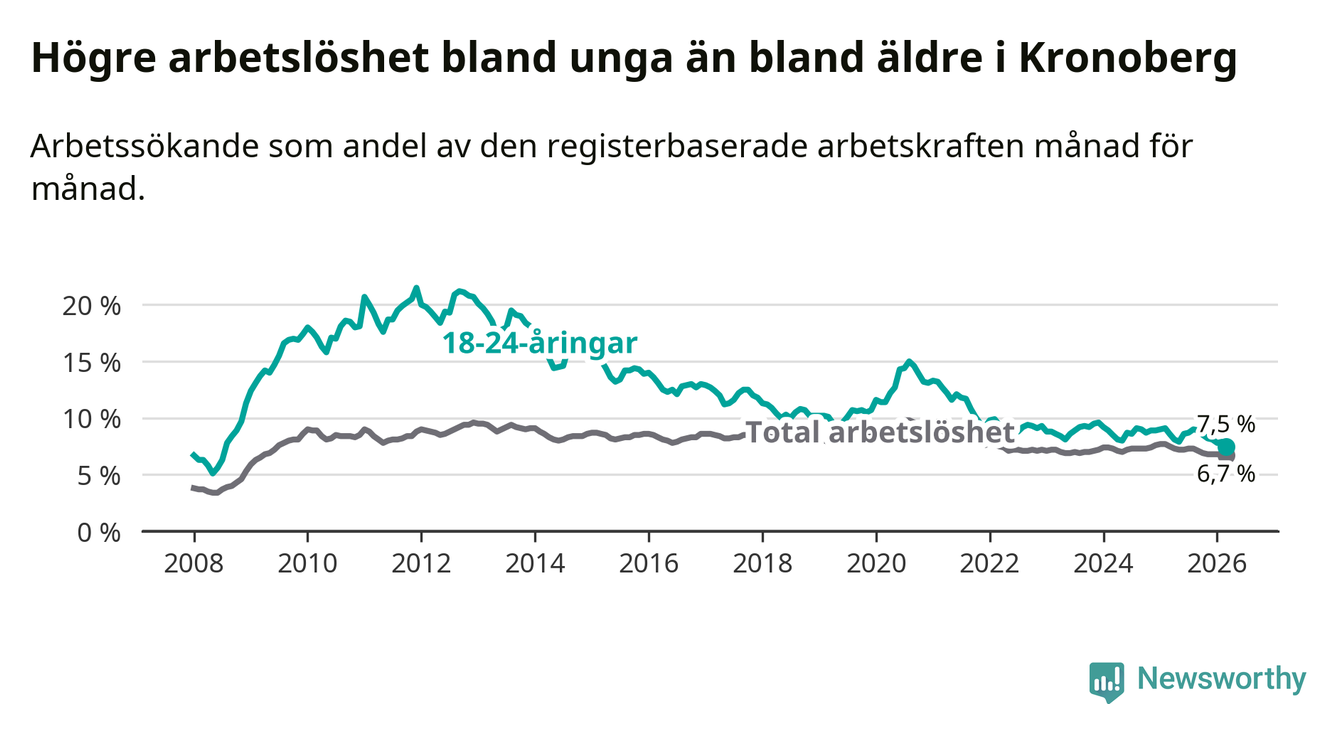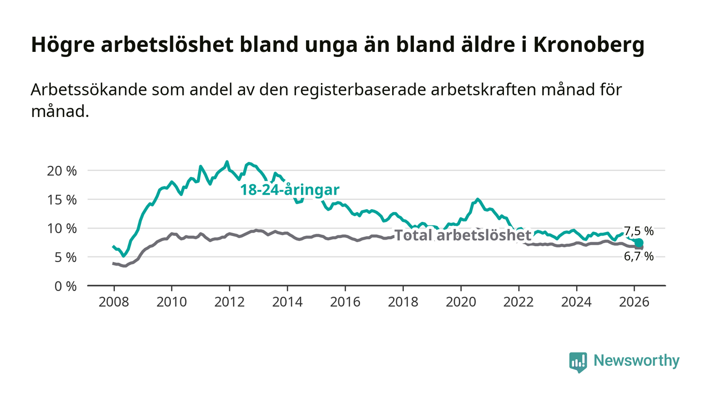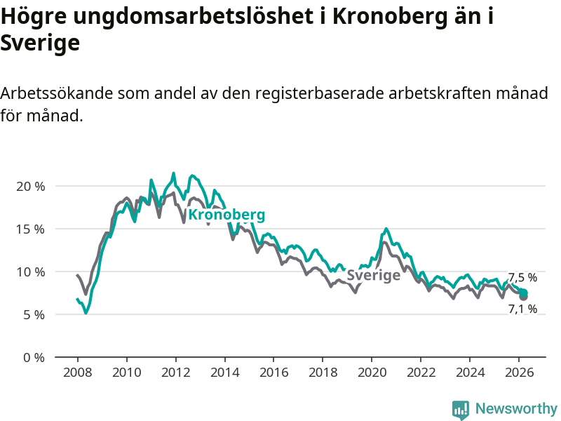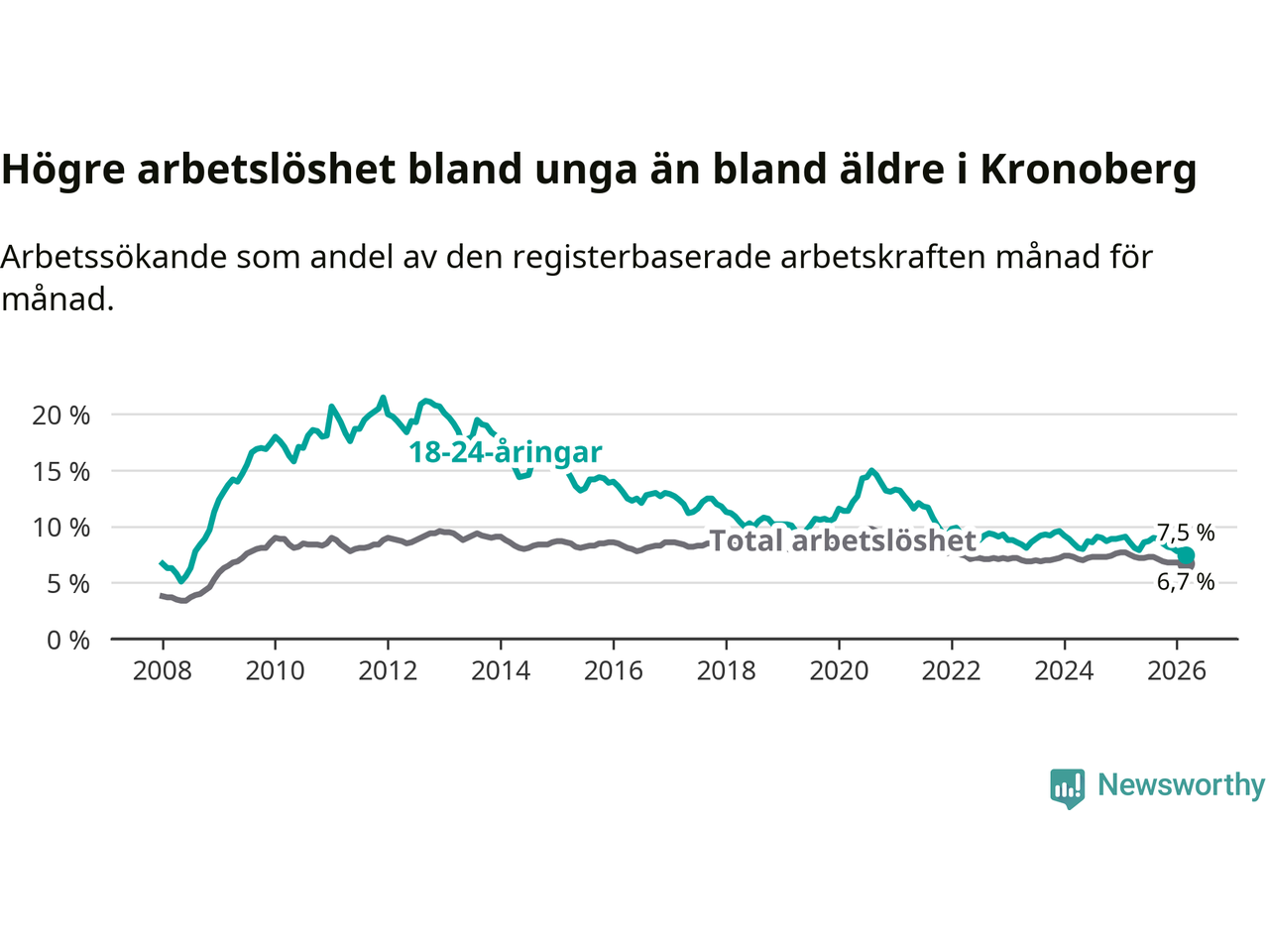 Medan Kronoberg har ungefär samma total arbetslöshet som Sverige, ligger ungdomsarbetslösheten 0,4 procentenheter högre i Kronoberg.